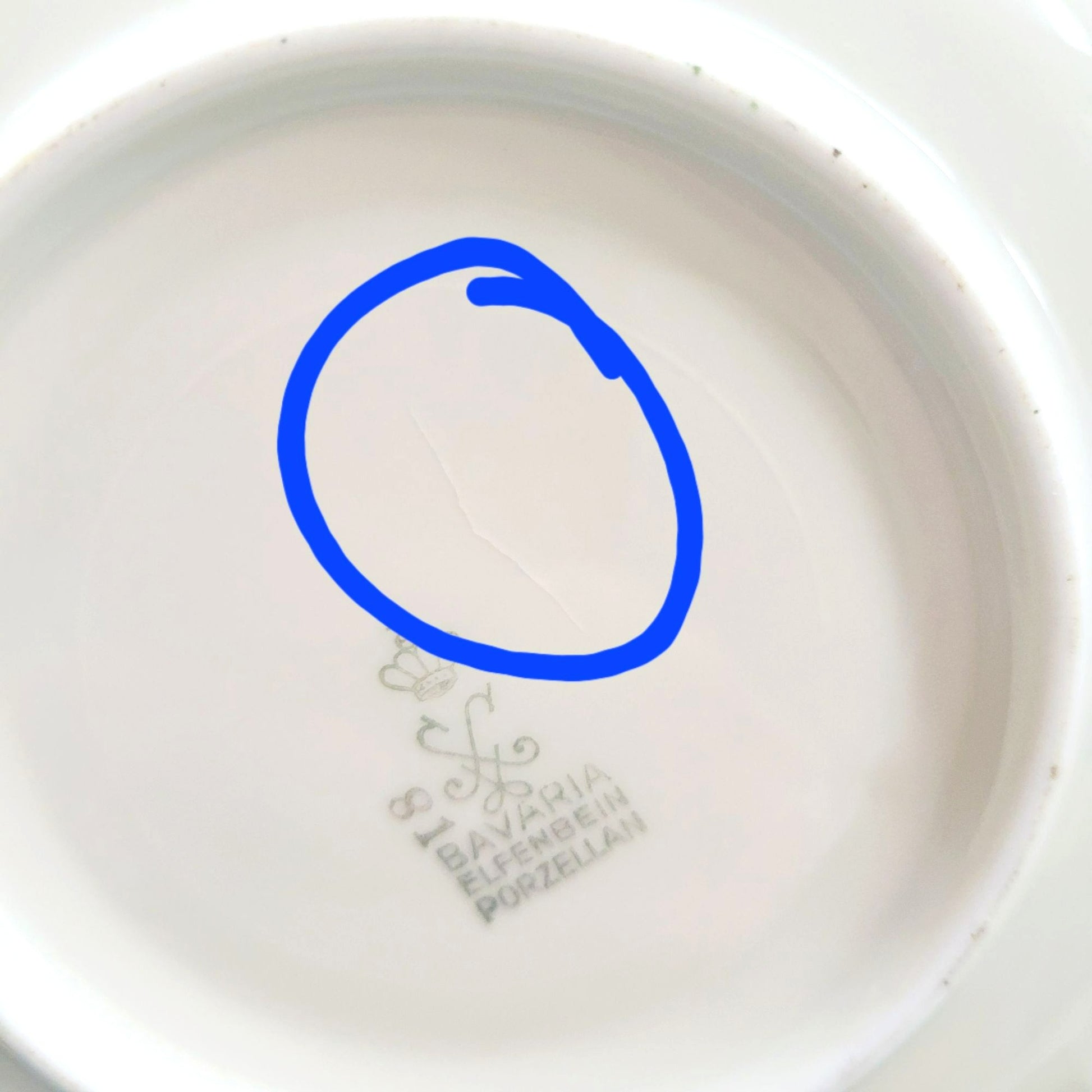 Teacup has no cracks, chips or crazing. Saucer has one CRAZING line on the bottom side (see pic), no chips or cracks.