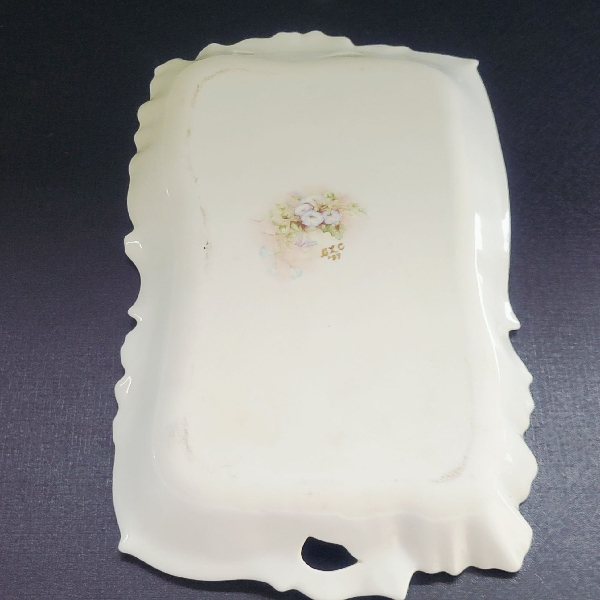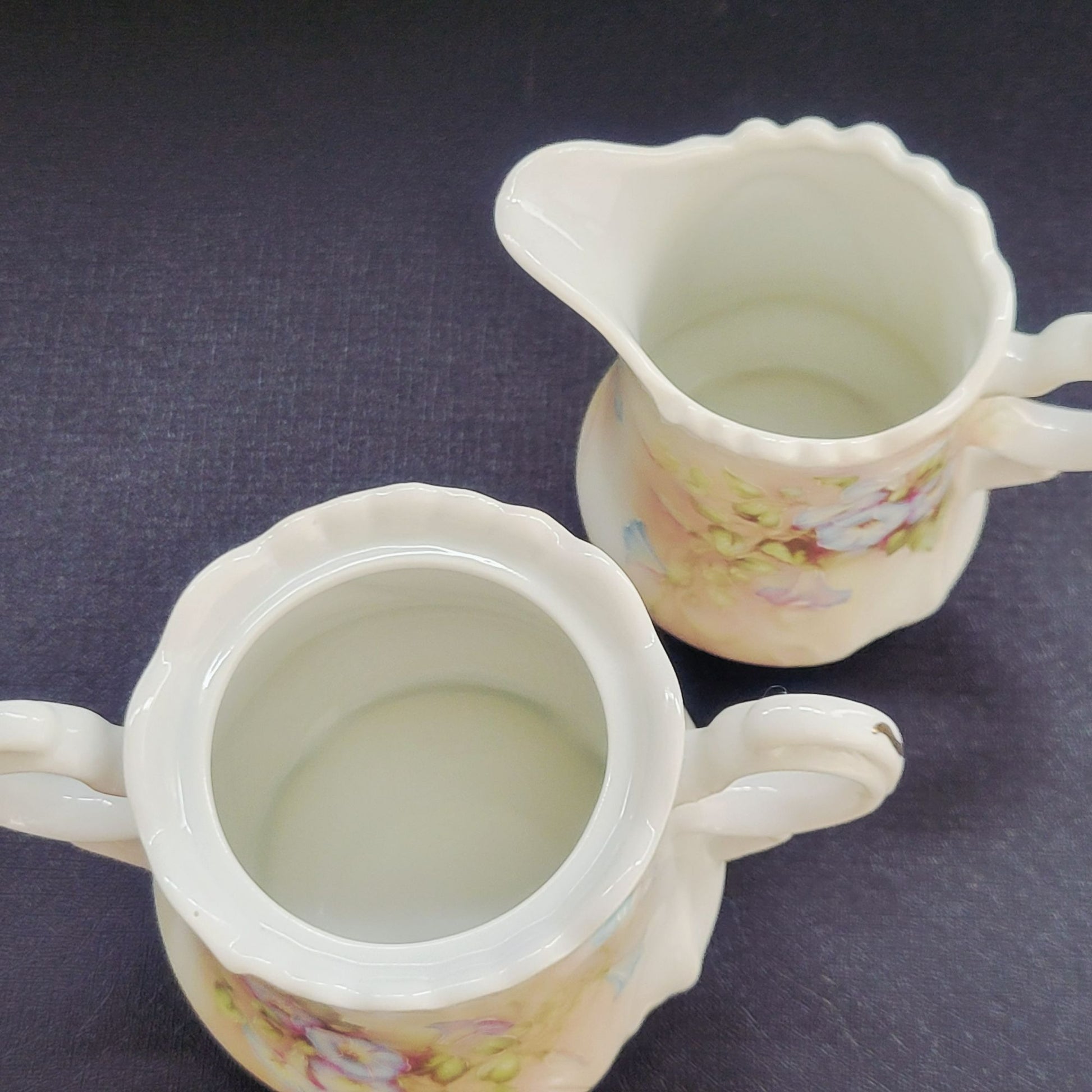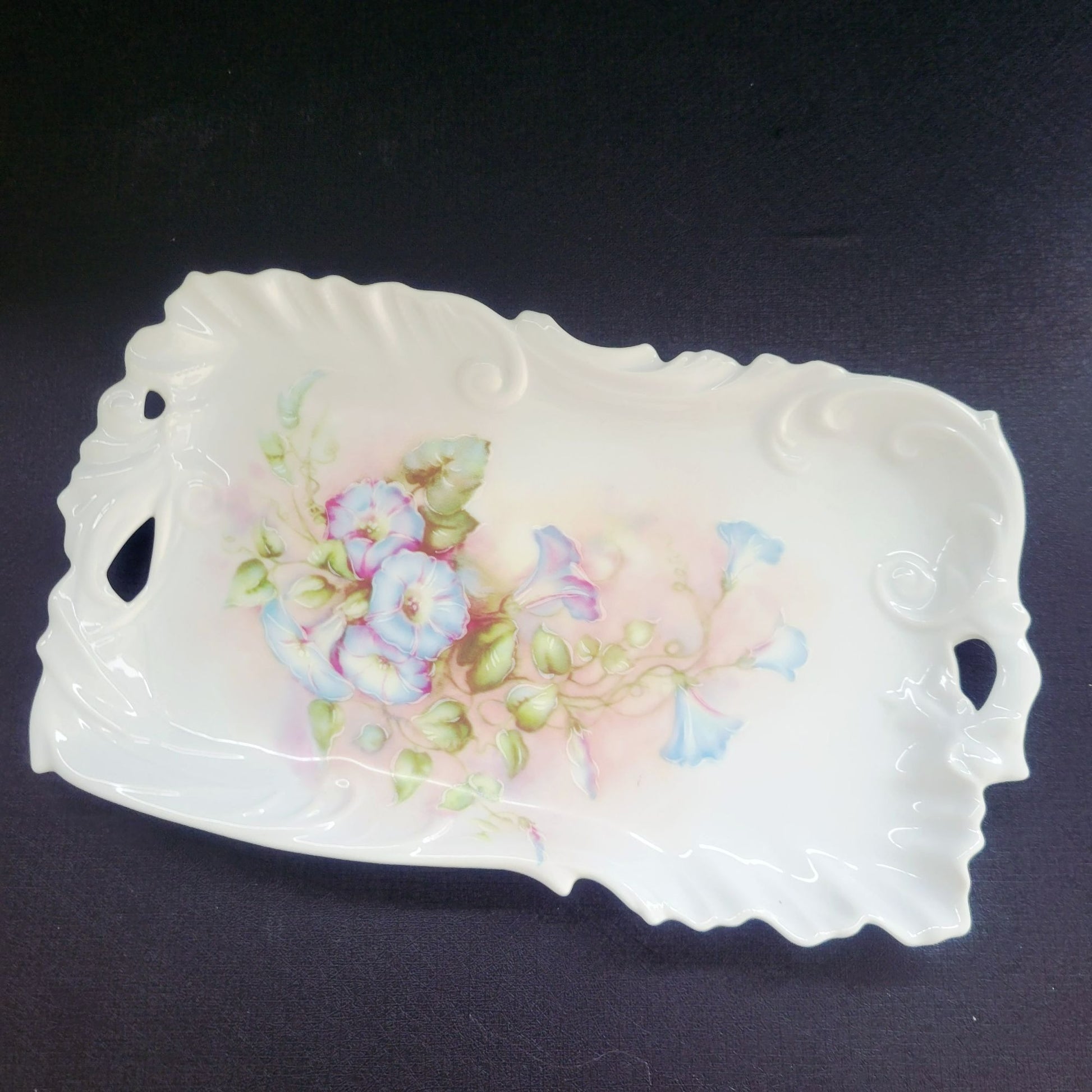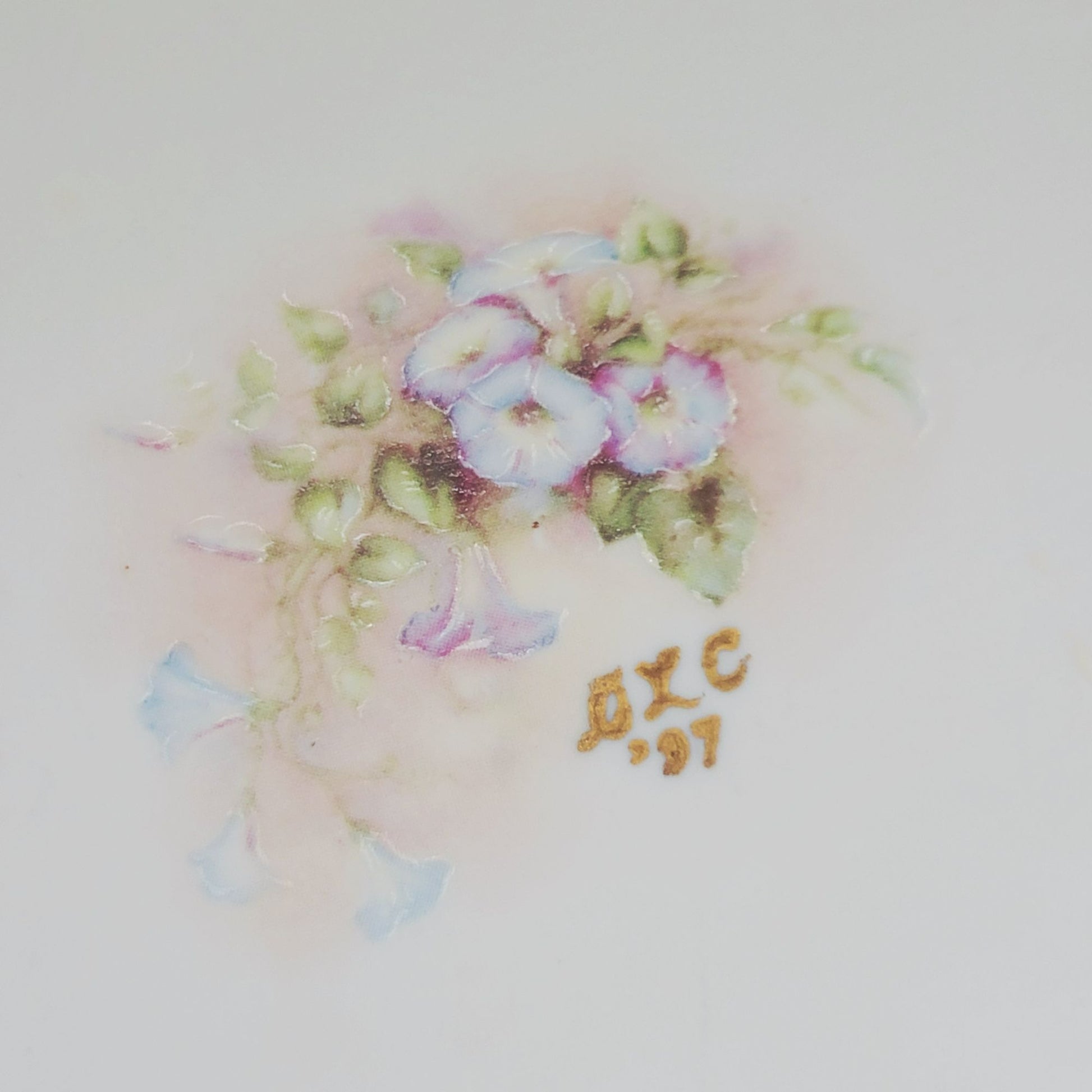 Stunning vintage hand-painted floral coffee serving set featuring a white embossed design with blue and pink pansy flowers. Perfect for shabby chic dining parties. Artist signed for added authenticity.