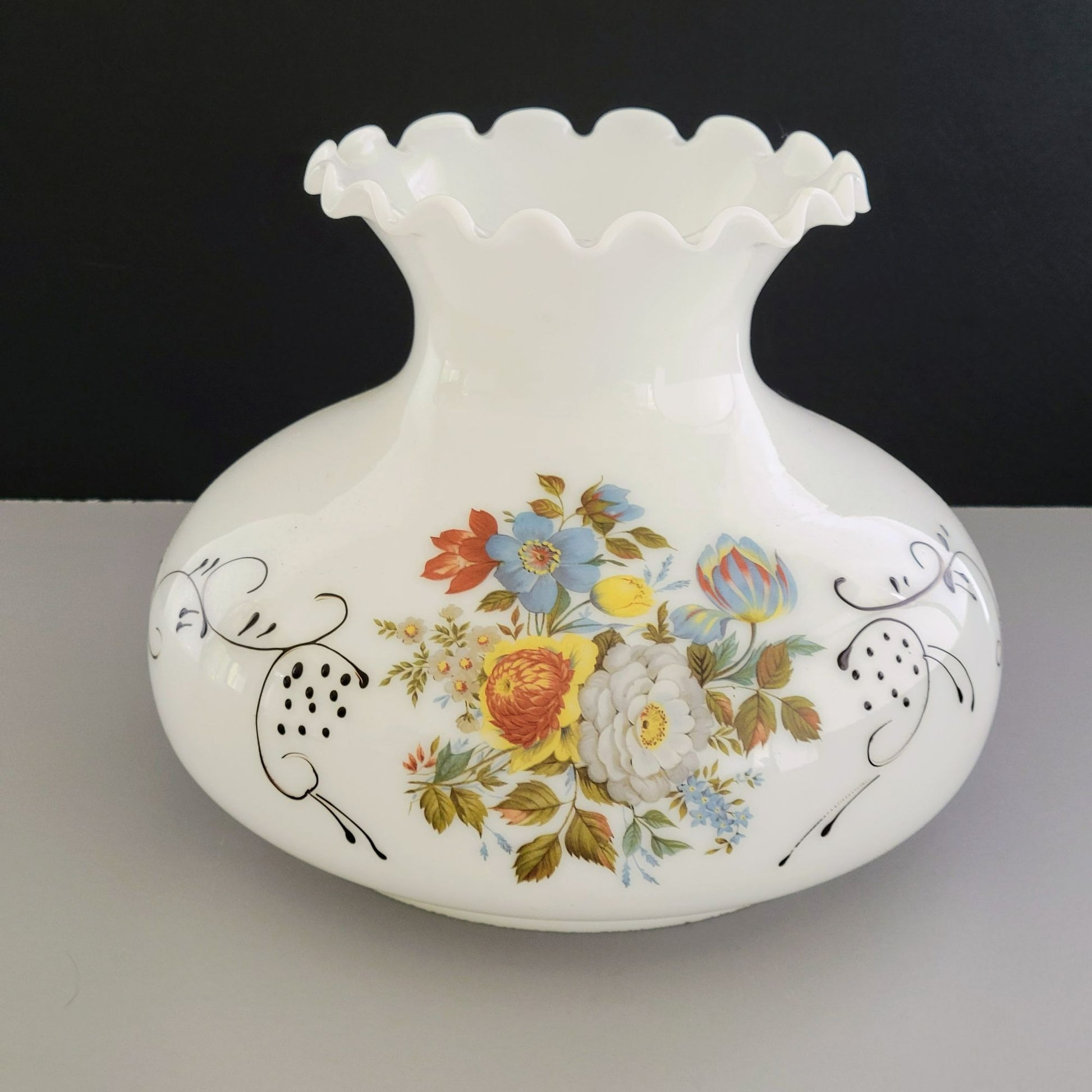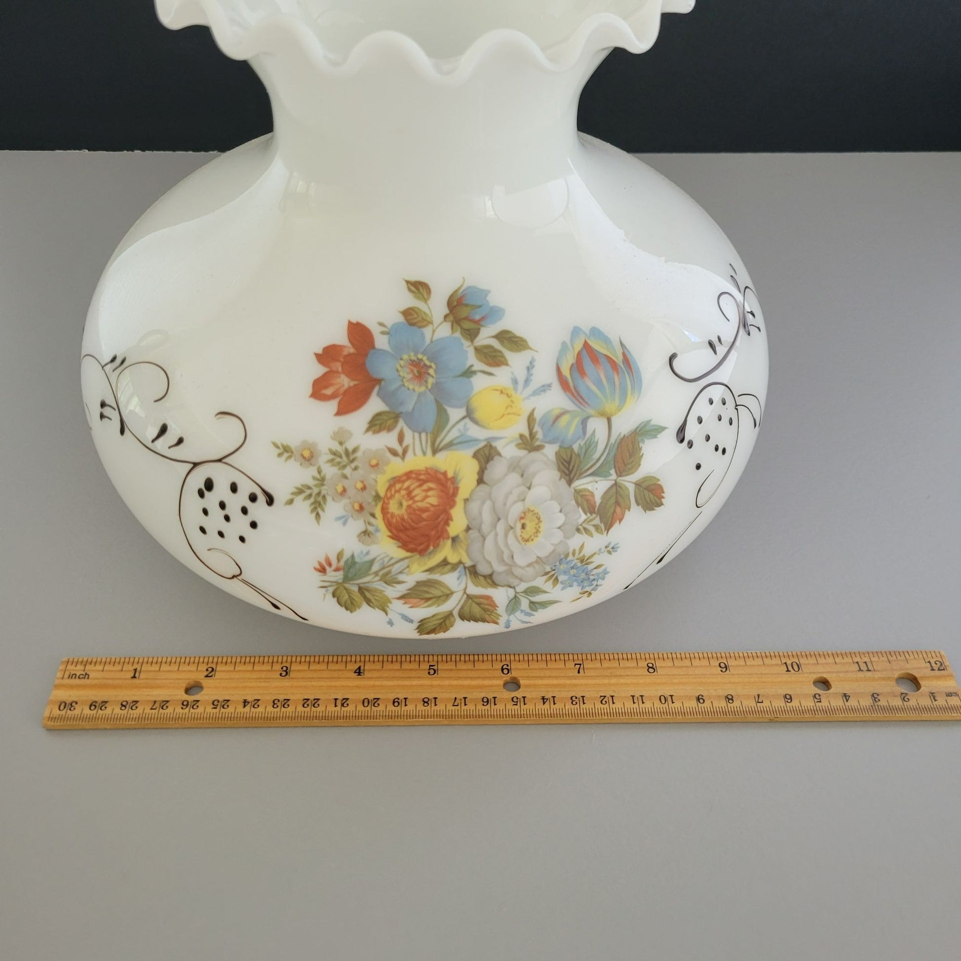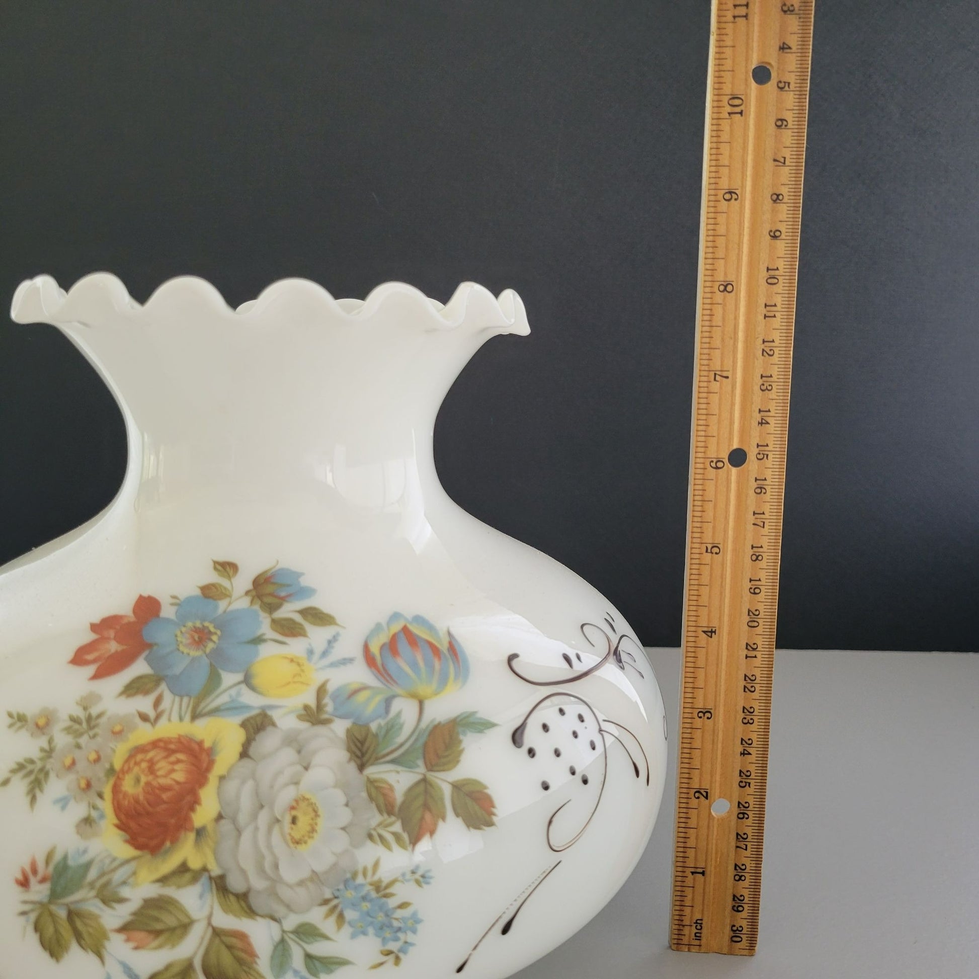 This vintage hand-painted floral hurricane lamp shade features a ruffled top and adds a touch of elegance to any room. Perfect for collectors and lovers of unique lighting decor, it stands 8 inches tall, making it a standout piece in any collection.