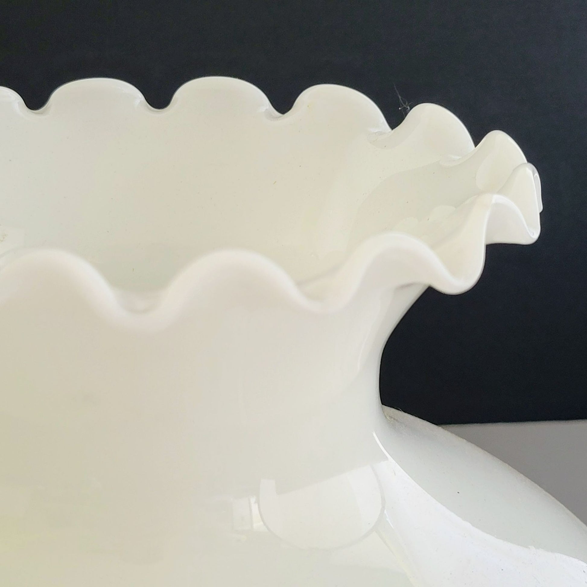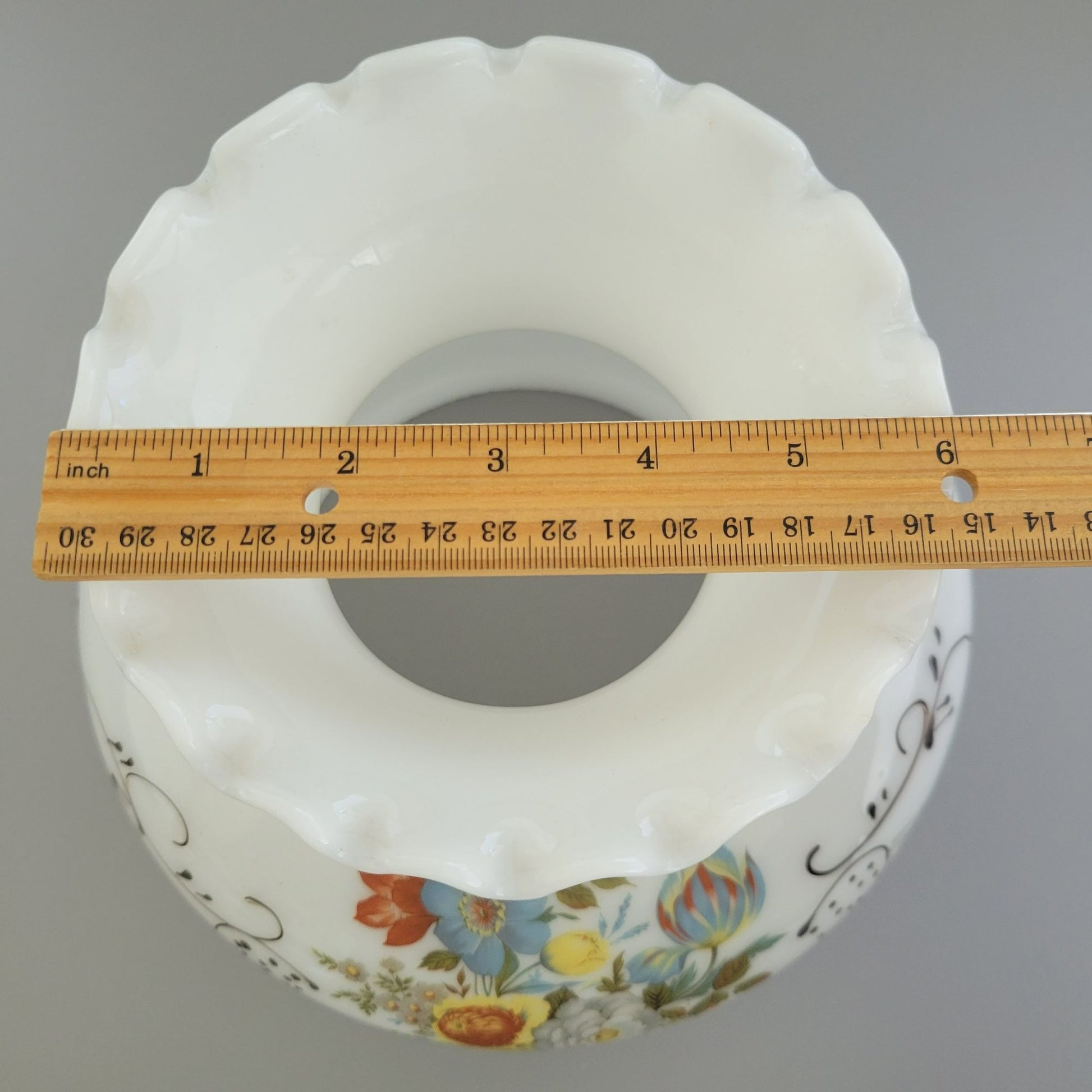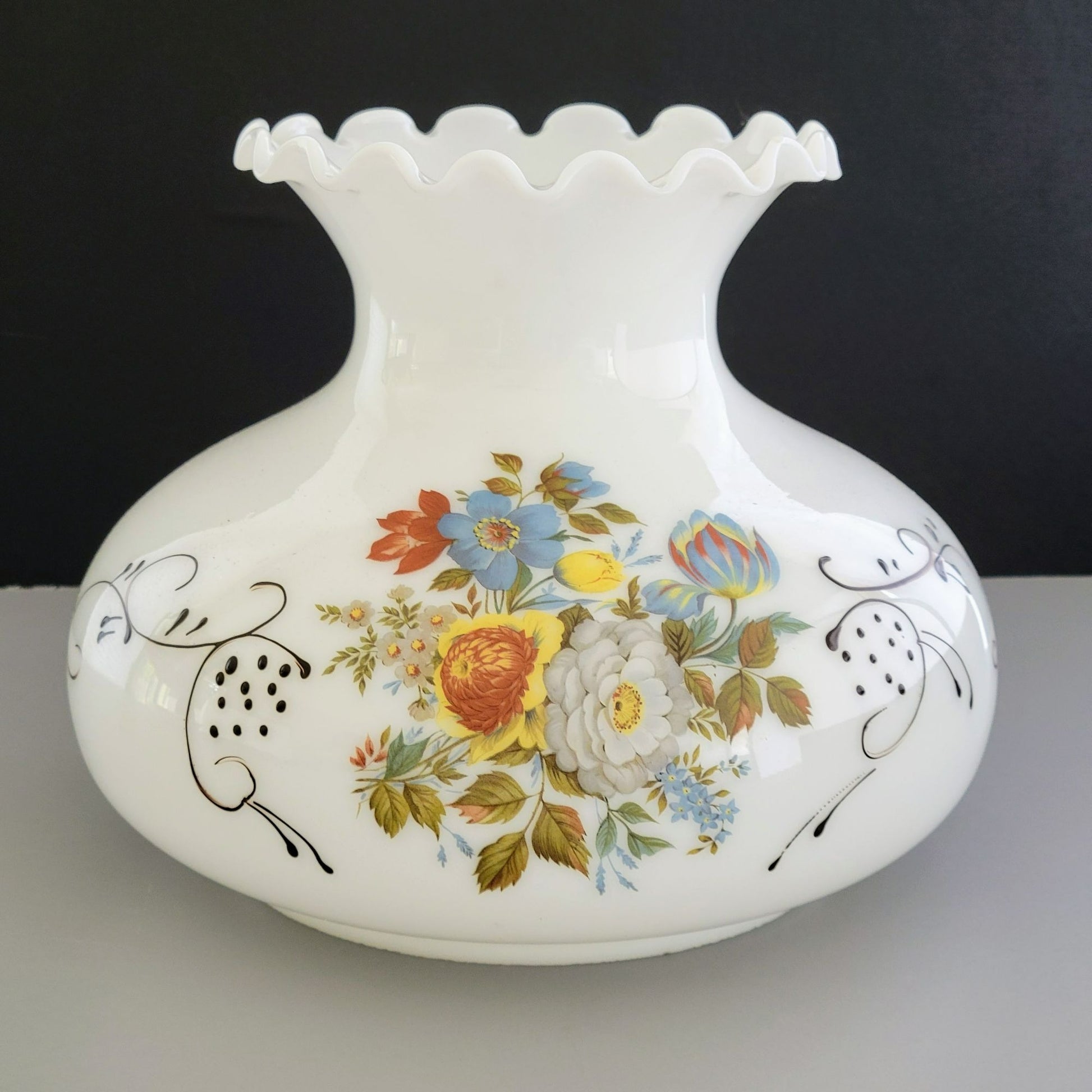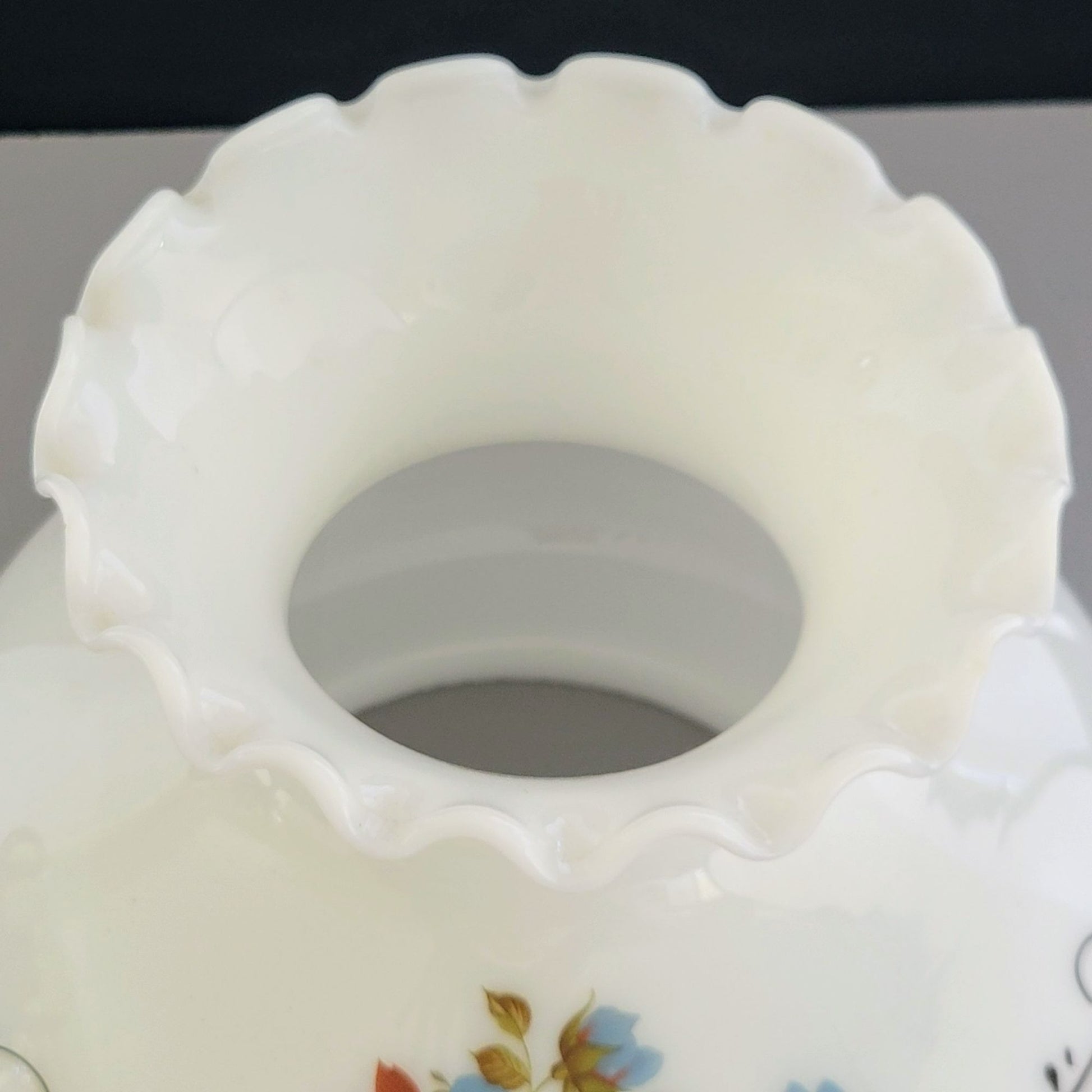 This vintage hand-painted floral hurricane lamp shade features a ruffled top and adds a touch of elegance to any room. Perfect for collectors and lovers of unique lighting decor, it stands 8 inches tall, making it a standout piece in any collection.