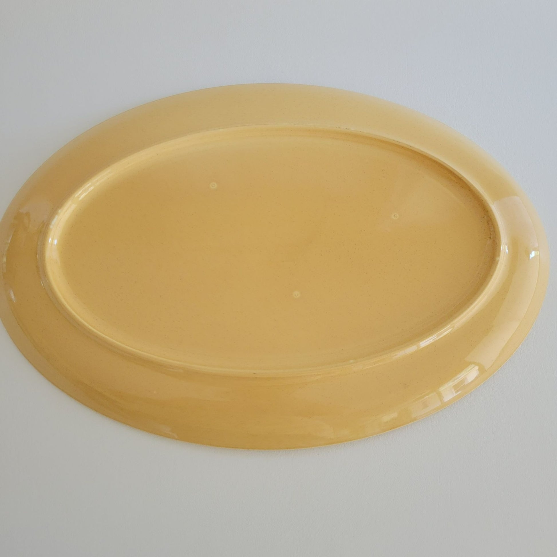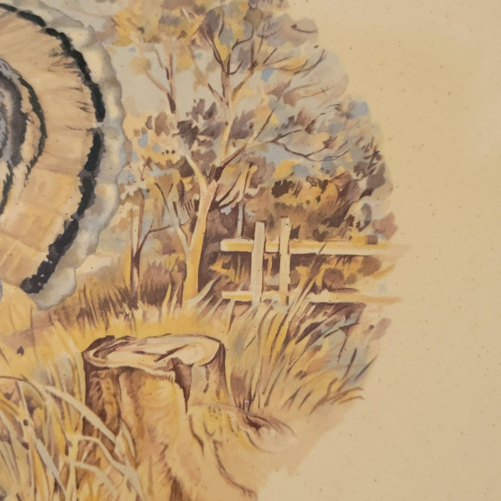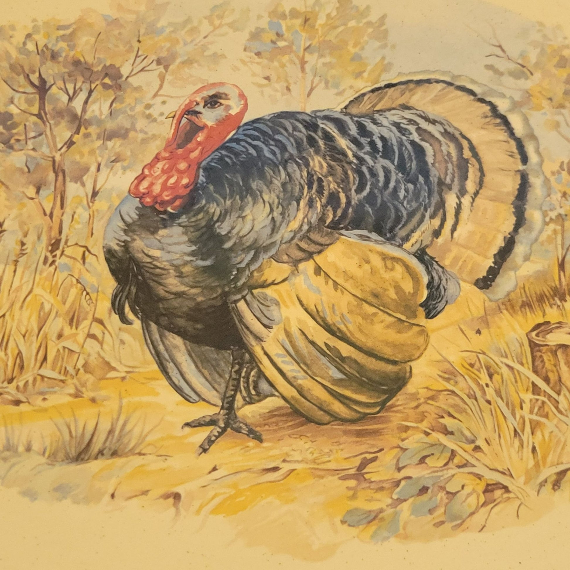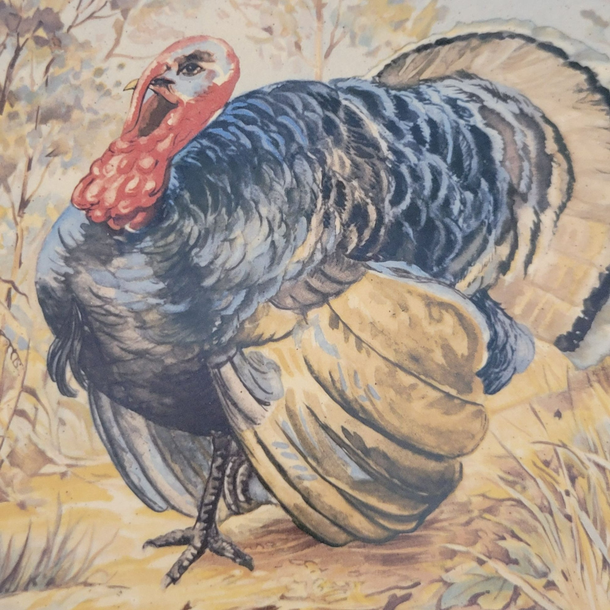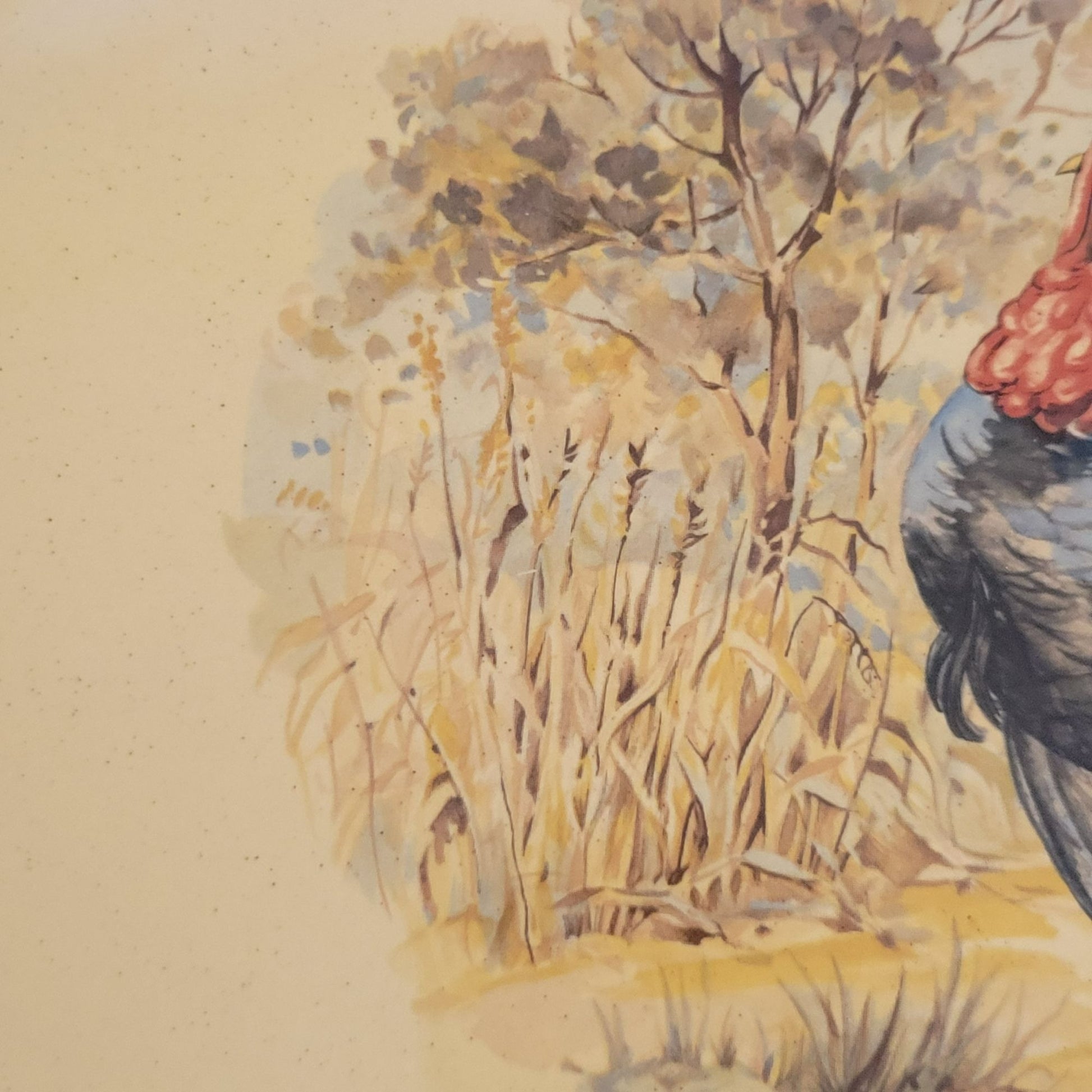 This vintage ceramic platter showcases a hand-painted turkey in a pastoral setting. Its earthy yellow tones and rustic charm evoke a bygone era, making it an evocative centerpiece for gatherings or decor. Its craftsmanship and detail reflect a dedication to artistry, perfect for those appreciating historical aesthetic touches.