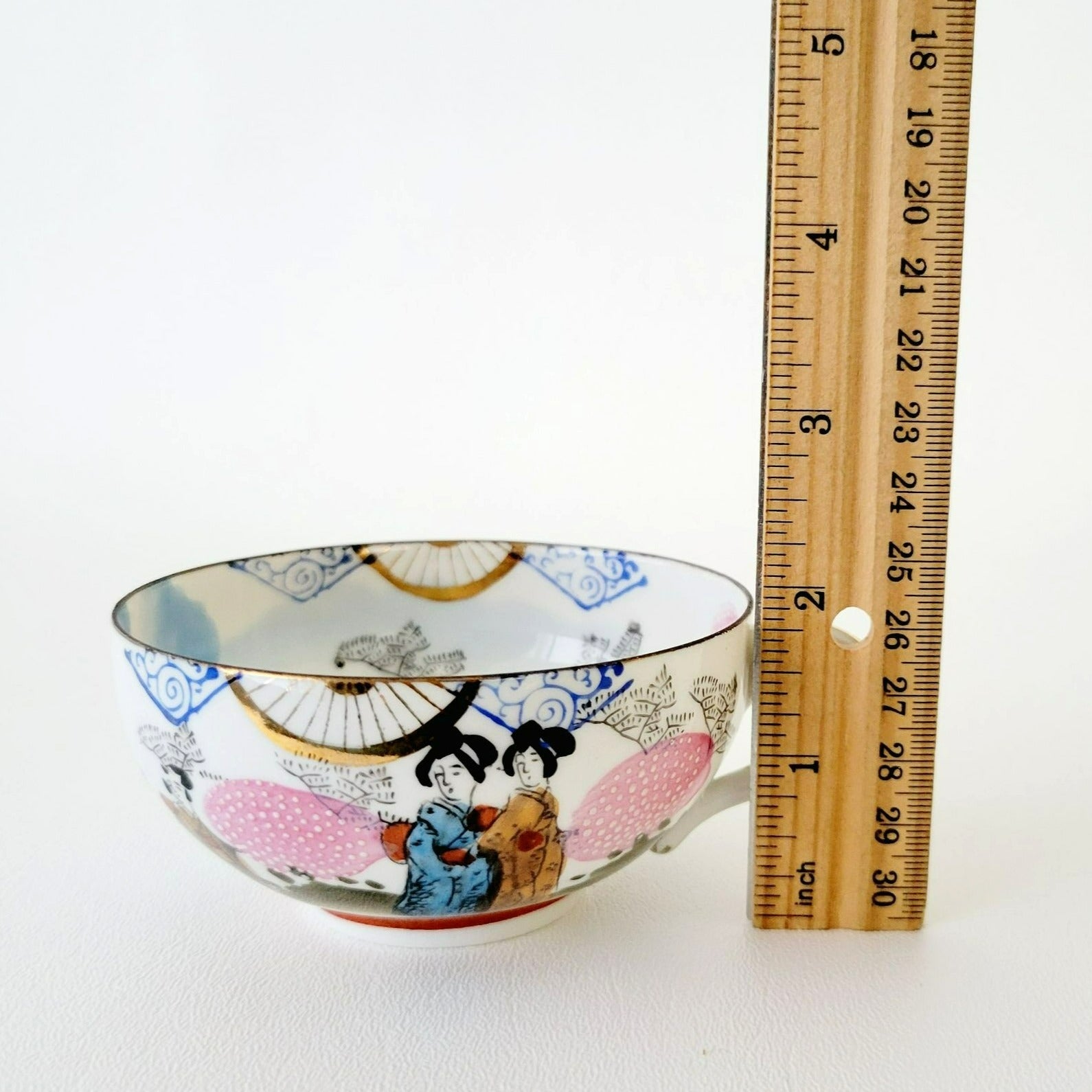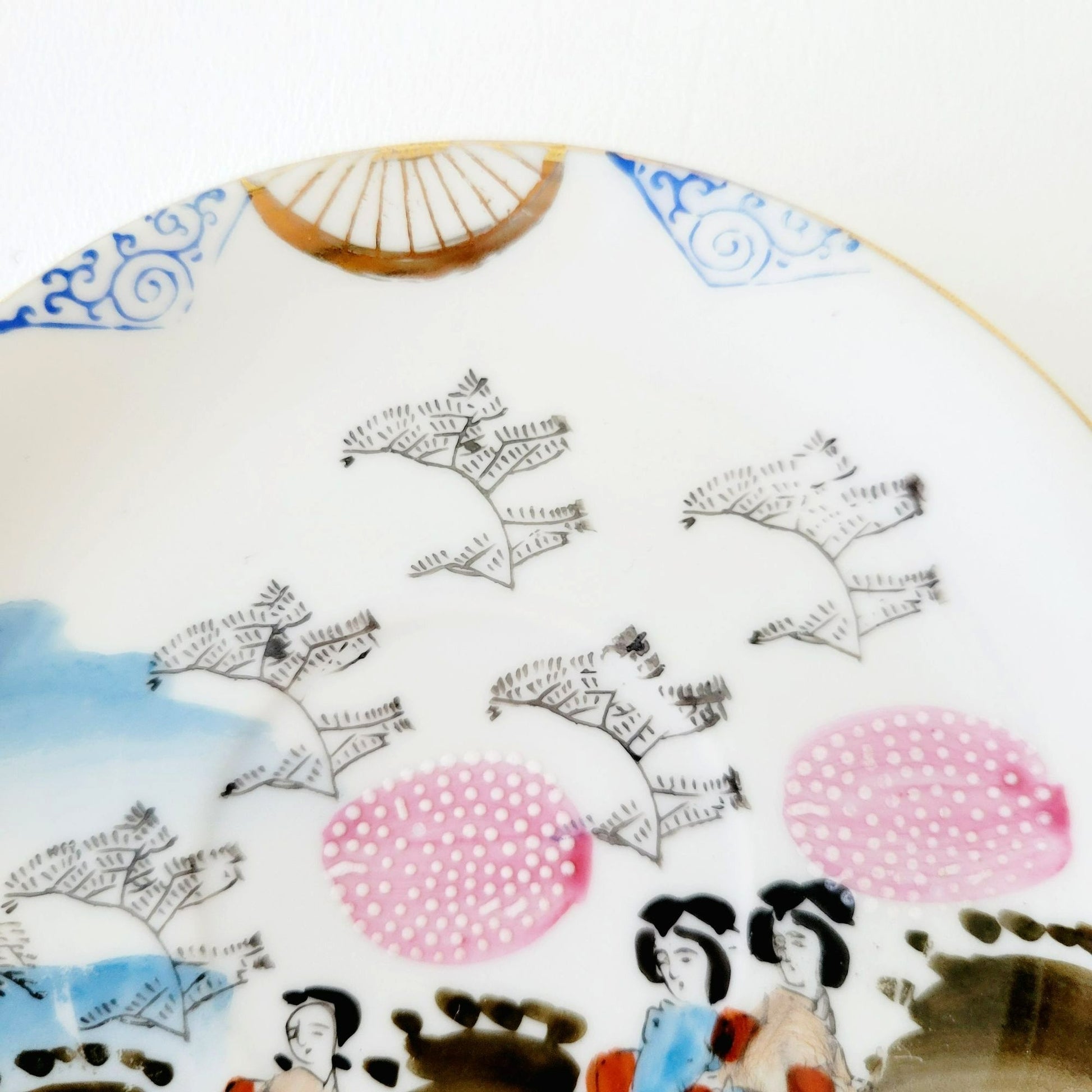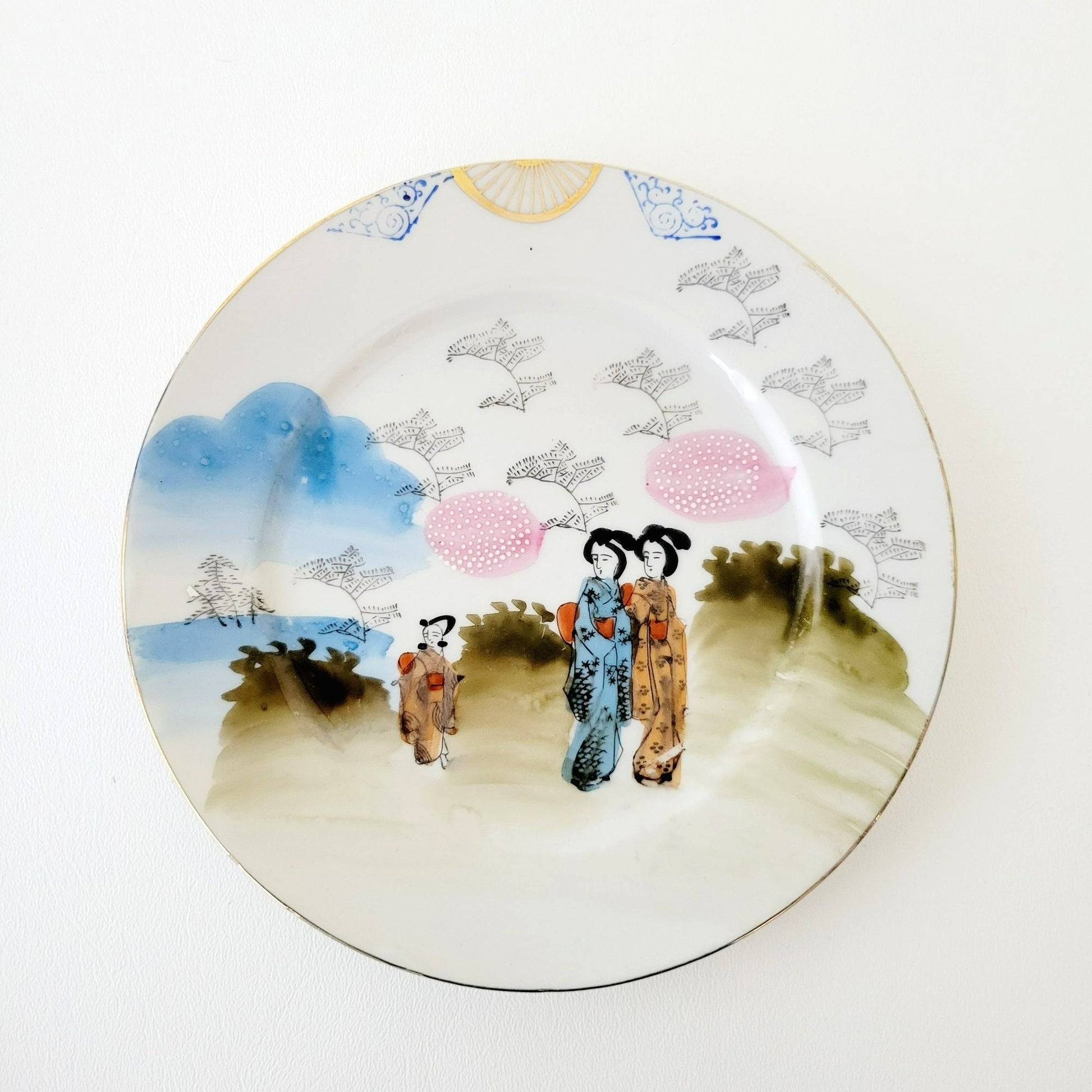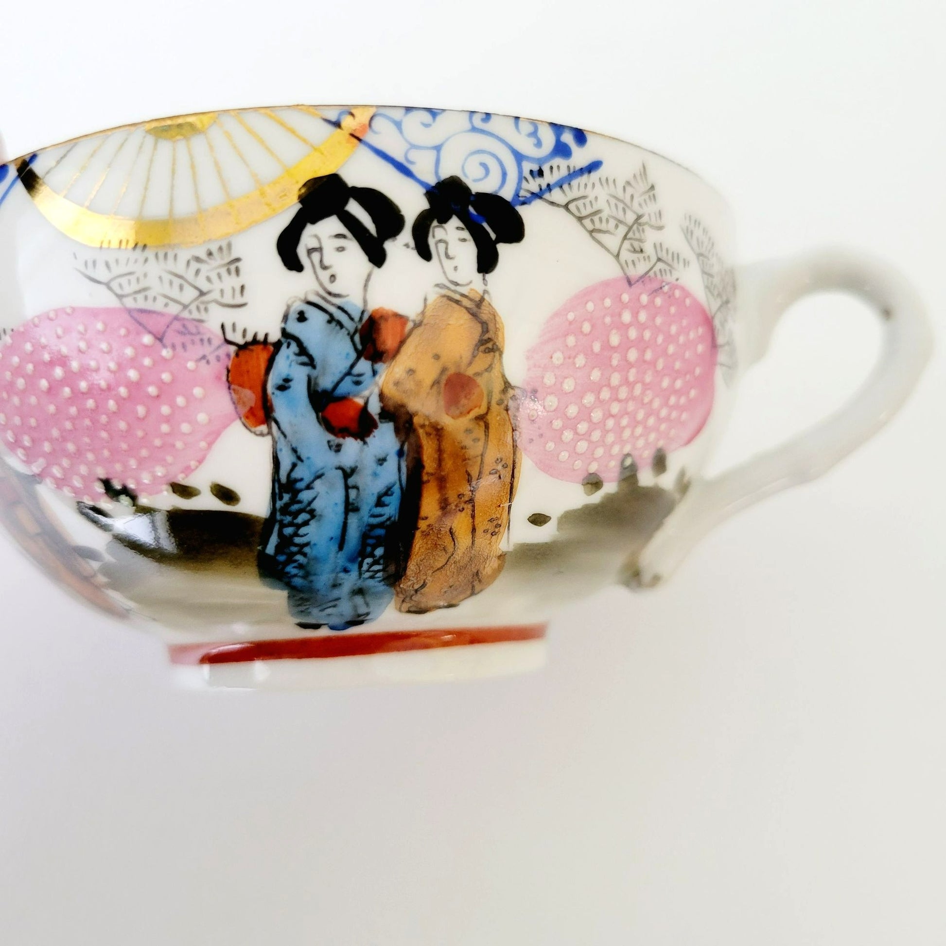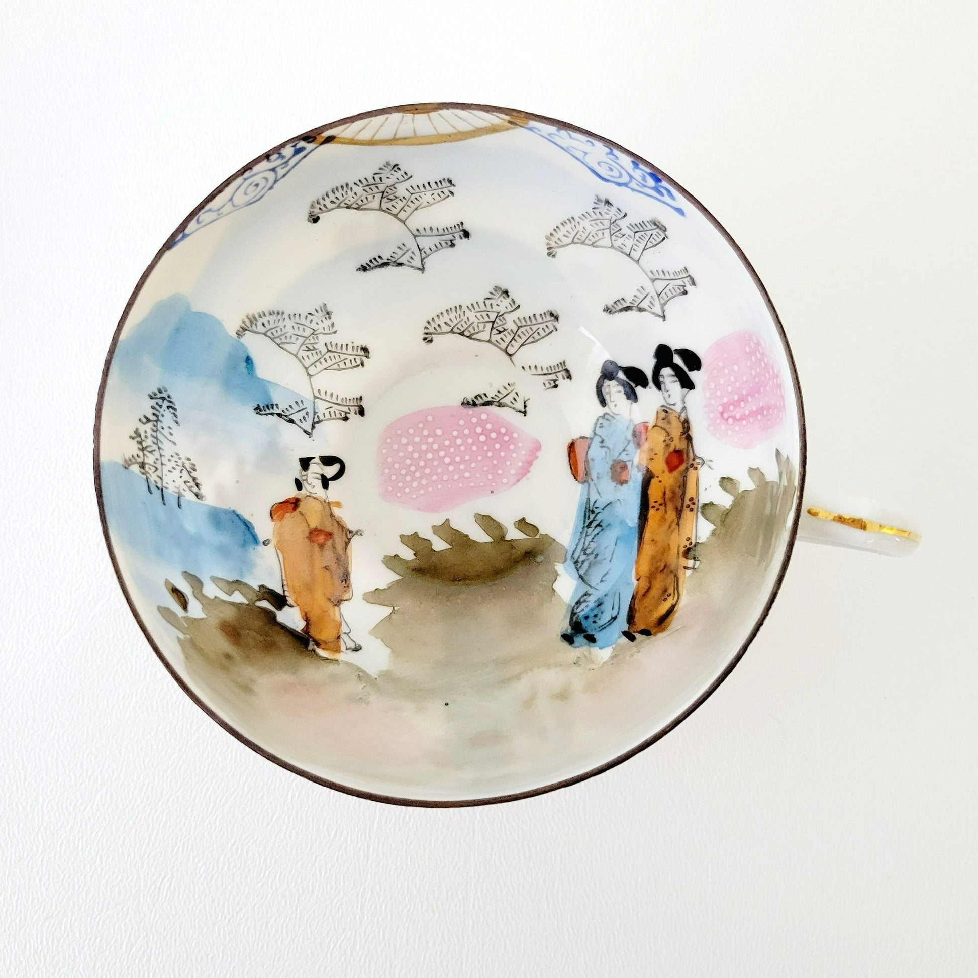 Vintage Japanese Kutani Geisha Girls set featuring a teacup, saucer, salad and bread plate. Beautifully hand-painted in a pink and blue Japanese landscape design. Made of fine porcelain.