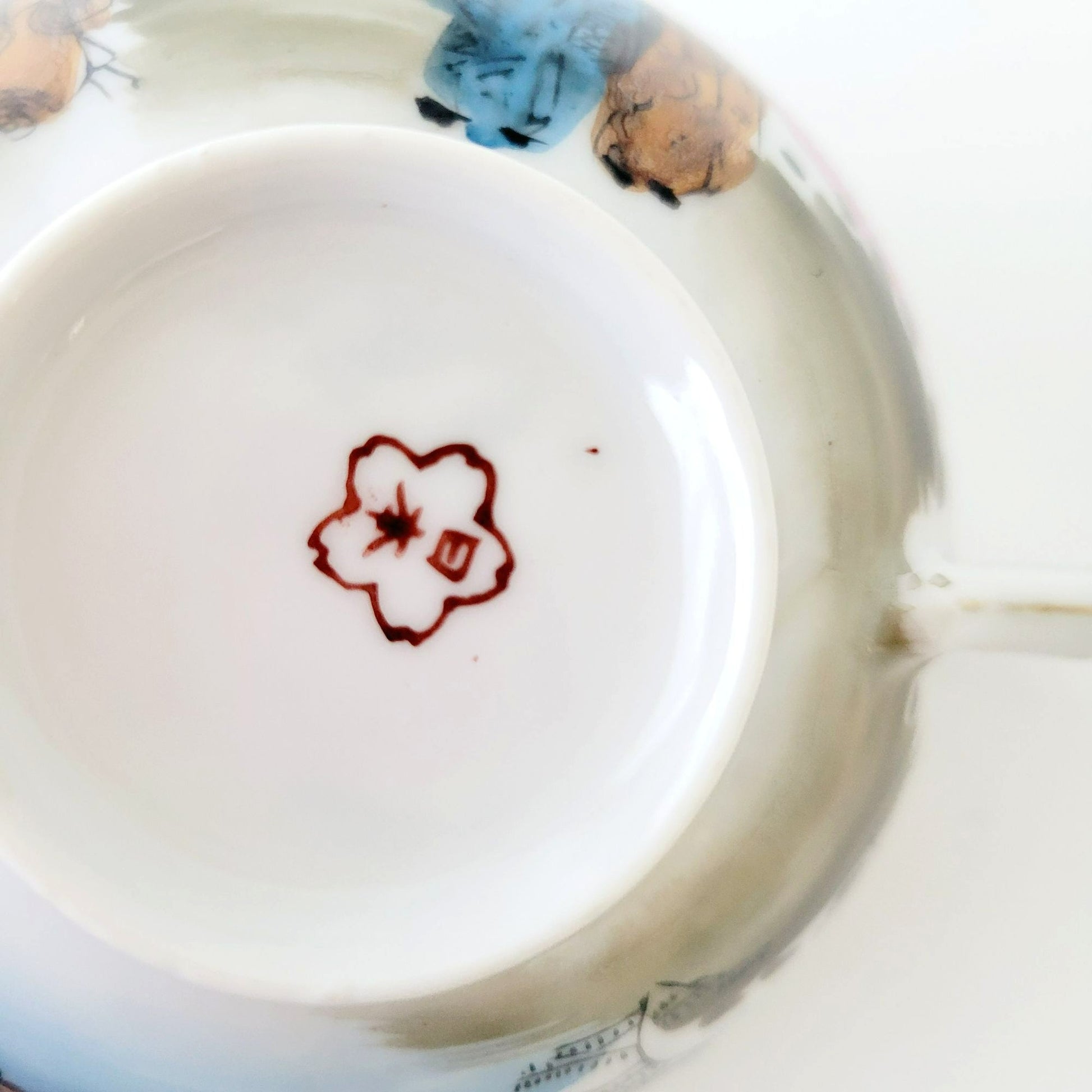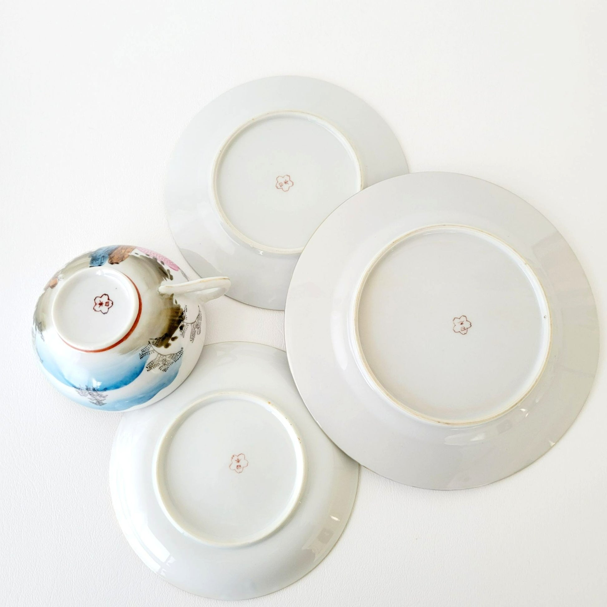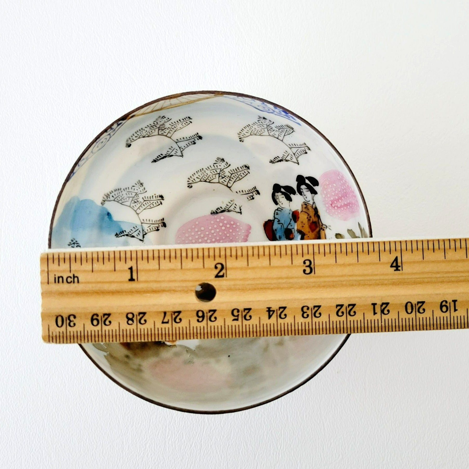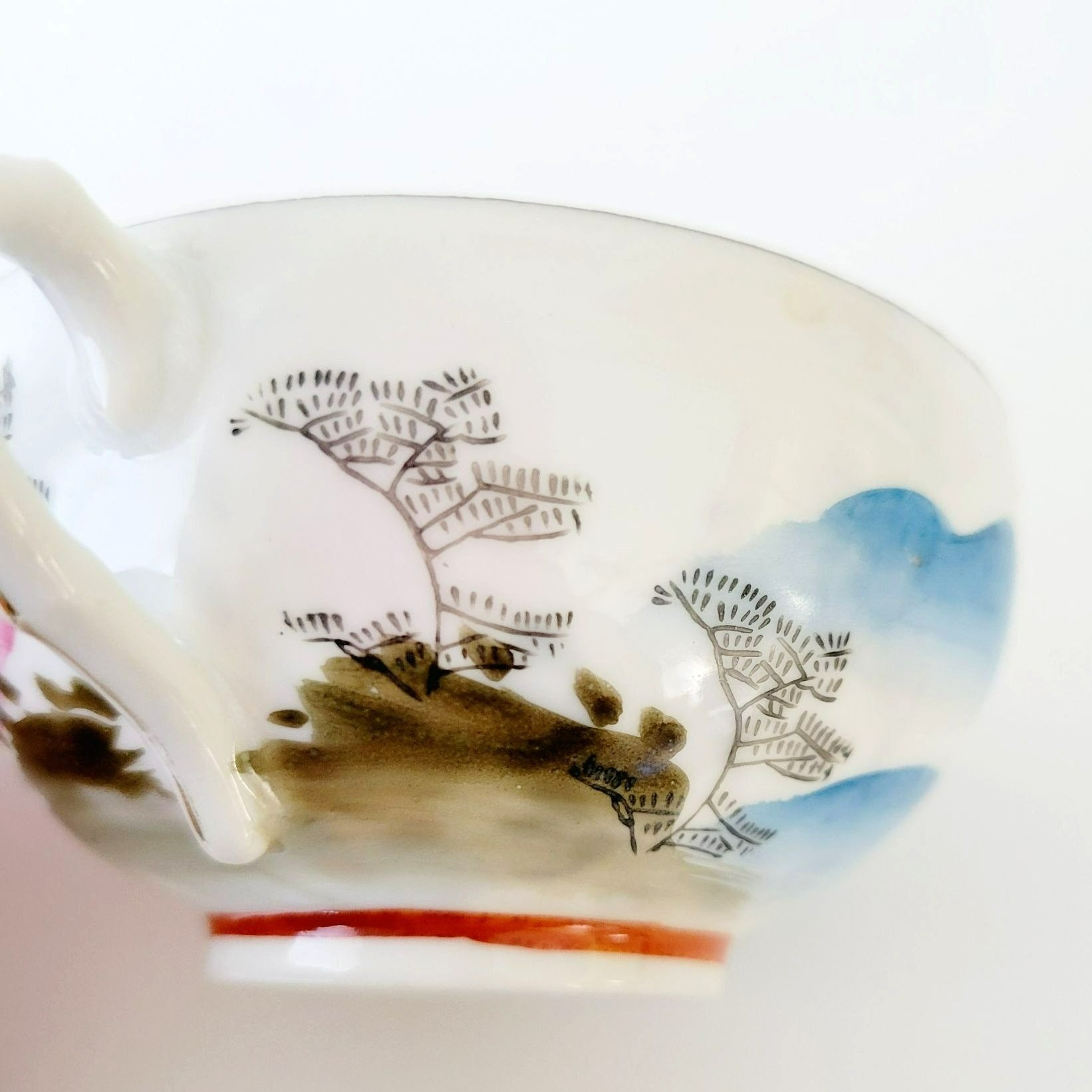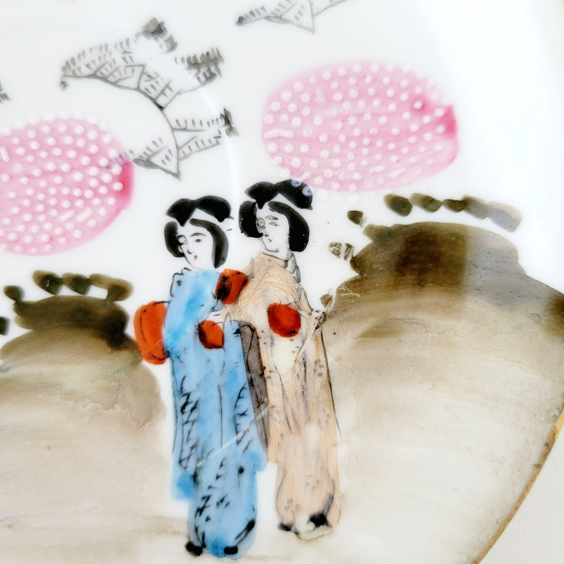 Vintage Japanese Kutani Geisha Girls set featuring a teacup, saucer, salad and bread plate. Beautifully hand-painted in a pink and blue Japanese landscape design. Made of fine porcelain.