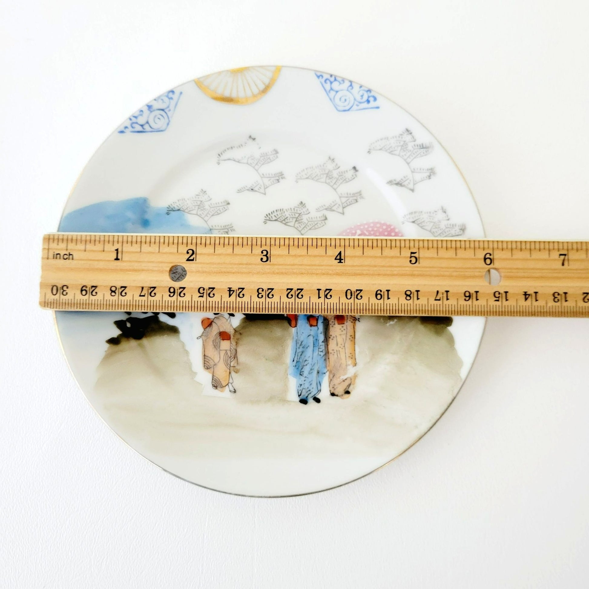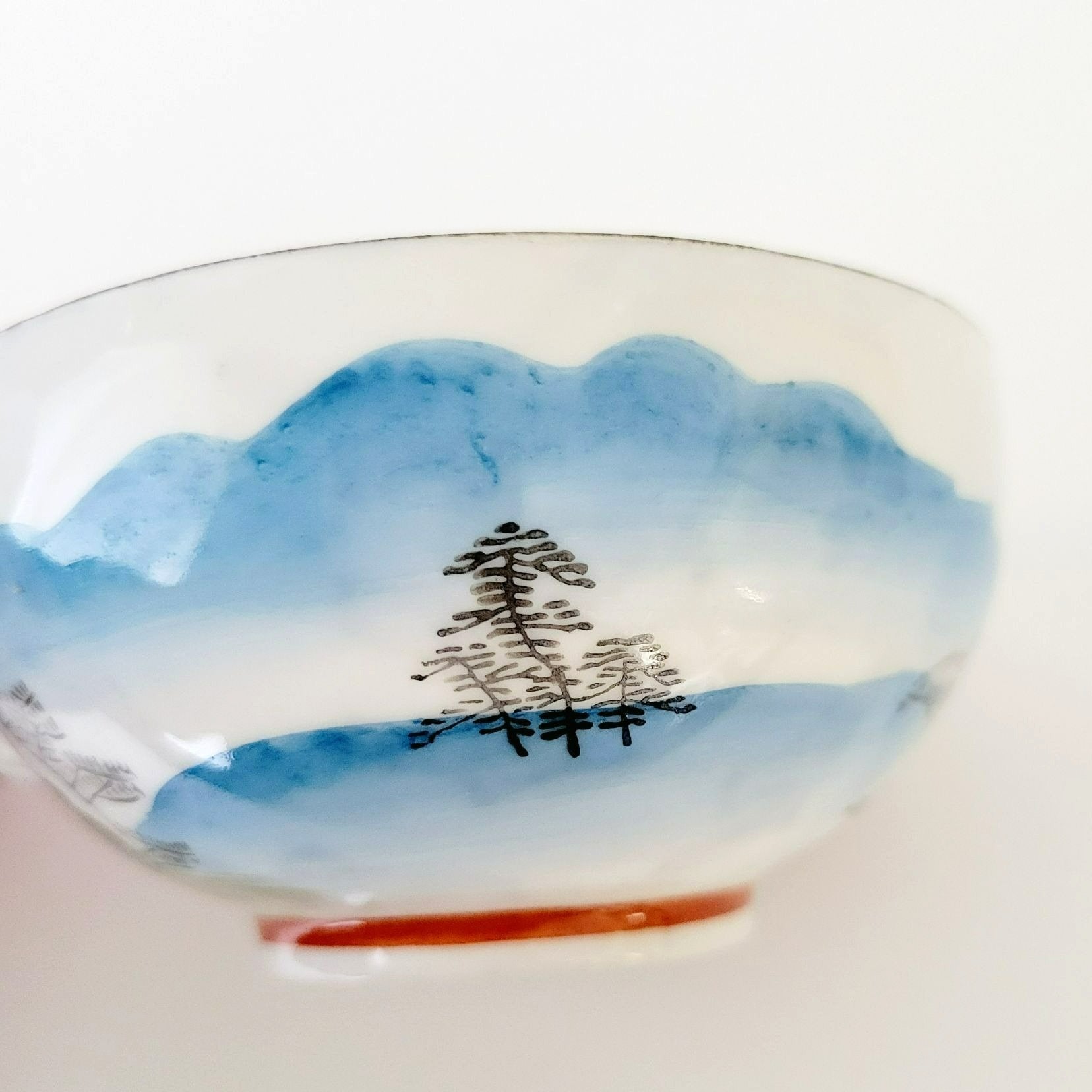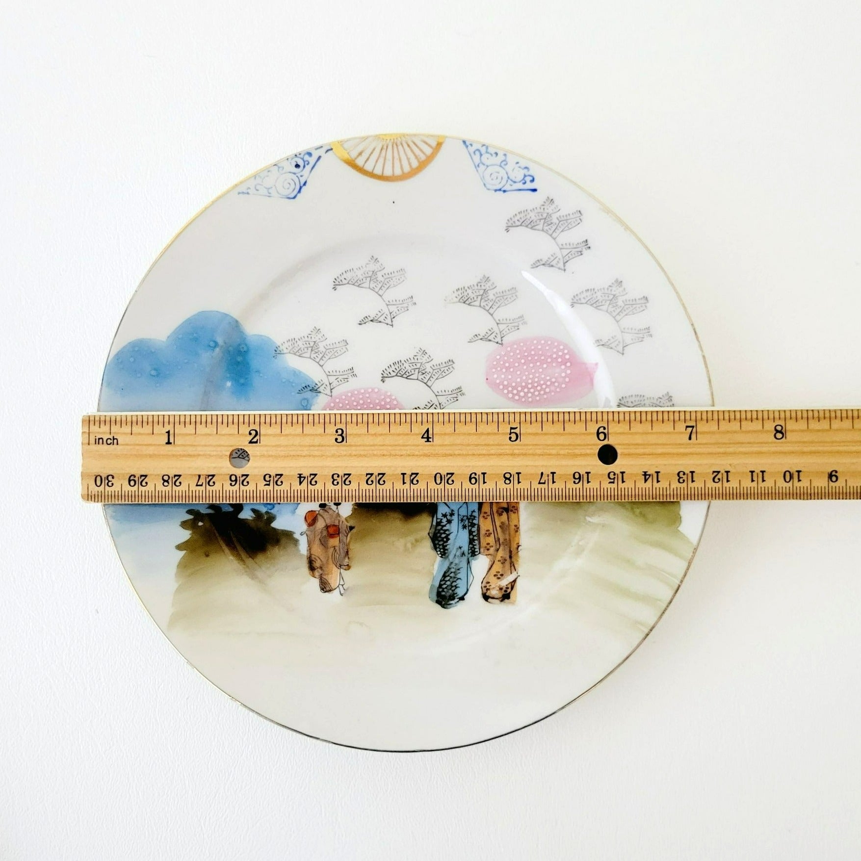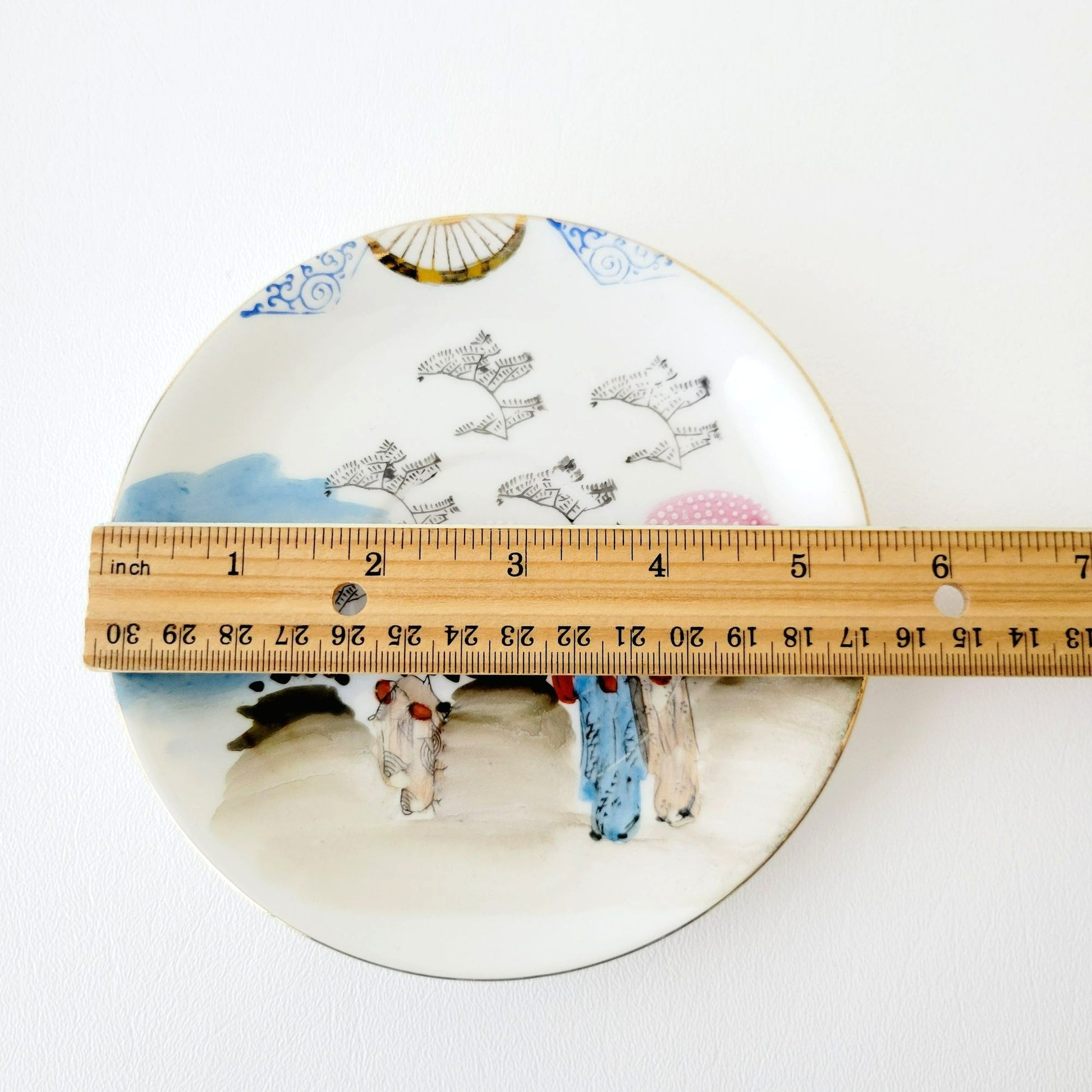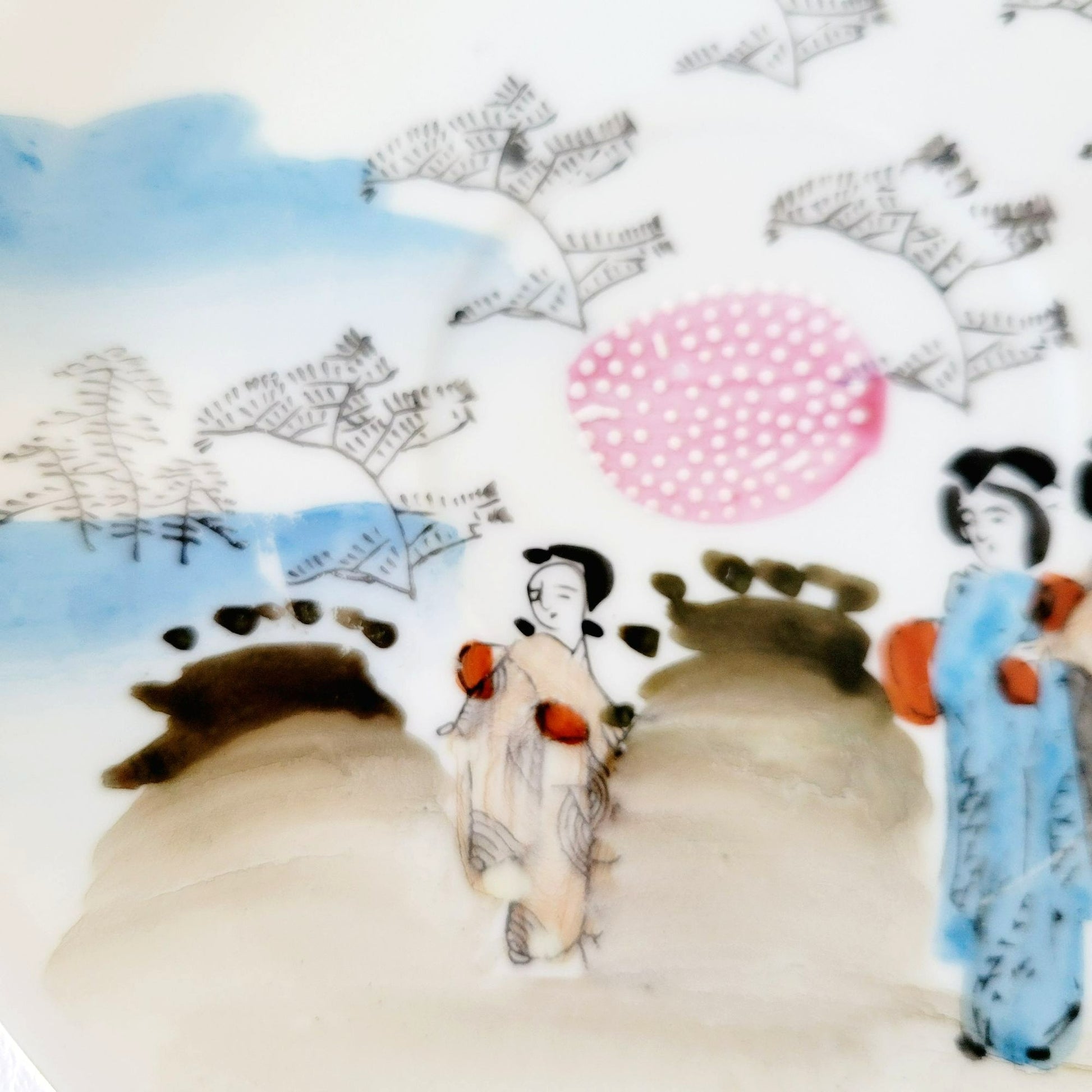 Vintage Japanese Kutani Geisha Girls set featuring a teacup, saucer, salad and bread plate. Beautifully hand-painted in a pink and blue Japanese landscape design. Made of fine porcelain.