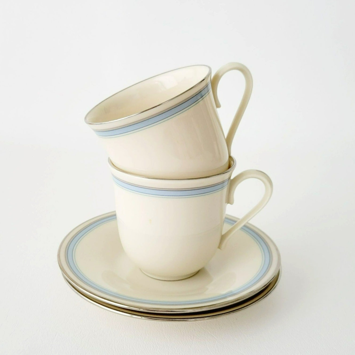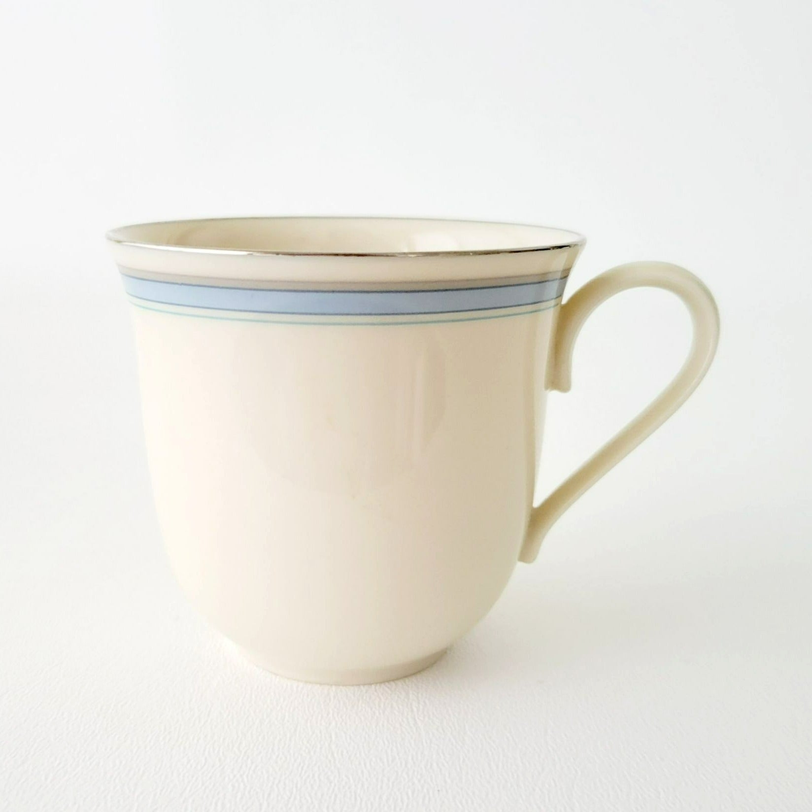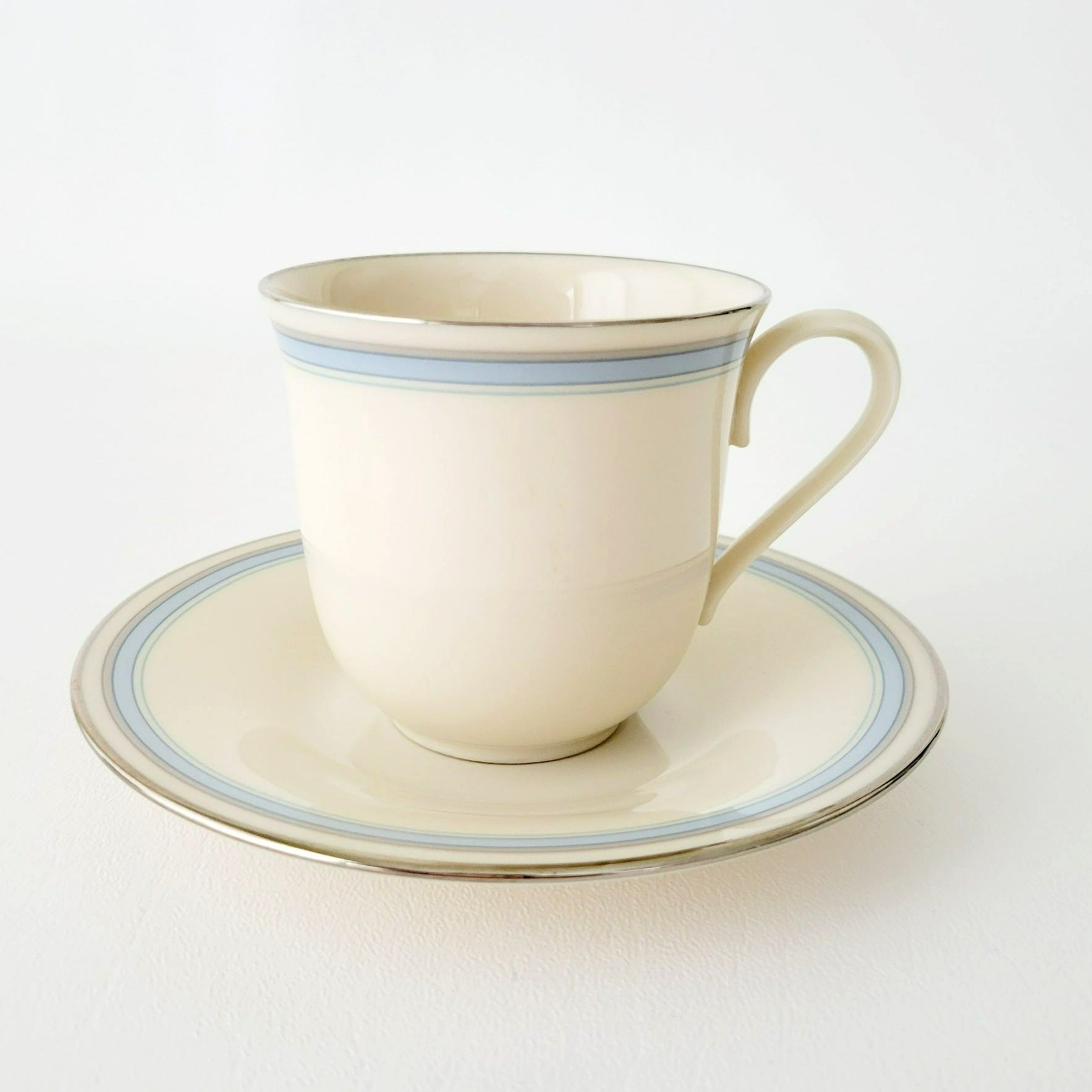 Lenox Bradford Teacup & Saucer, Cream with Blue & Platinum Trim, c.1980s USA Made