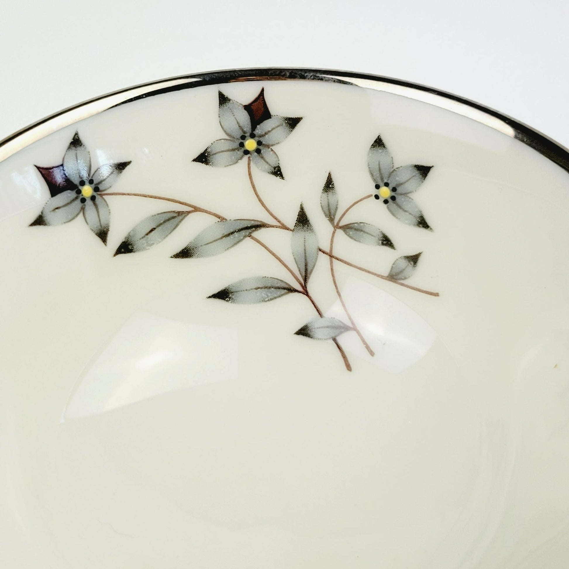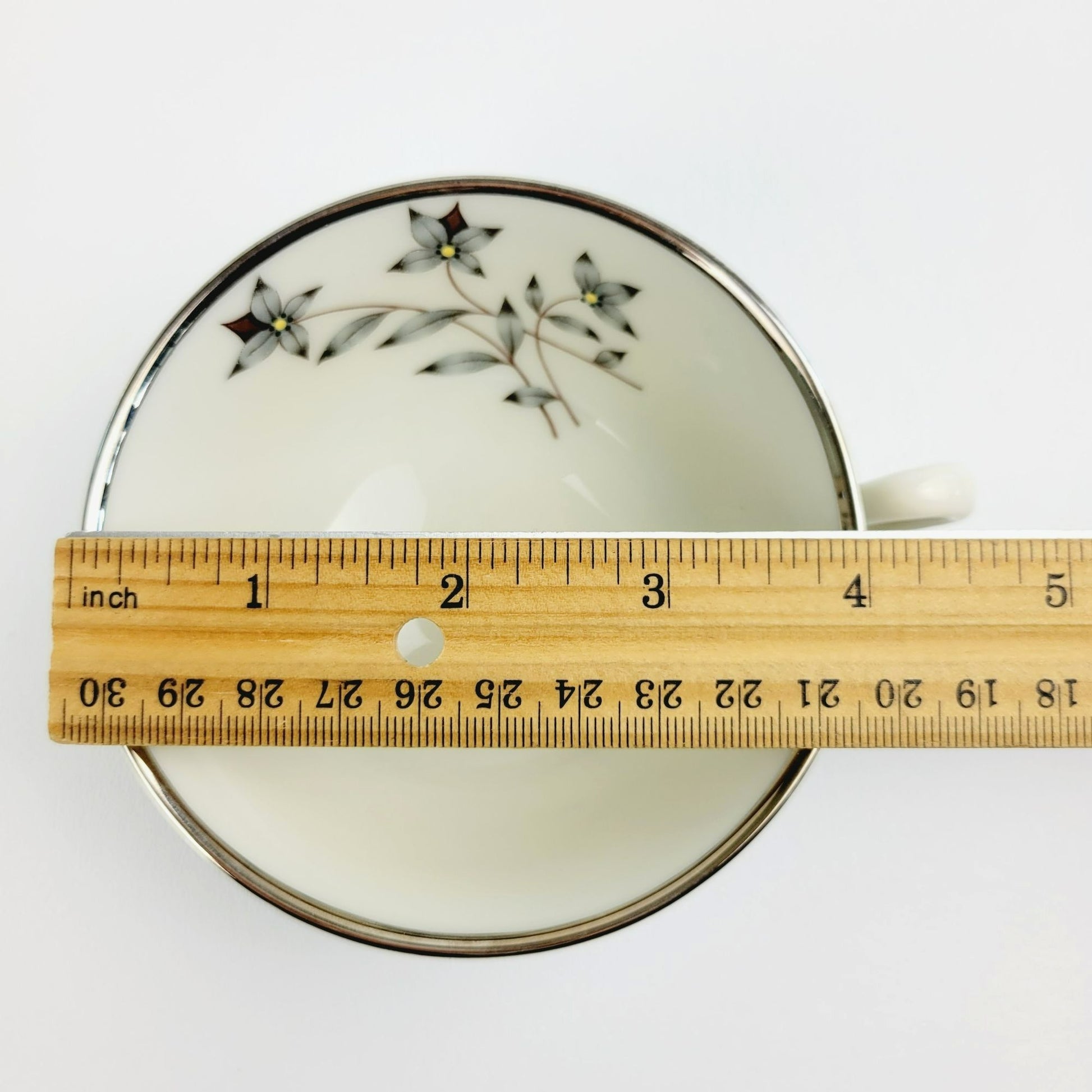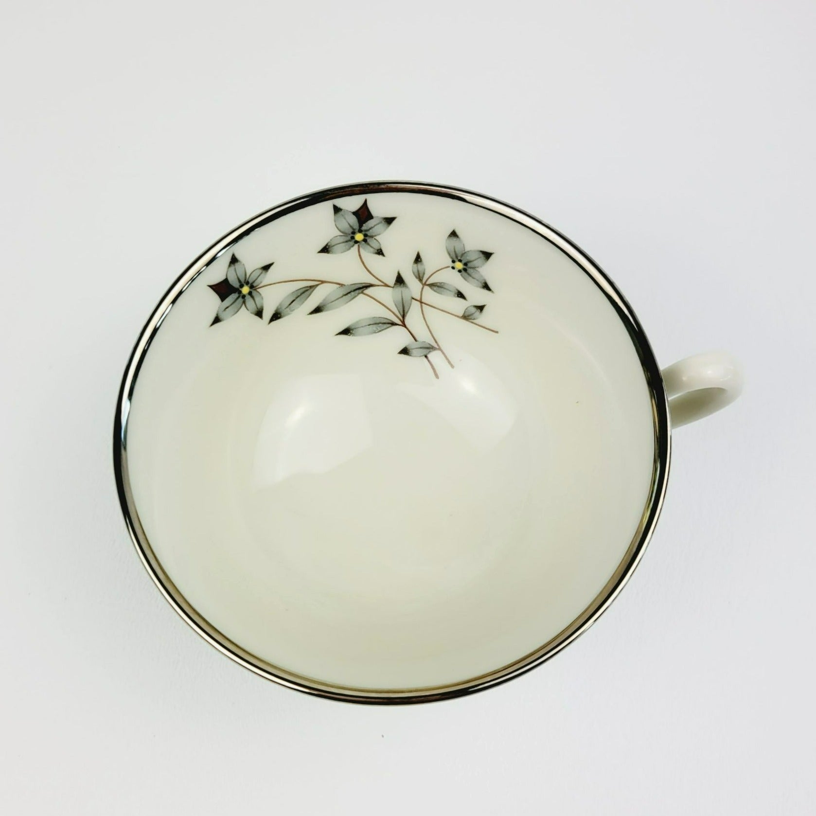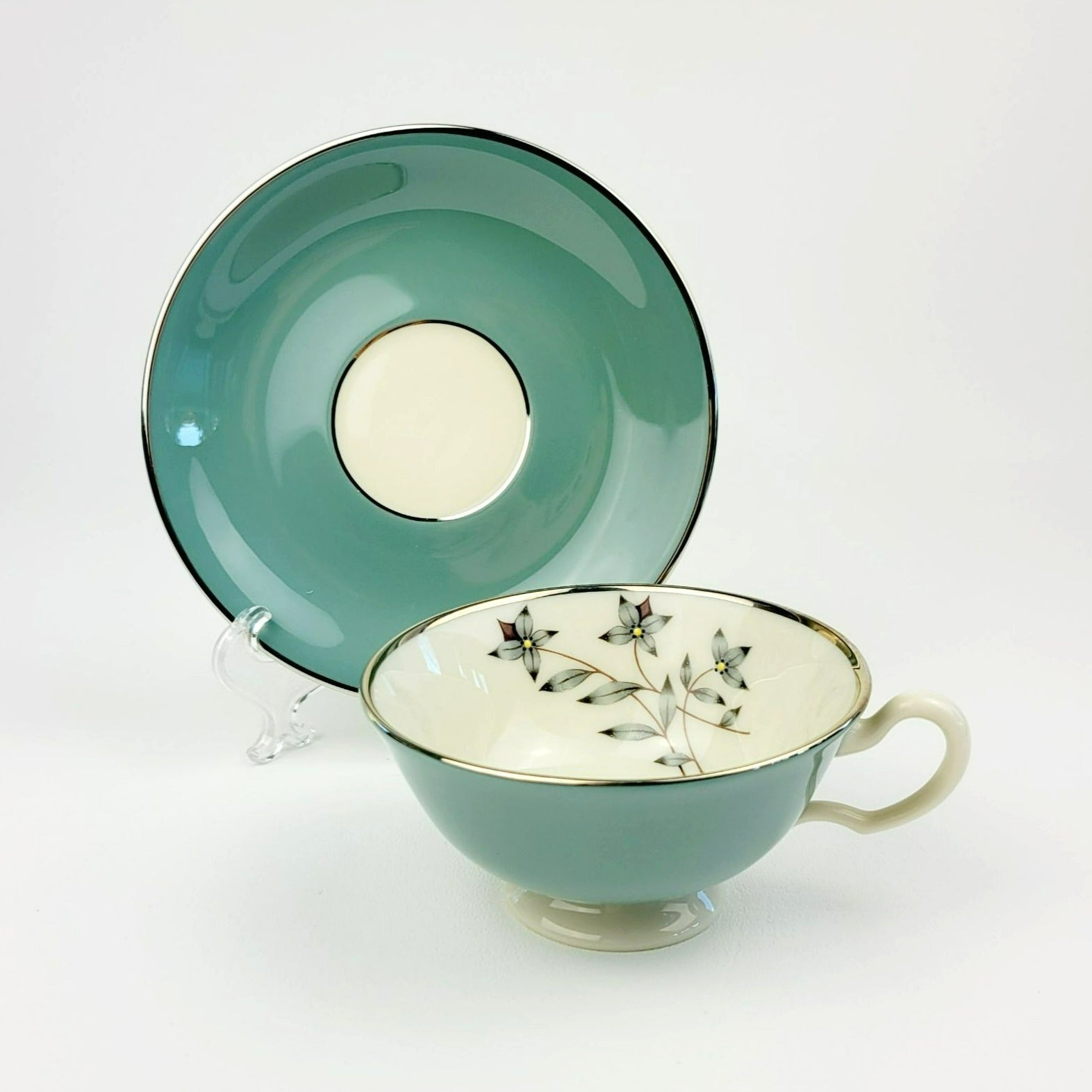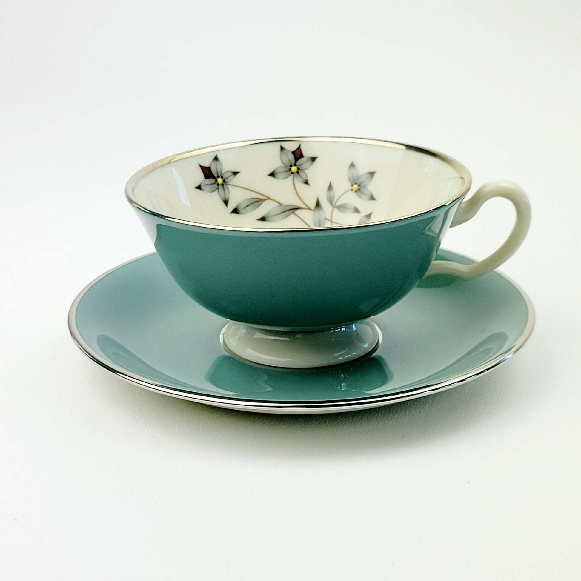 Lenox Kingsley Teacup & Saucer, Teal Band & Platinum Trim, Floral Center, c1954-79 USA