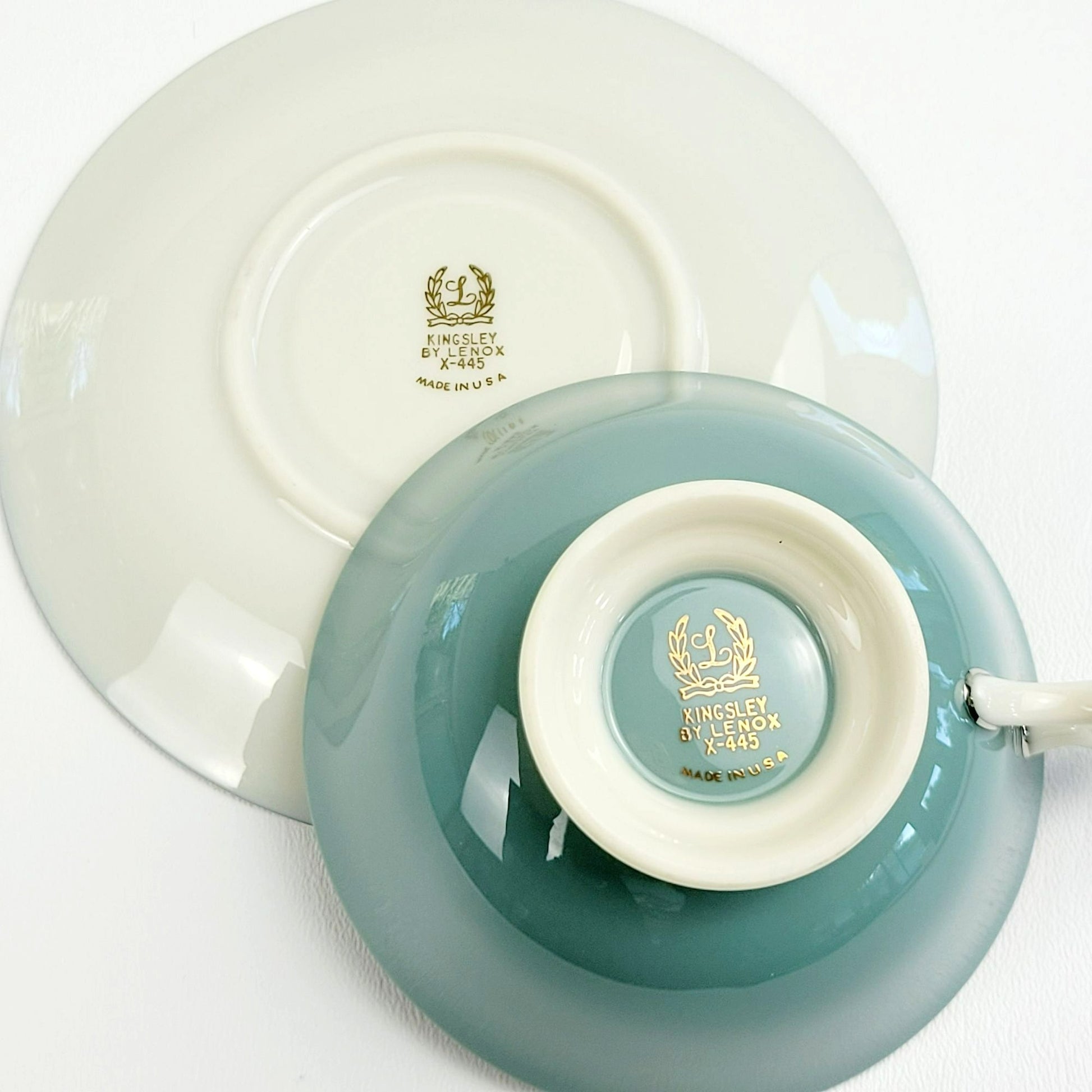 The Lenox Kingsley Teacup & Saucer features a teal band and platinum trim with a floral center. Composed of fine porcelain, this set was made in the USA between 1954-79.