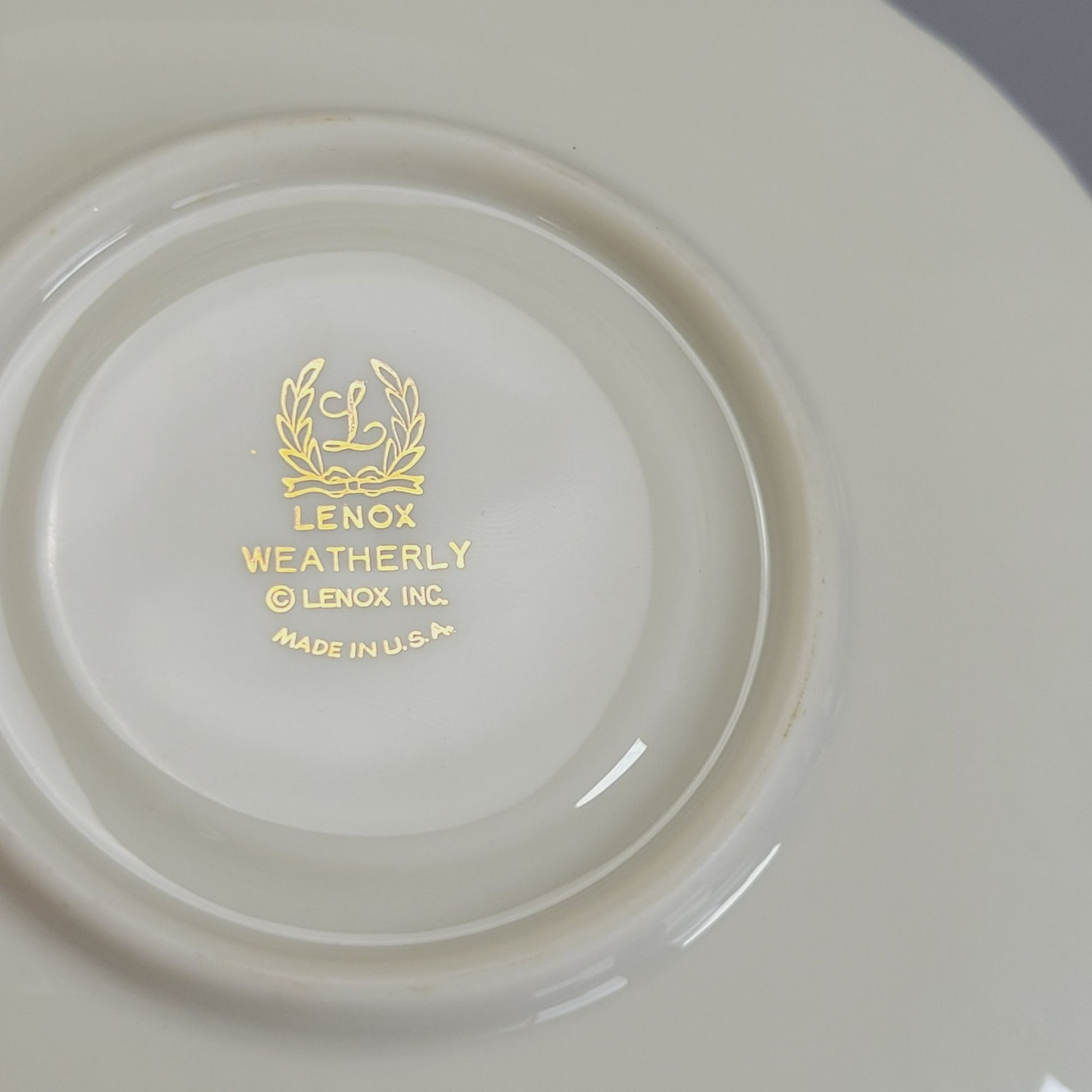 Elegant vintage Lenox Weatherly teacup and saucer with swirled edge and platinum trim, made in the USA. Discontinued, perfect for collectors or as a replacement piece.