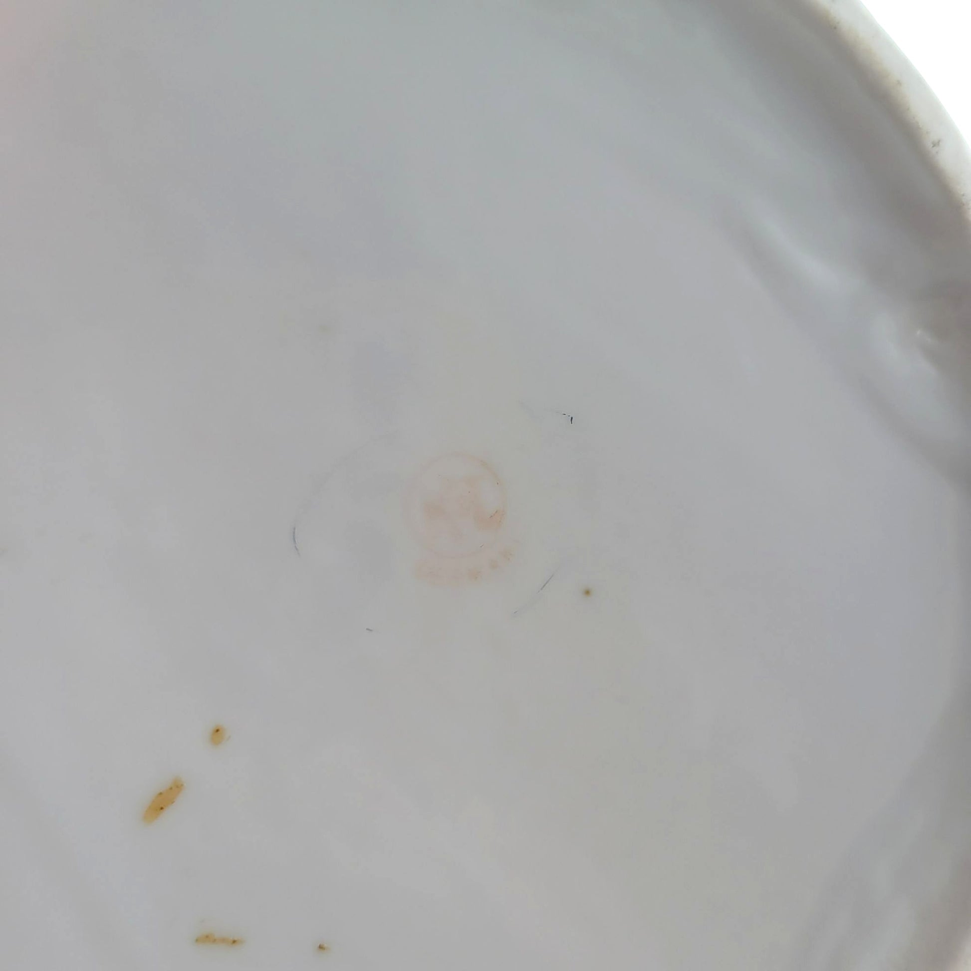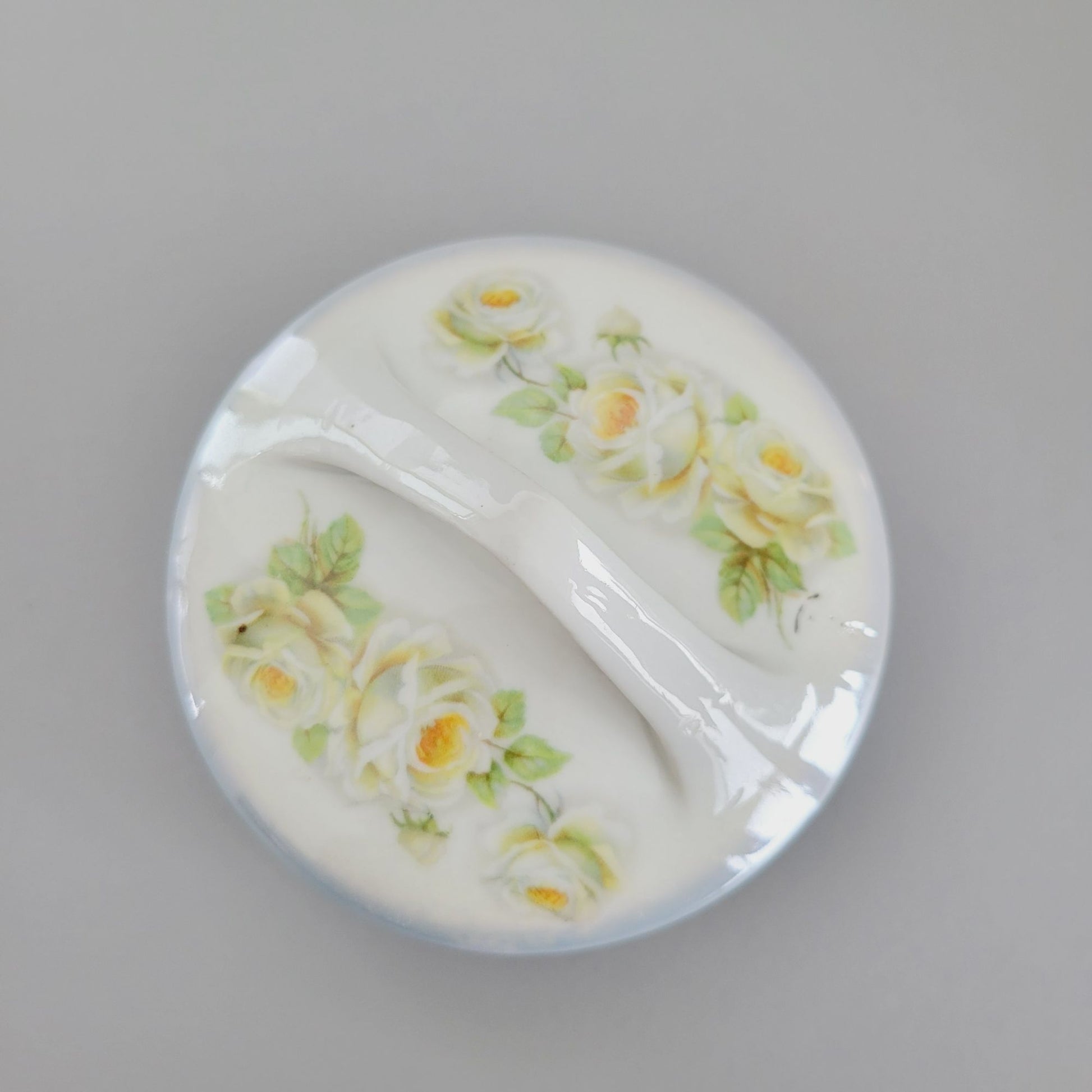 This vintage luster floral biscuit jar features a blue-gray base with white and yellow roses, perfect for porcelain collectors or as a pretty housewarming gift. Made by K&L Germany, it adds a touch of elegance to any home décor.
