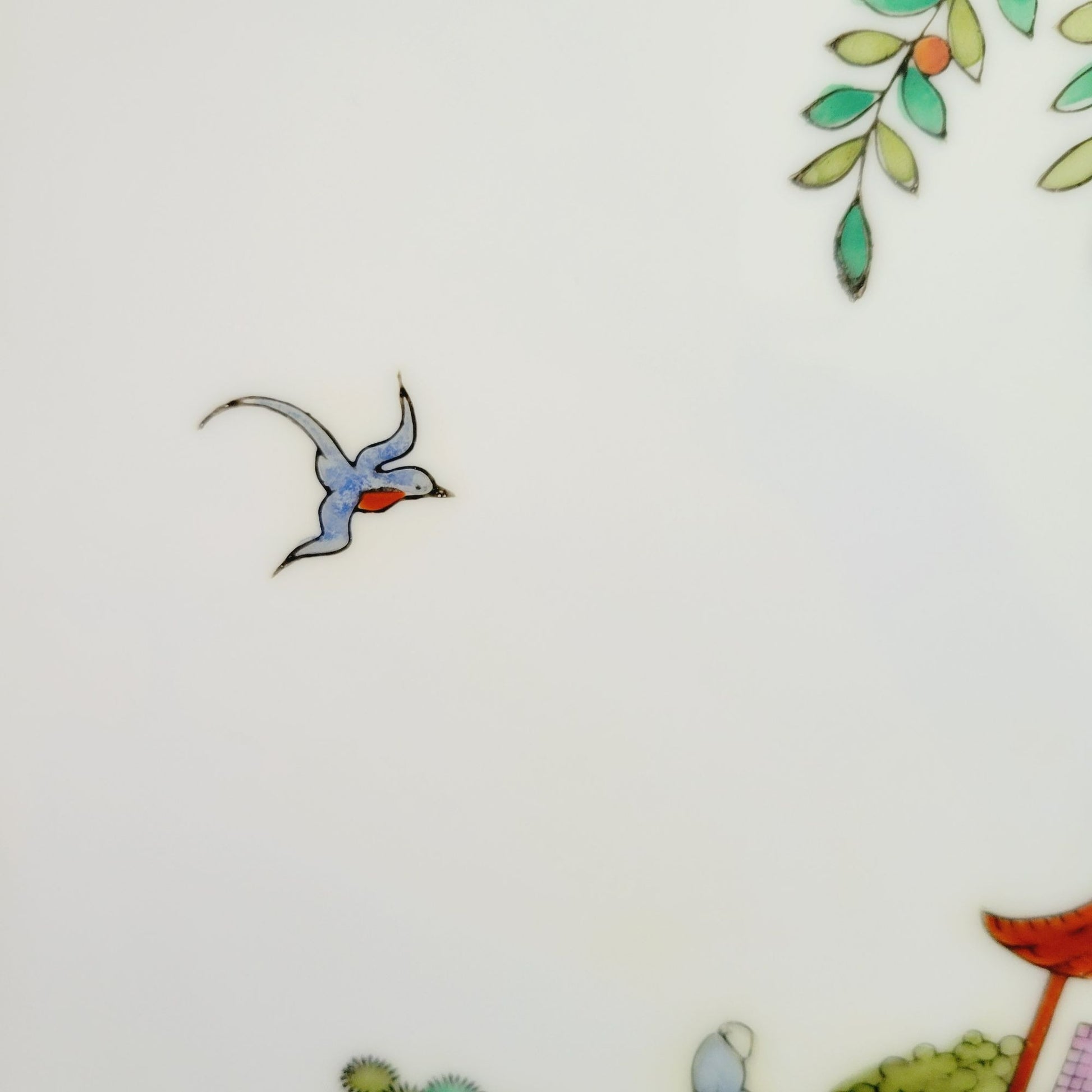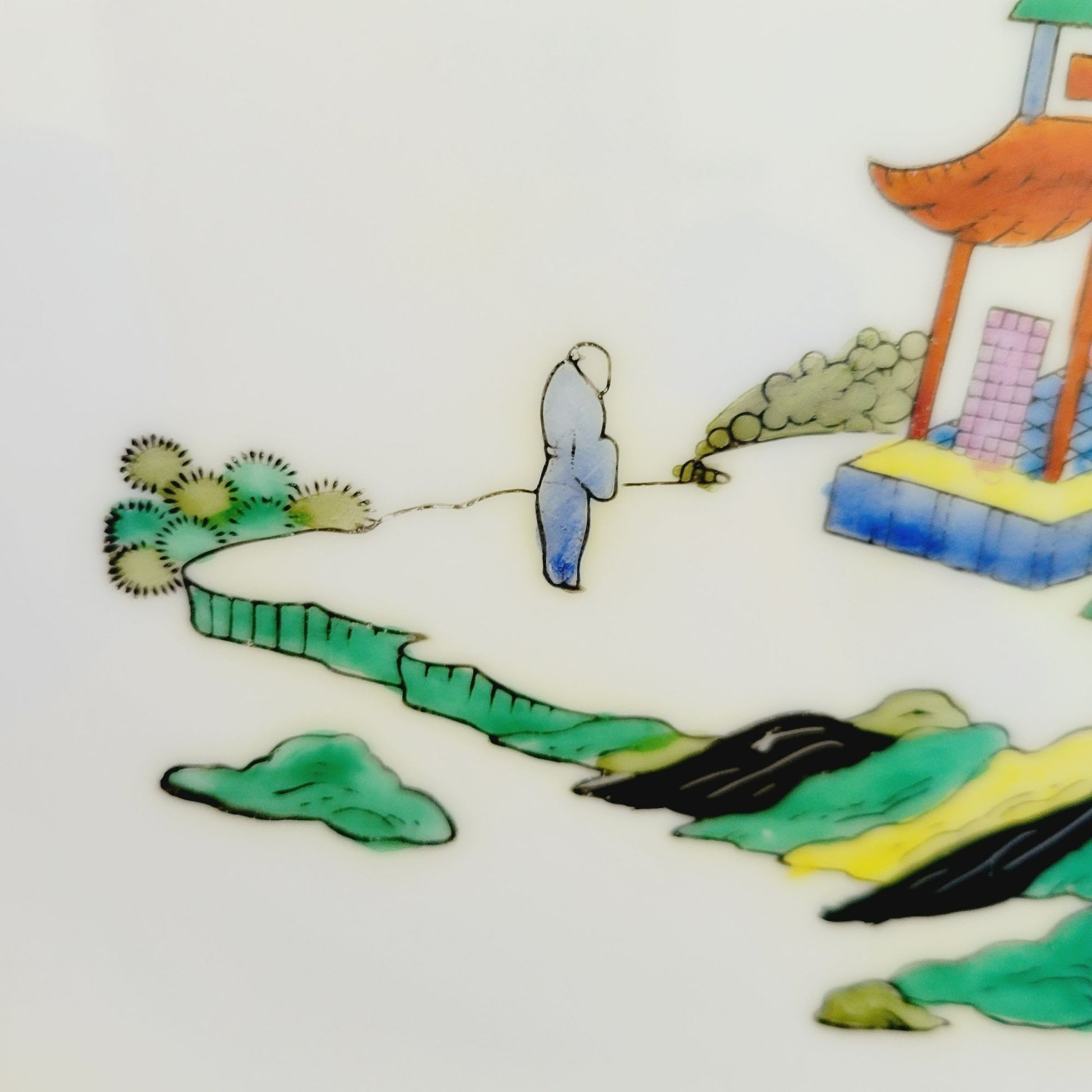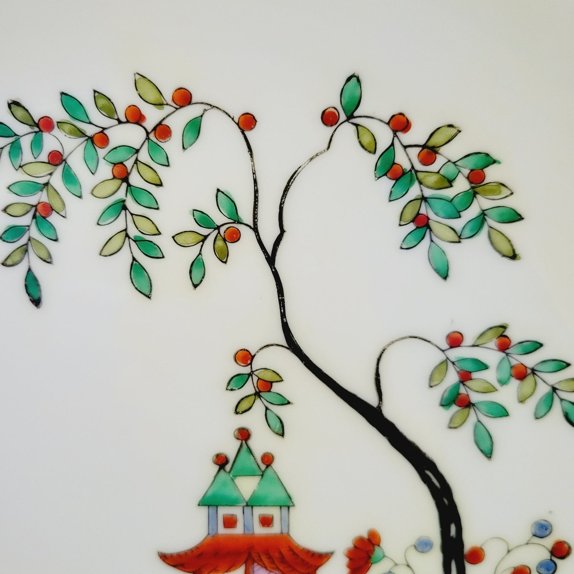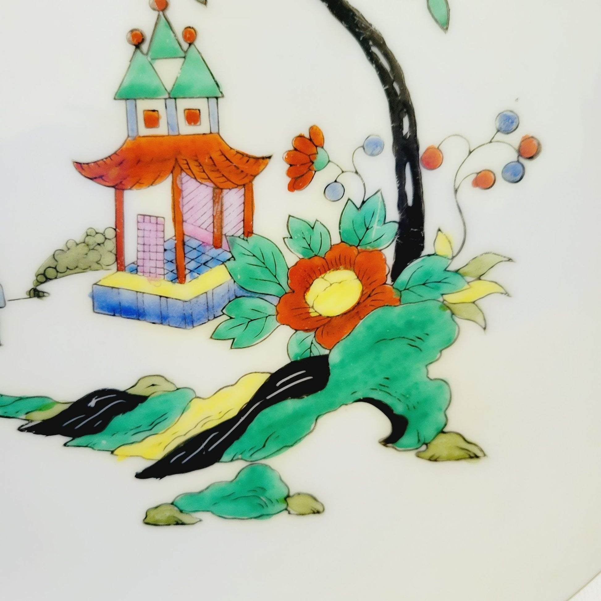 A stunning Noritake porcelain cake plate, c.1920-40 Morimura Mark, showcasing a vibrant Asian landscape scene. The plate is beautifully painted in hues of green, red, and blue. Made in Japan, it's an exquisite vintage home decor gift.