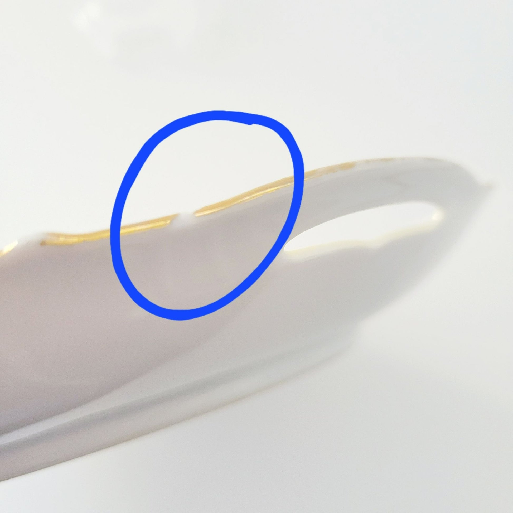 There are no cracks, however on small flea-bite chip on the edge (see photo). There is also wear along the gold trim.