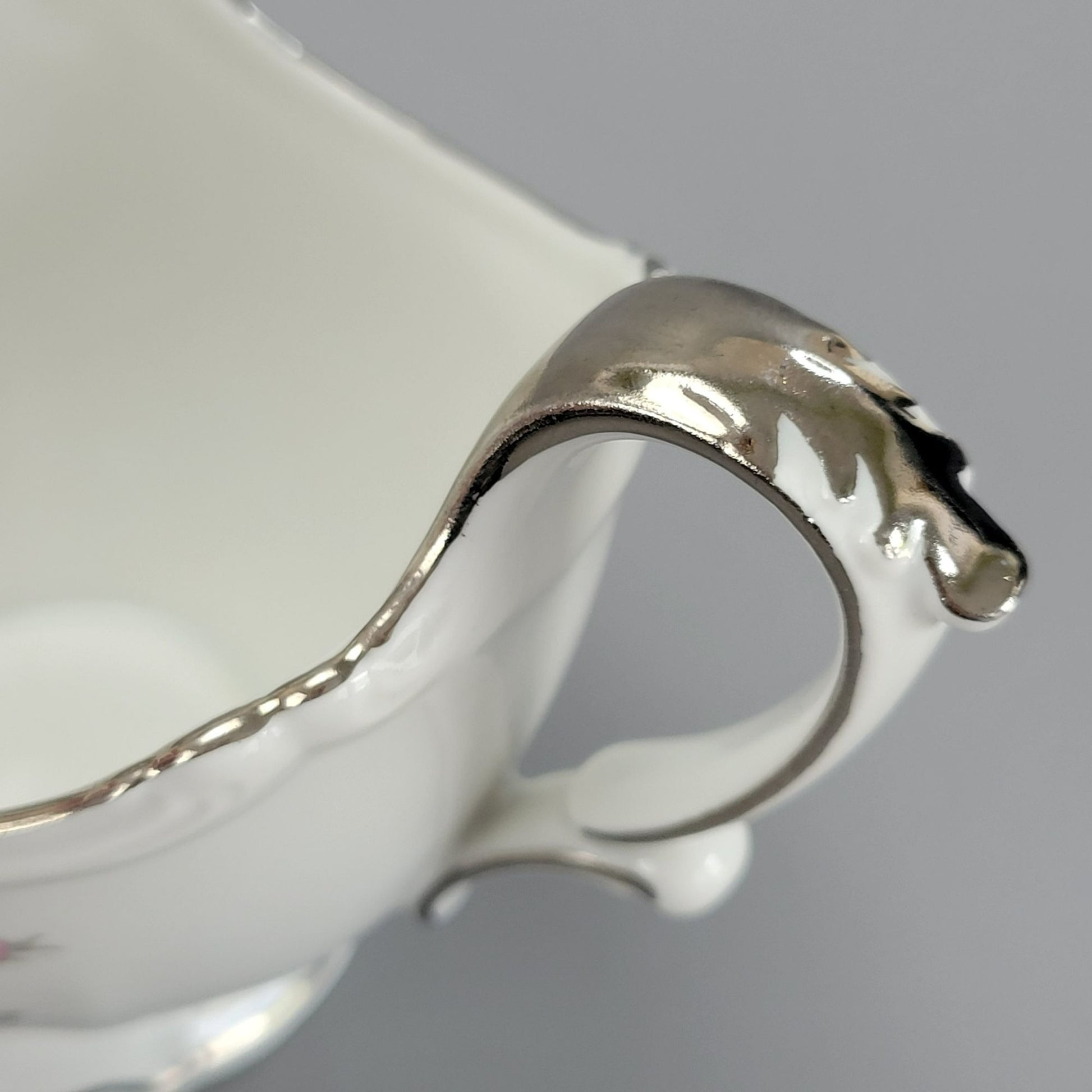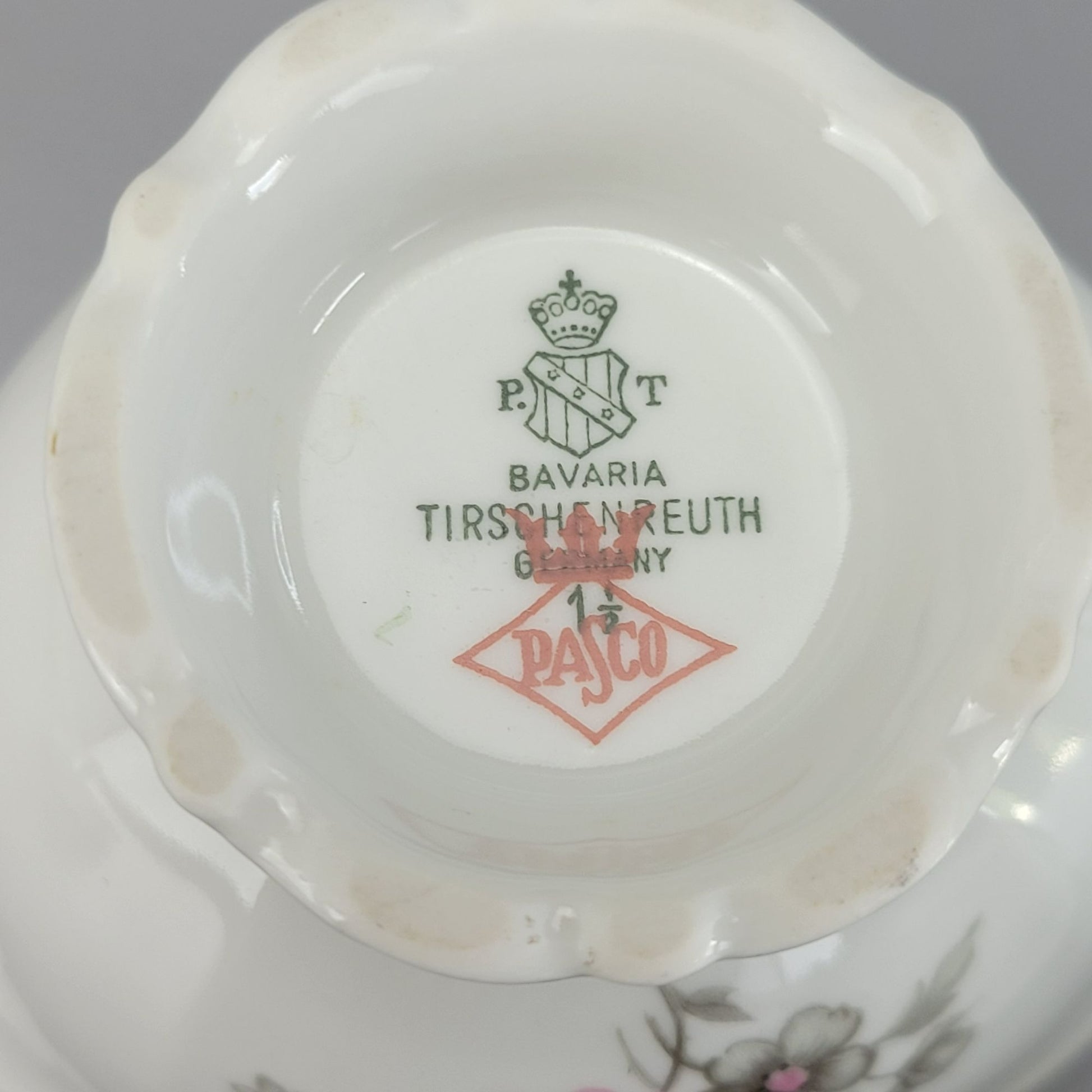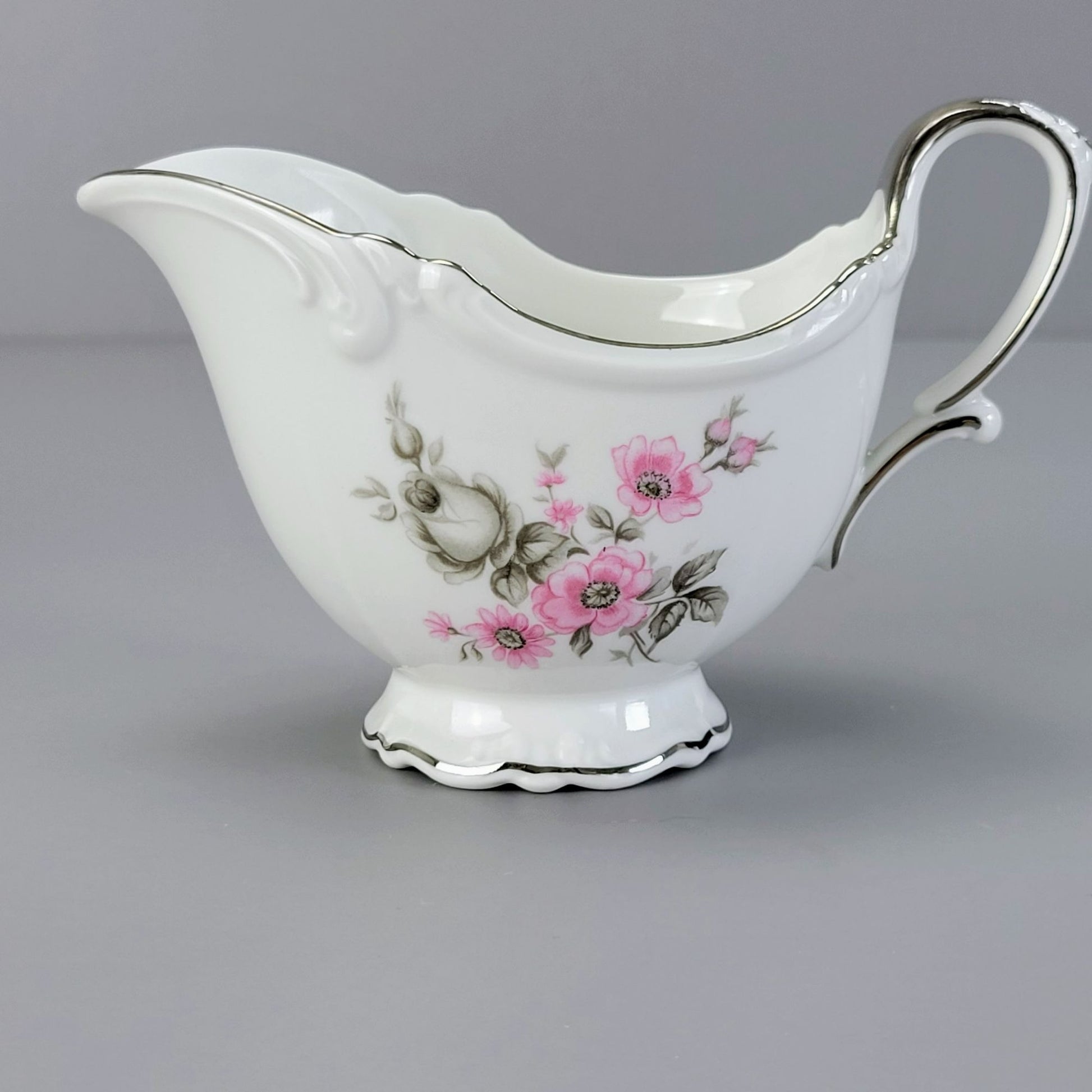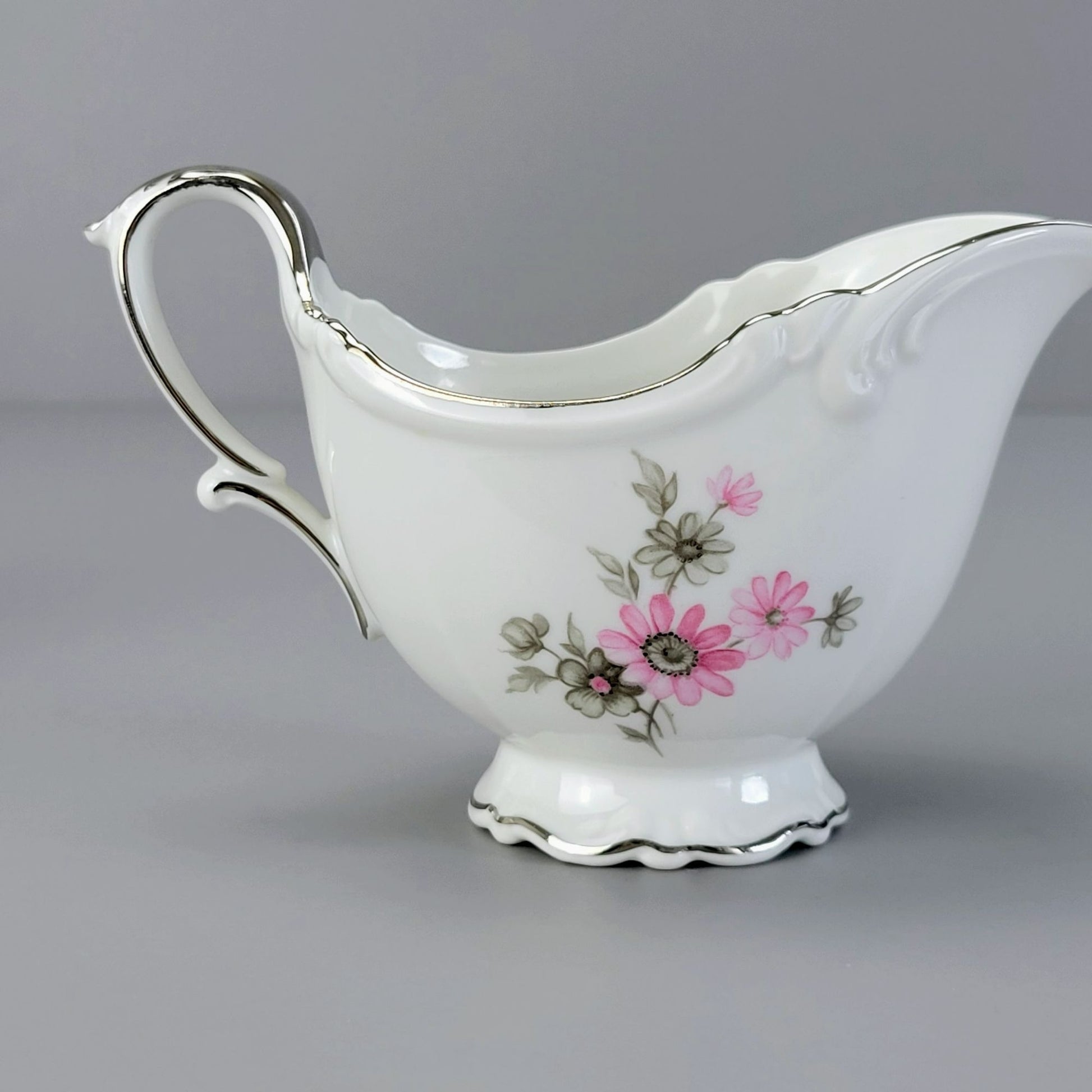 This Tirschenreuth Picardy Sugar Bowl and Creamer from Bavaria Germany features Pasco Marking and dates back to c.1969. It's a piece of elegant pink and silver floral drinkware, made from porcelain the creamer pitcher has a capacity of 6fl. oz.