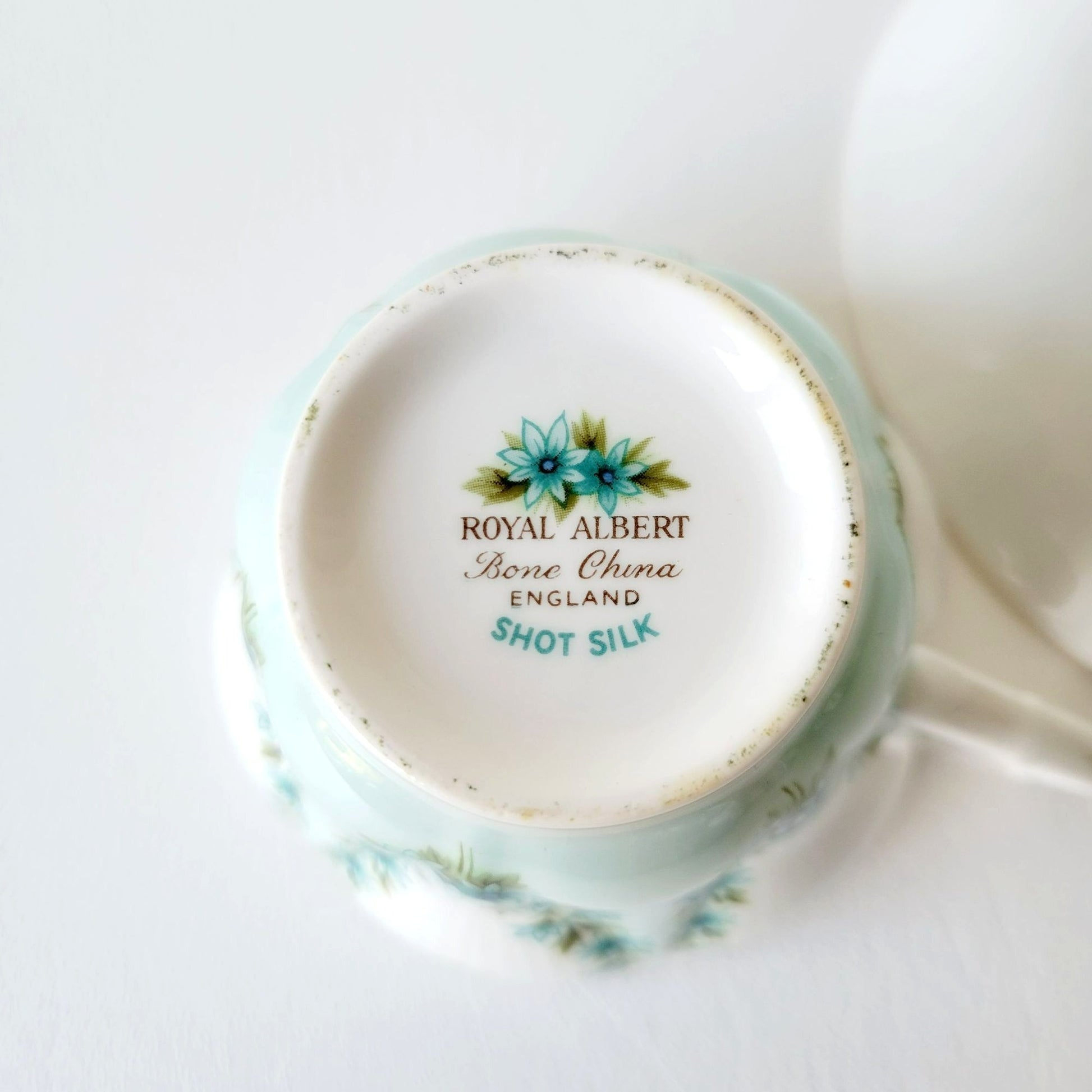 Vintage Royal Albert Shot Silk Teacup & Saucer, a striking White and Mint Floral Design edged with Gold Trim. Made from Bone China, this piece adds a touch of English elegance to any tea time.