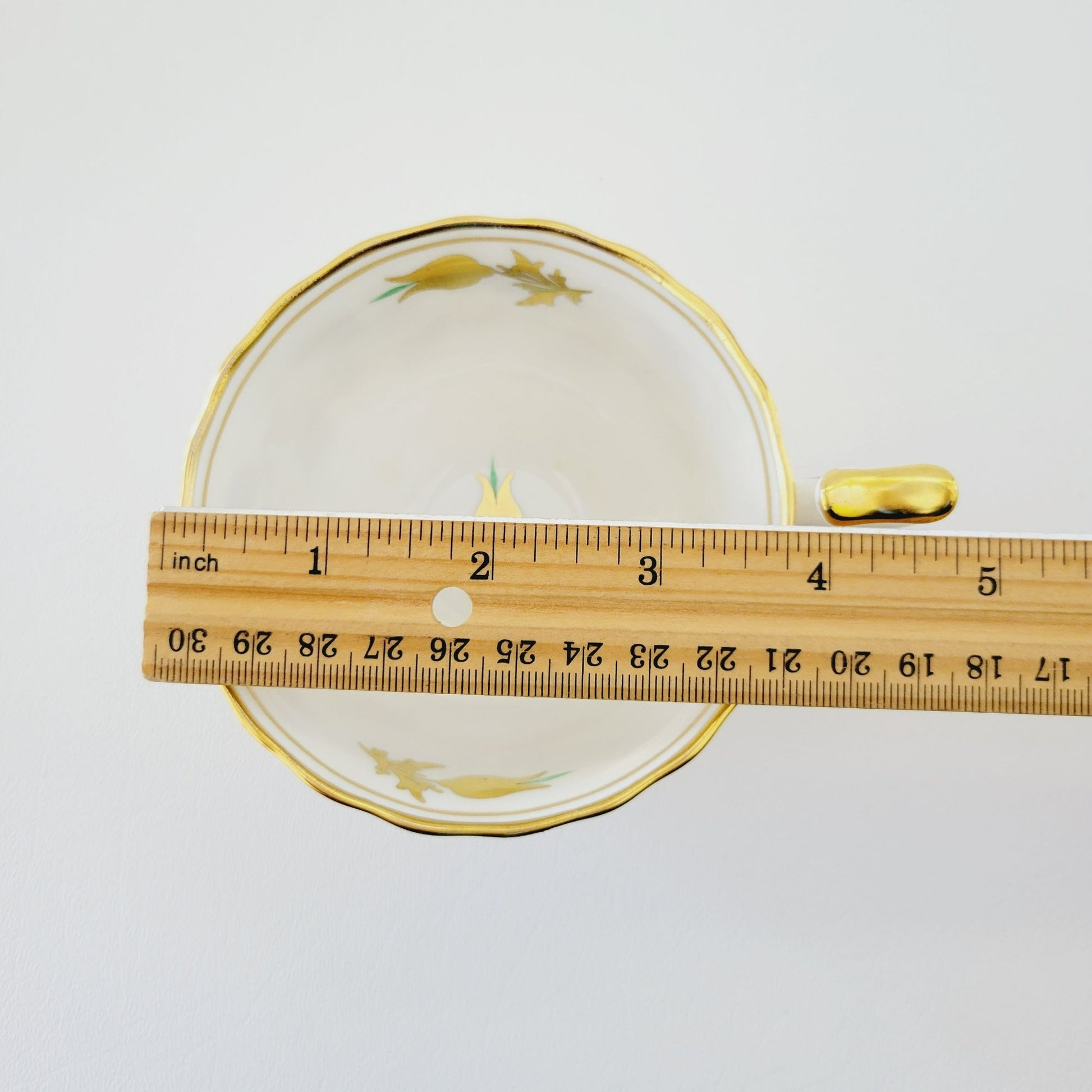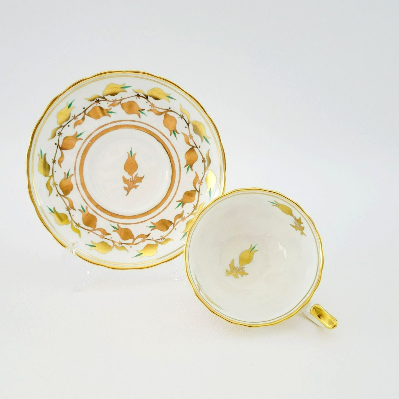 This Royal Chelsea Golden Jade Teacup & Saucer features exquisite gold vines and flowers on fine bone china. Made in England, it adds a vintage touch to any tea party.