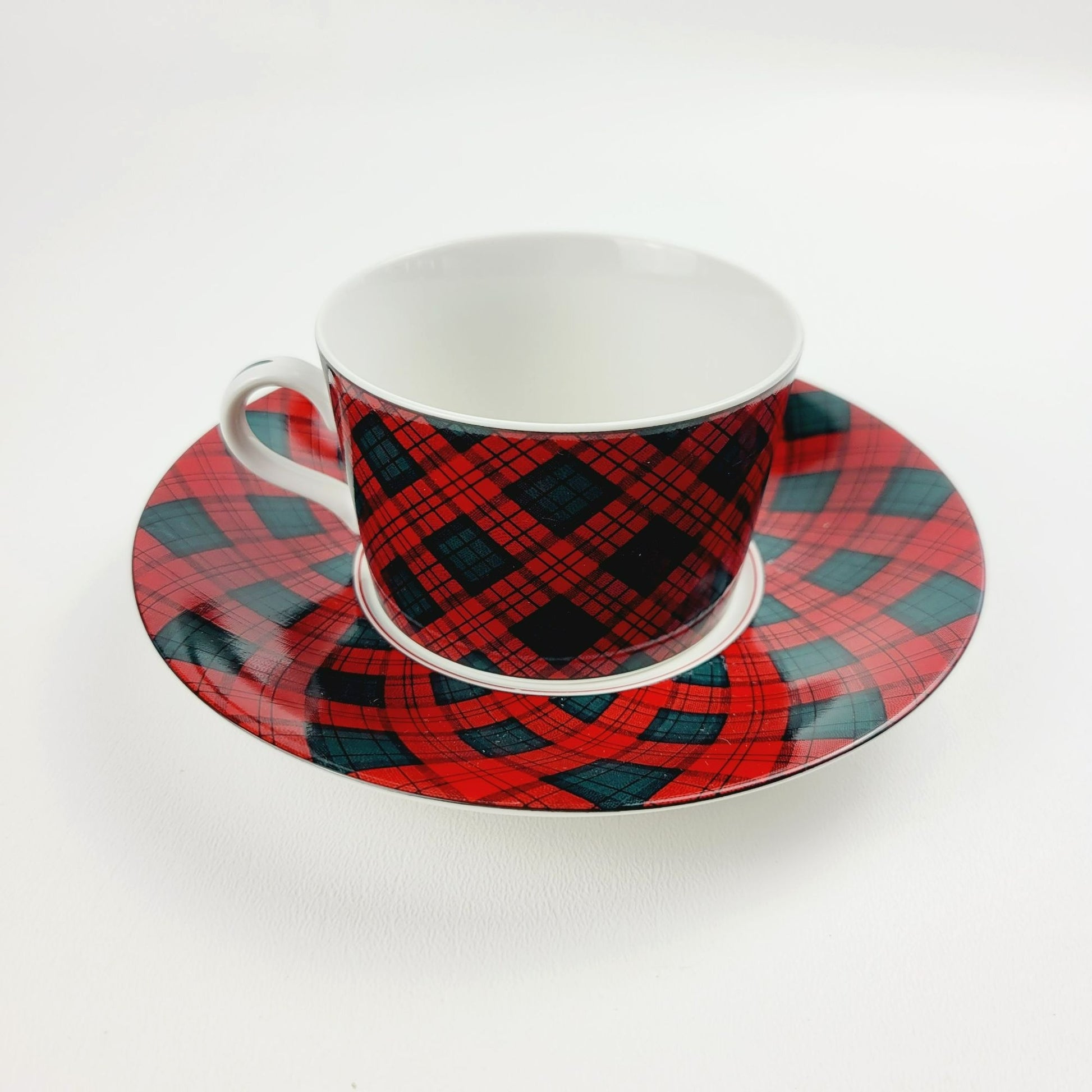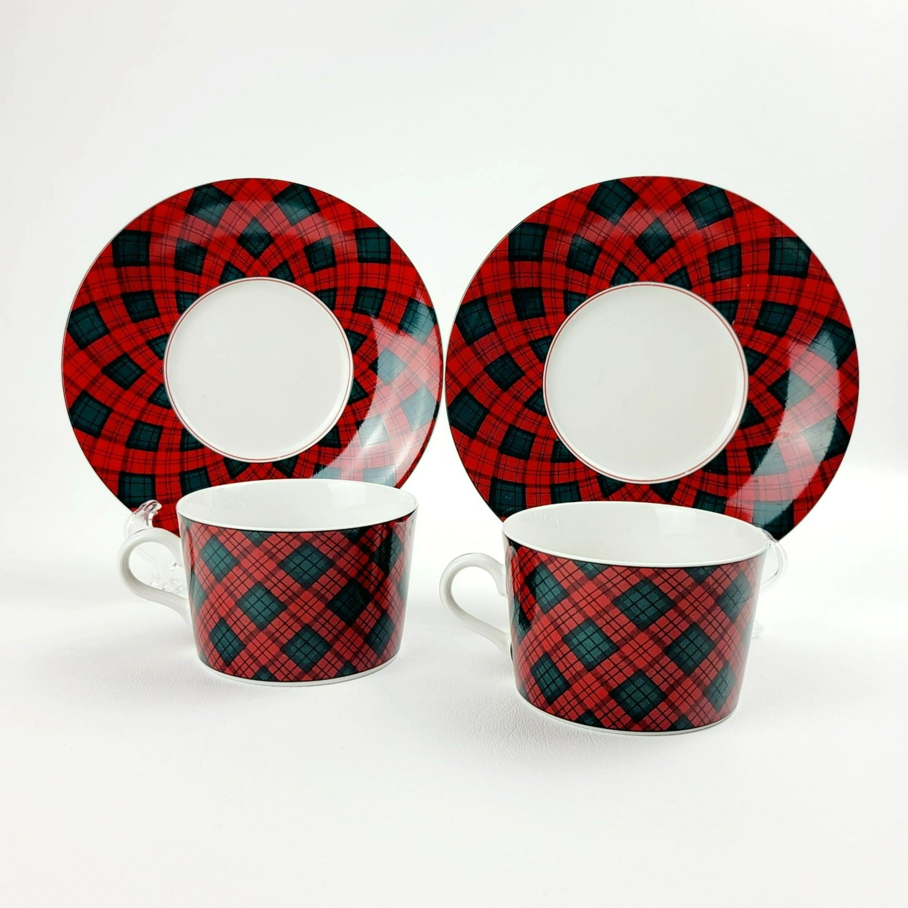 Vintage Sasaki Tartan Cup & Saucer Sets featuring a classic red and dark green plaid design by Charles Roberts. Made in Japan in the 1990s, these elegant, discontinued pieces are perfect for collectors or as replacement drinkware.