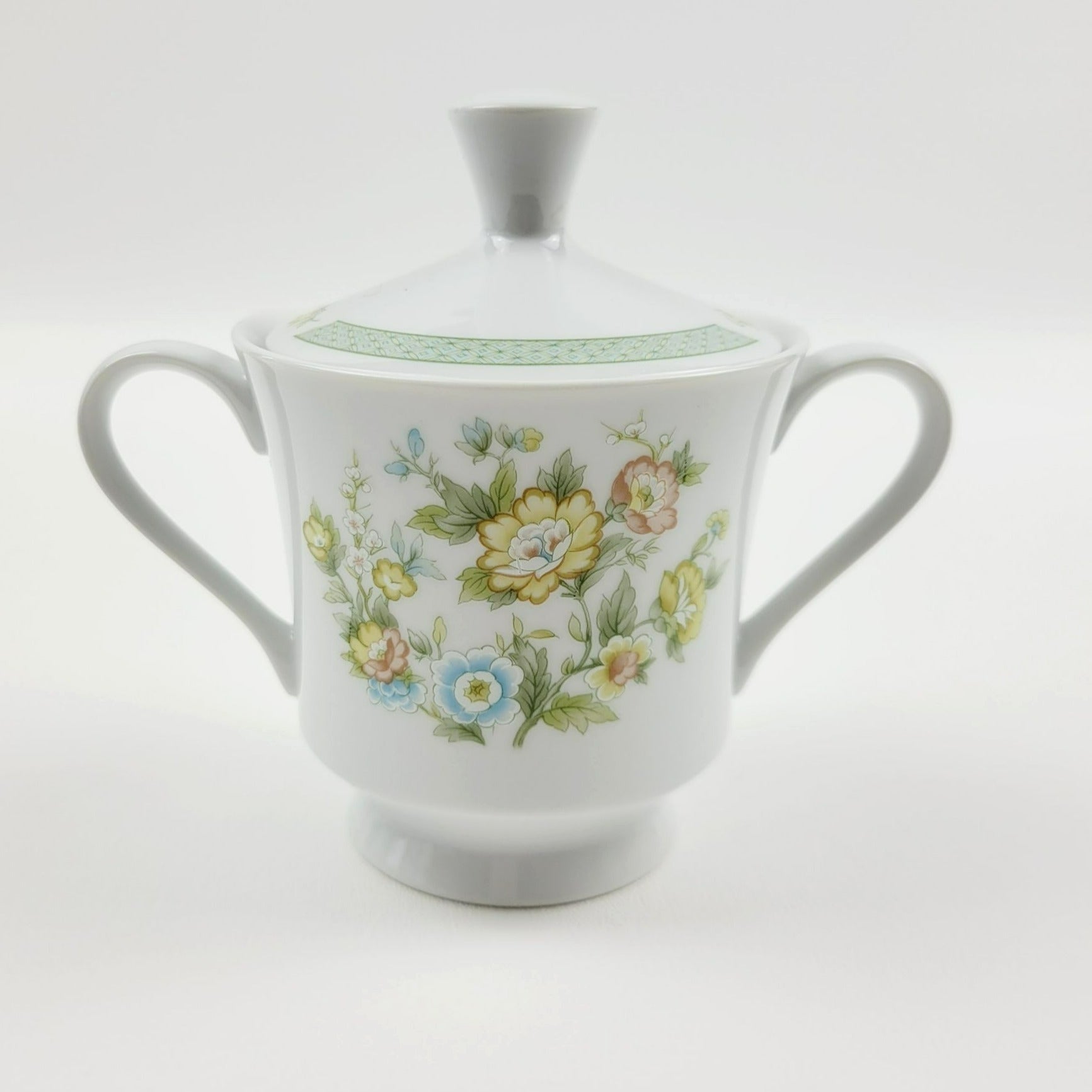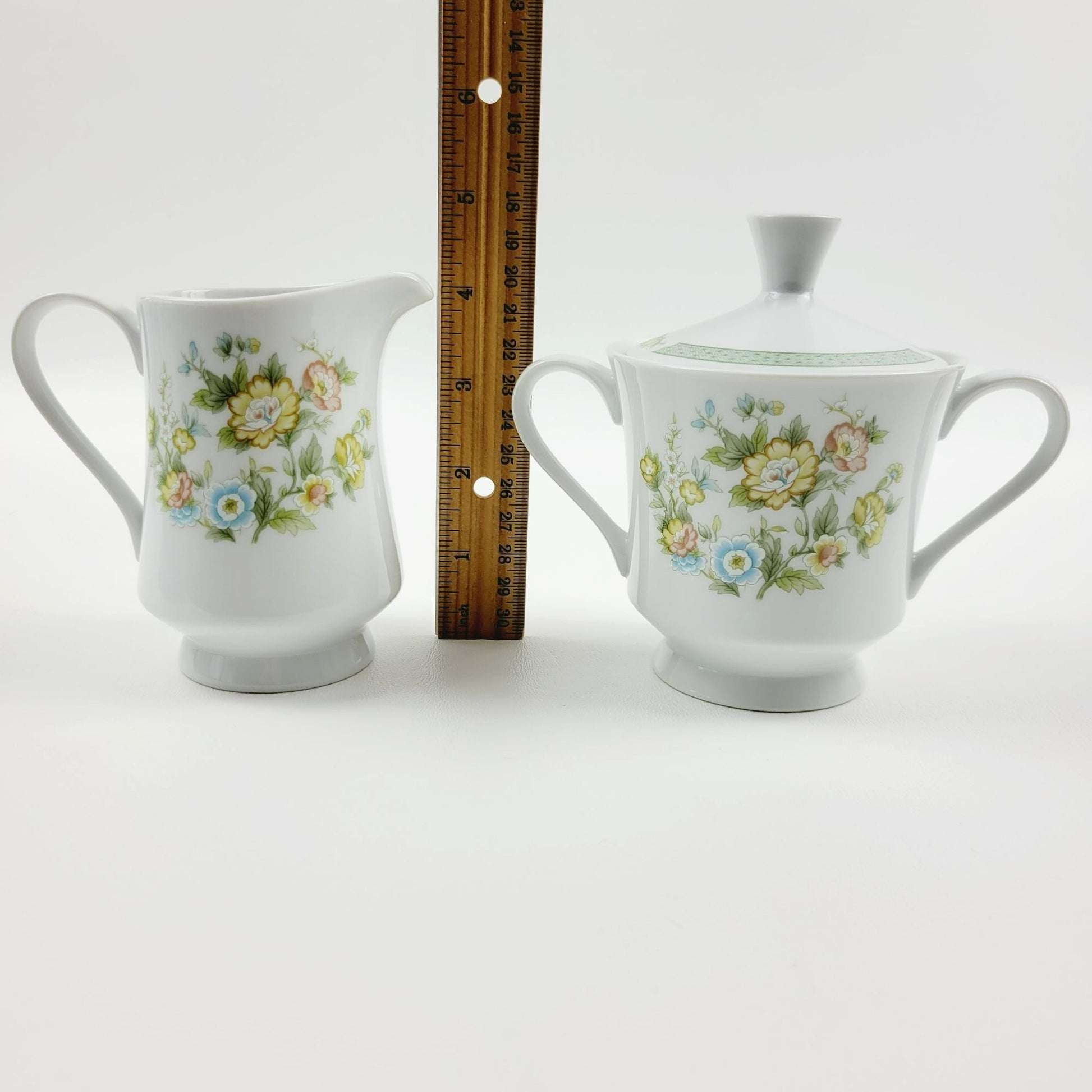 Indulge in the elegant craftsmanship of the Fashion Royale Ashley Creamer & Sugar Bowl. This Spring Floral Dinnerware, made in Japan, boasts a delicate pastel floral design & green accents, perfect for any tea party.