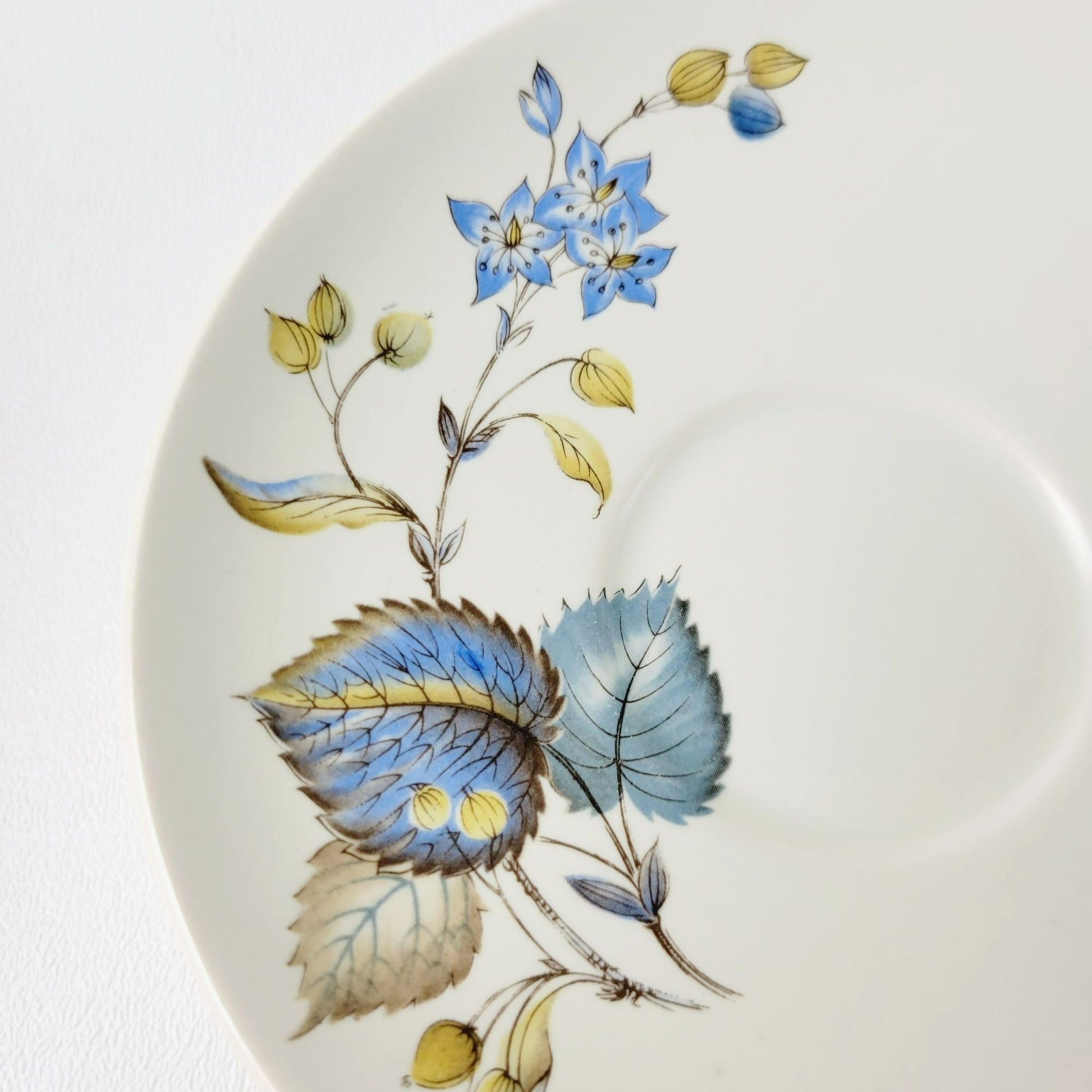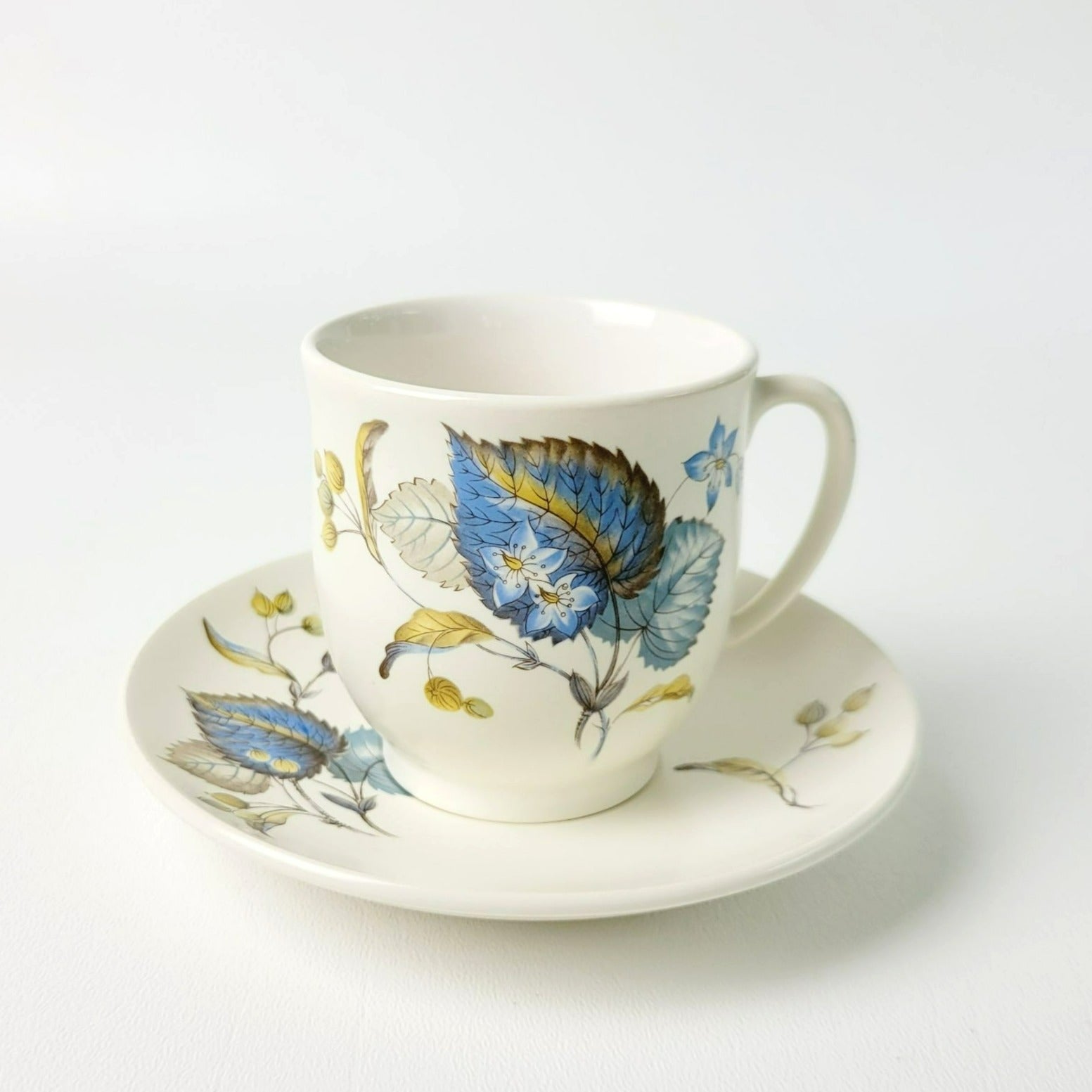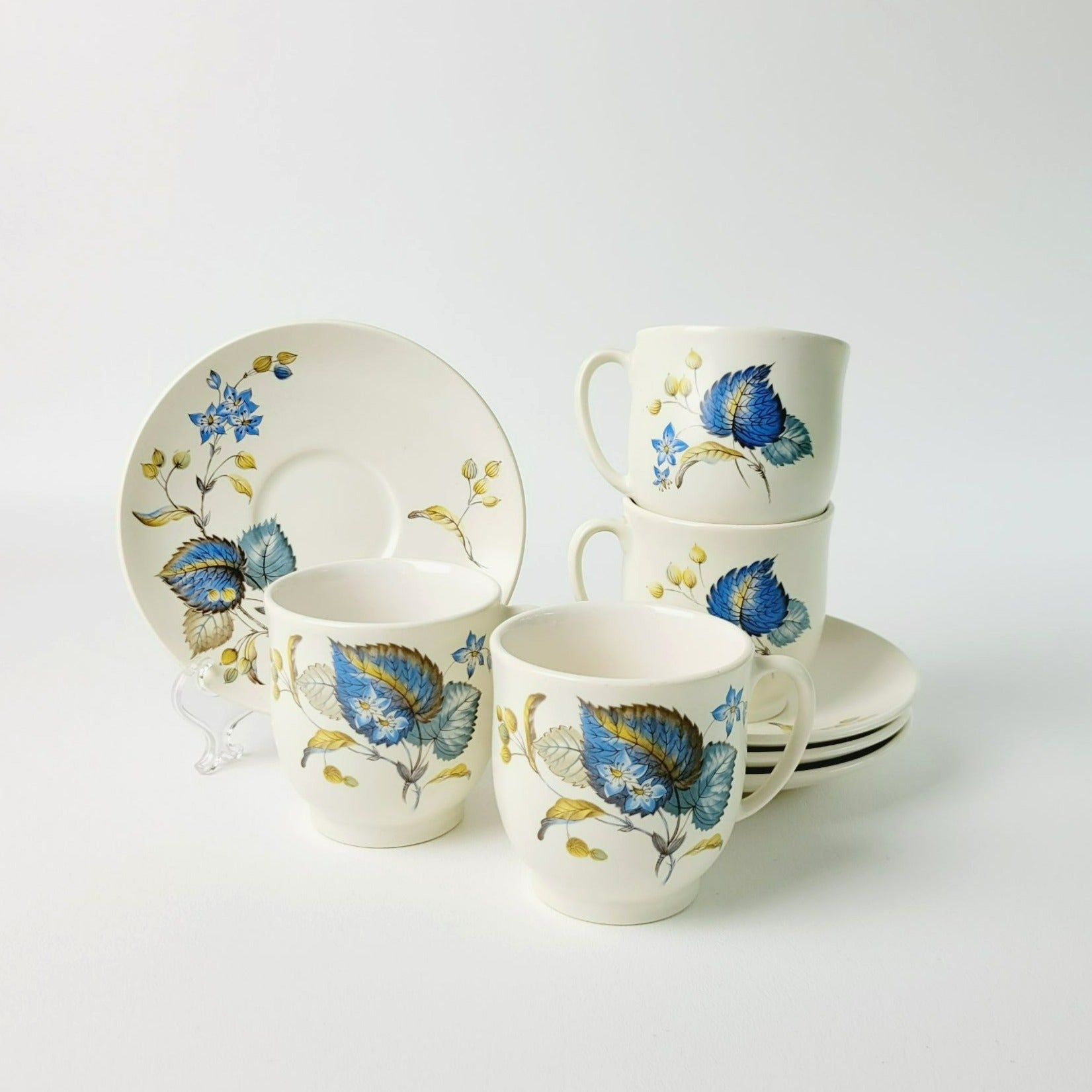 Elegant 1960s SylvaC Lime Grove Tea Cup & Saucer Sets, with four cups and saucers that feature a blue floral and foliage design. Crafted from ceramic, these beige, blue, and green 6fl. oz. tea sets are a charming, vintage addition to any kitchen.