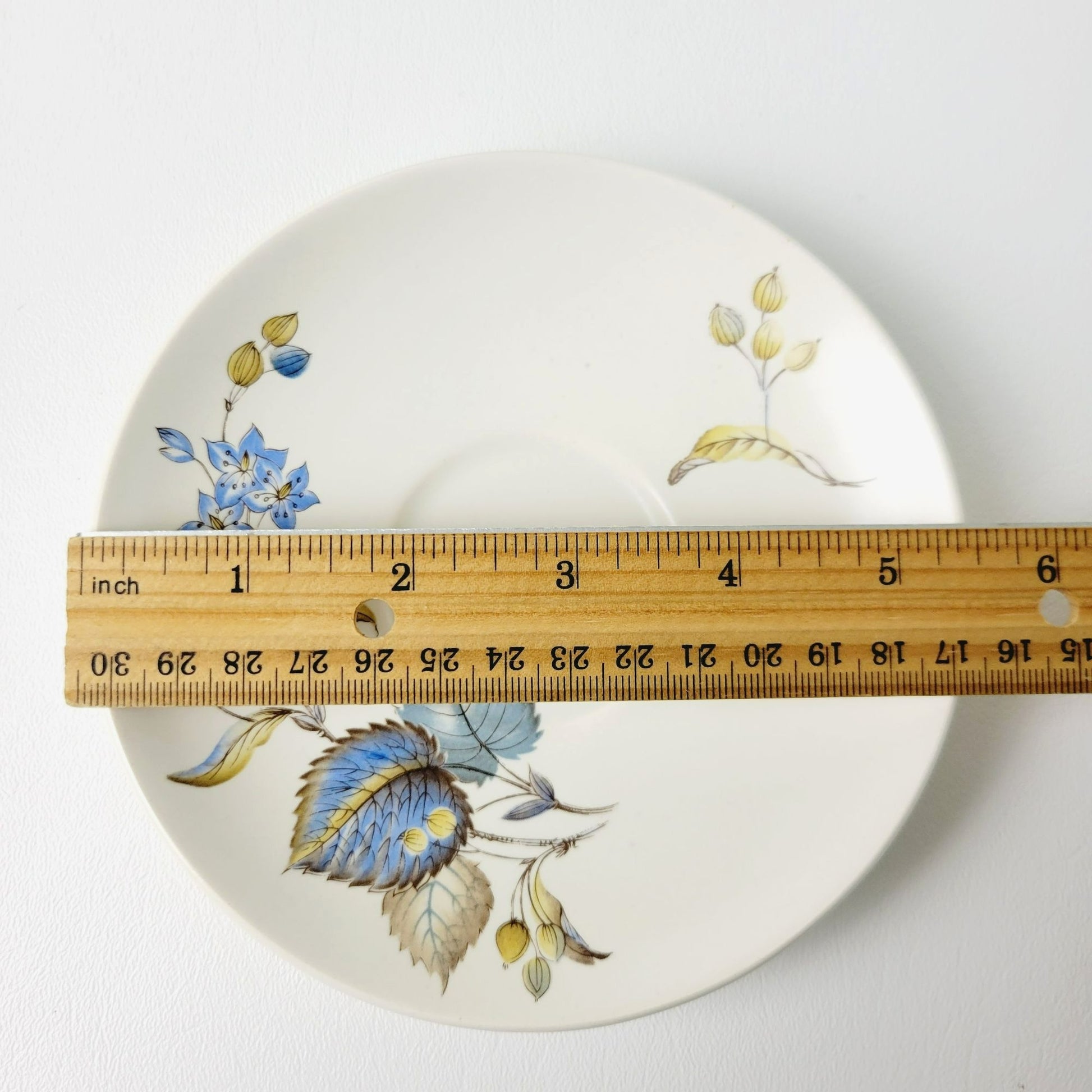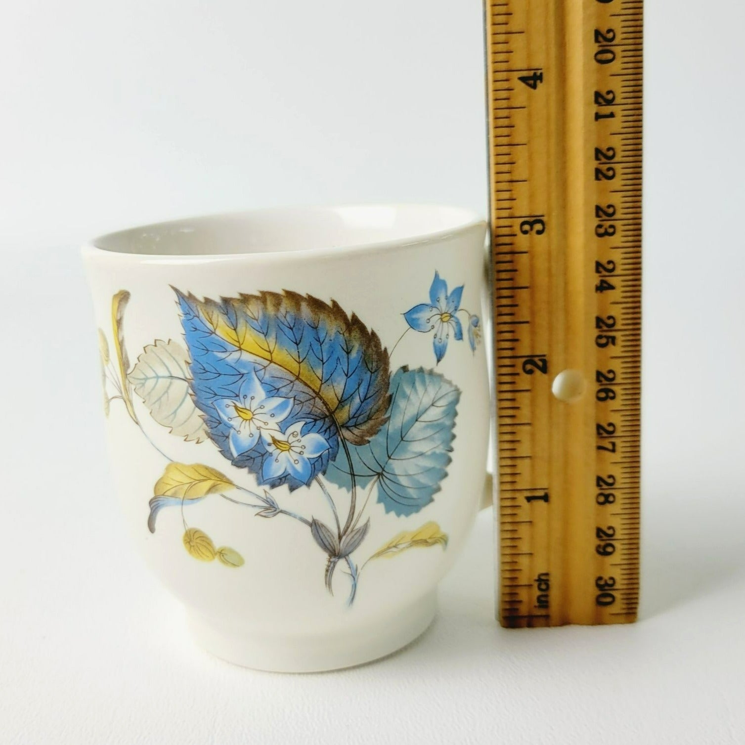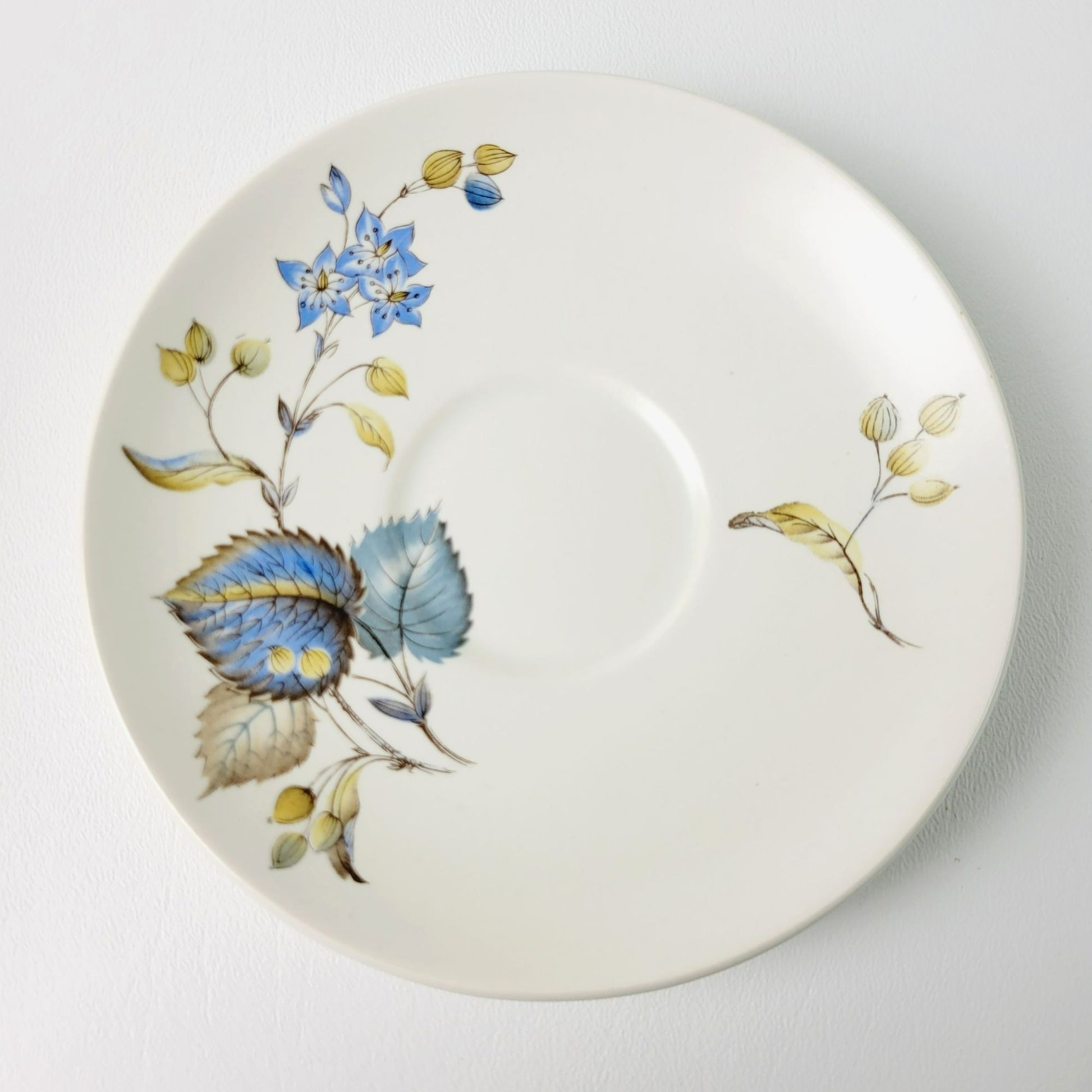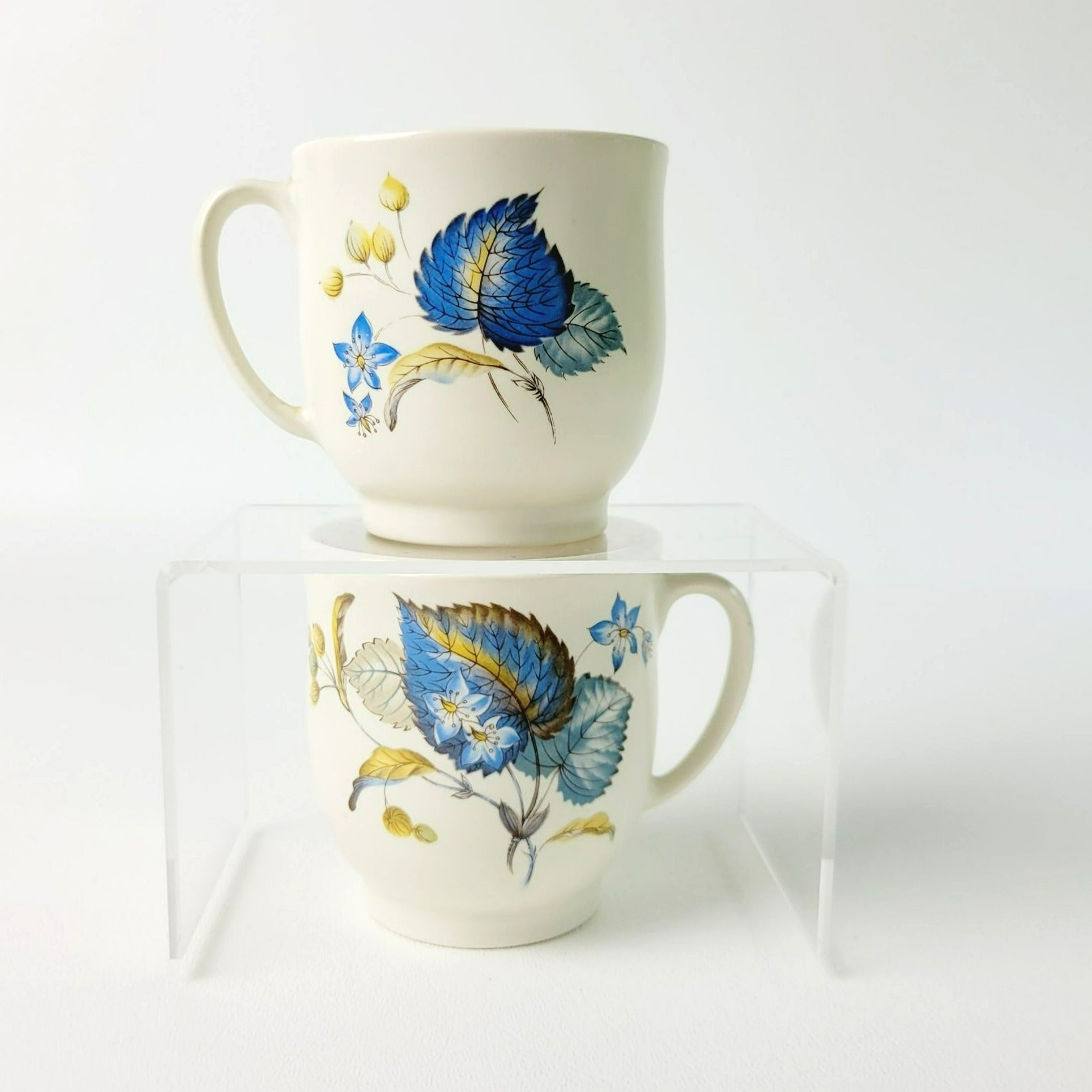 Elegant 1960s SylvaC Lime Grove Tea Cup & Saucer Sets, with four cups and saucers that feature a blue floral and foliage design. Crafted from ceramic, these beige, blue, and green 6fl. oz. tea sets are a charming, vintage addition to any kitchen.