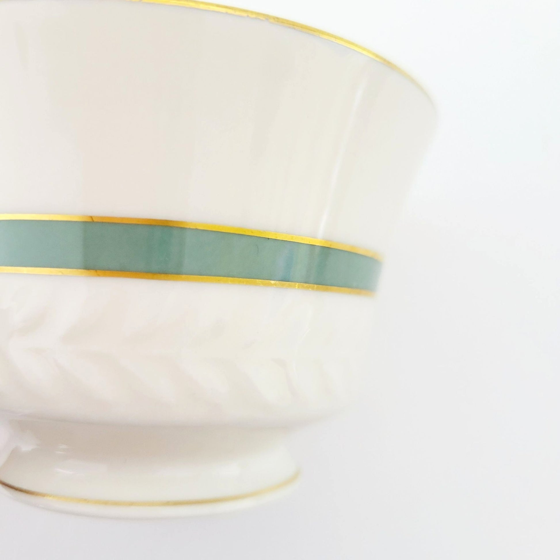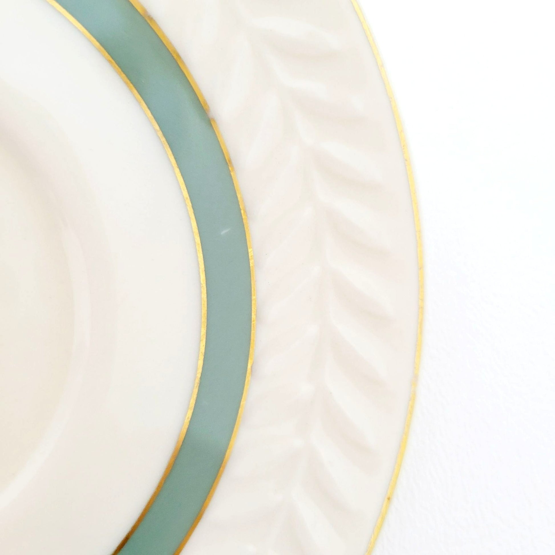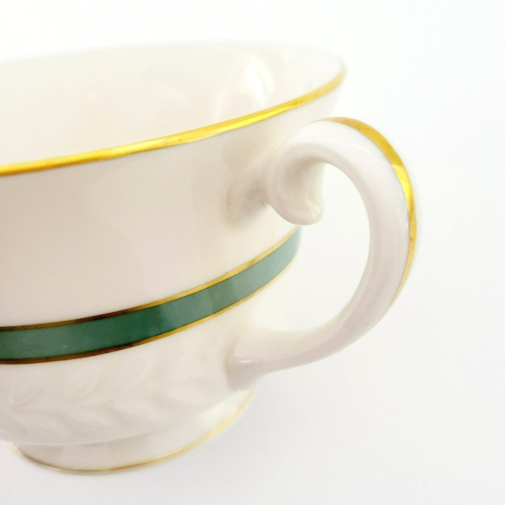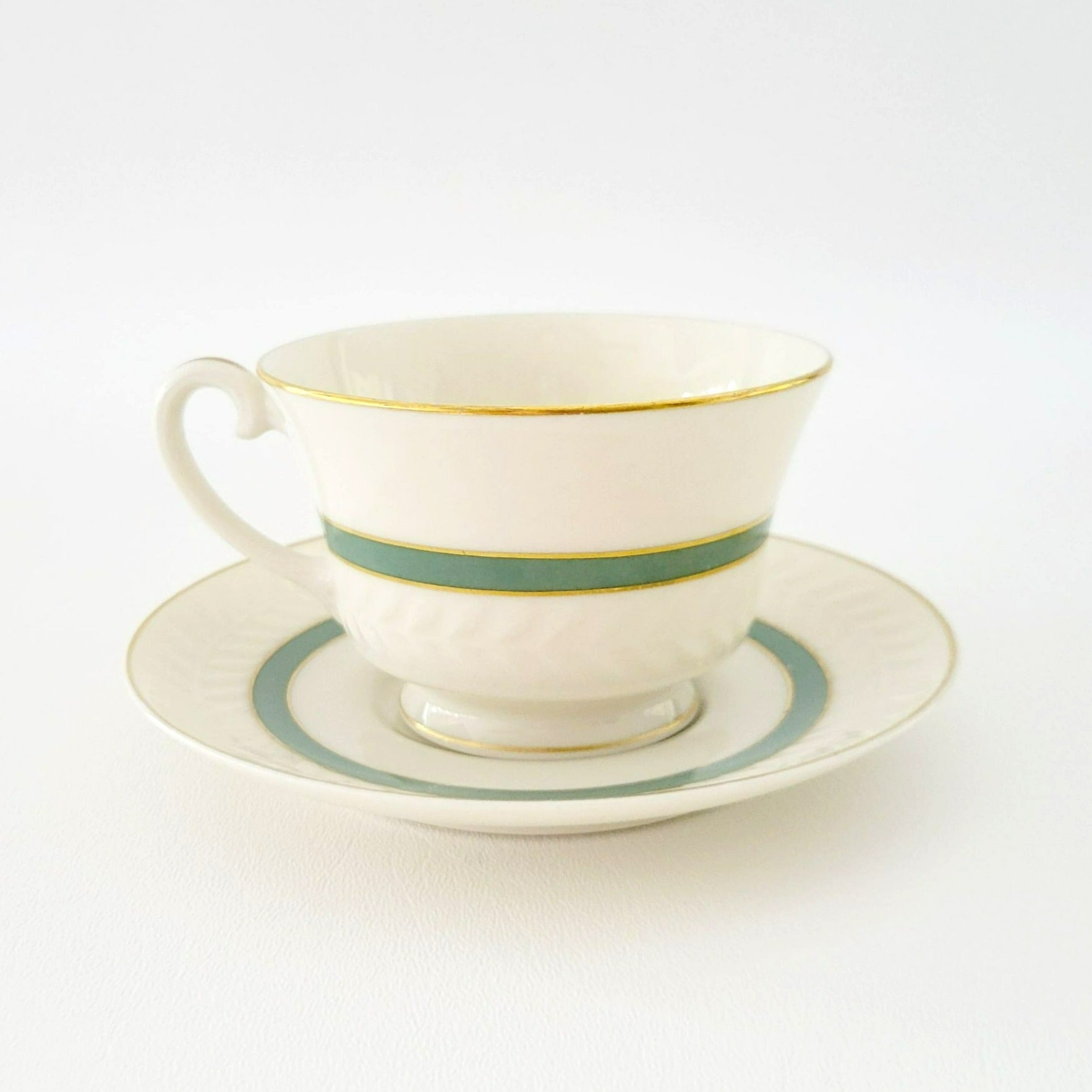 This Theodore Haviland New York teacup and saucer set will add elegance to your tea time. Featuring the Brighton Turquoise pattern with gold trim, green band, and embossed leaf pattern. Made in USA from porcelain, these pieces are off-white, green, and gold.