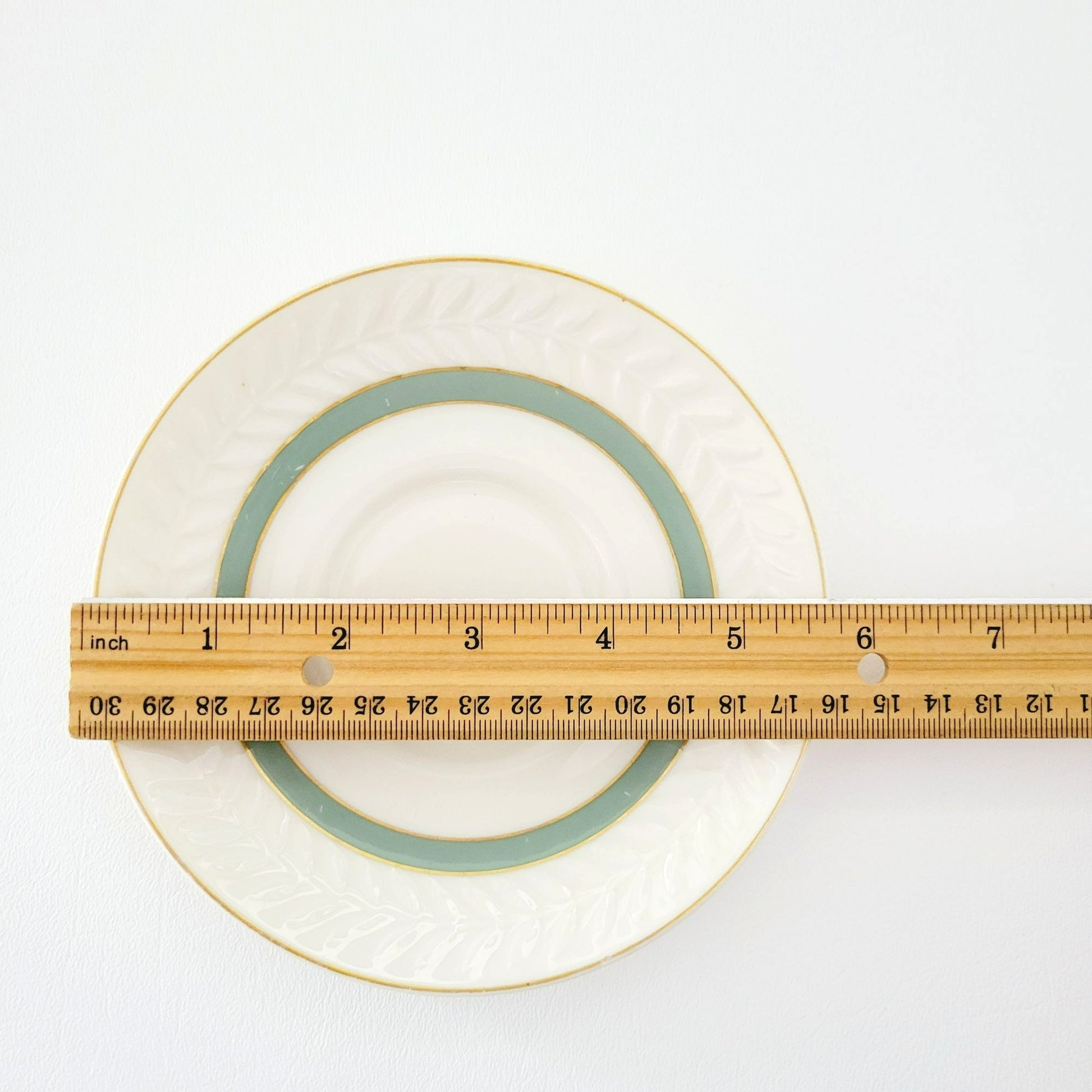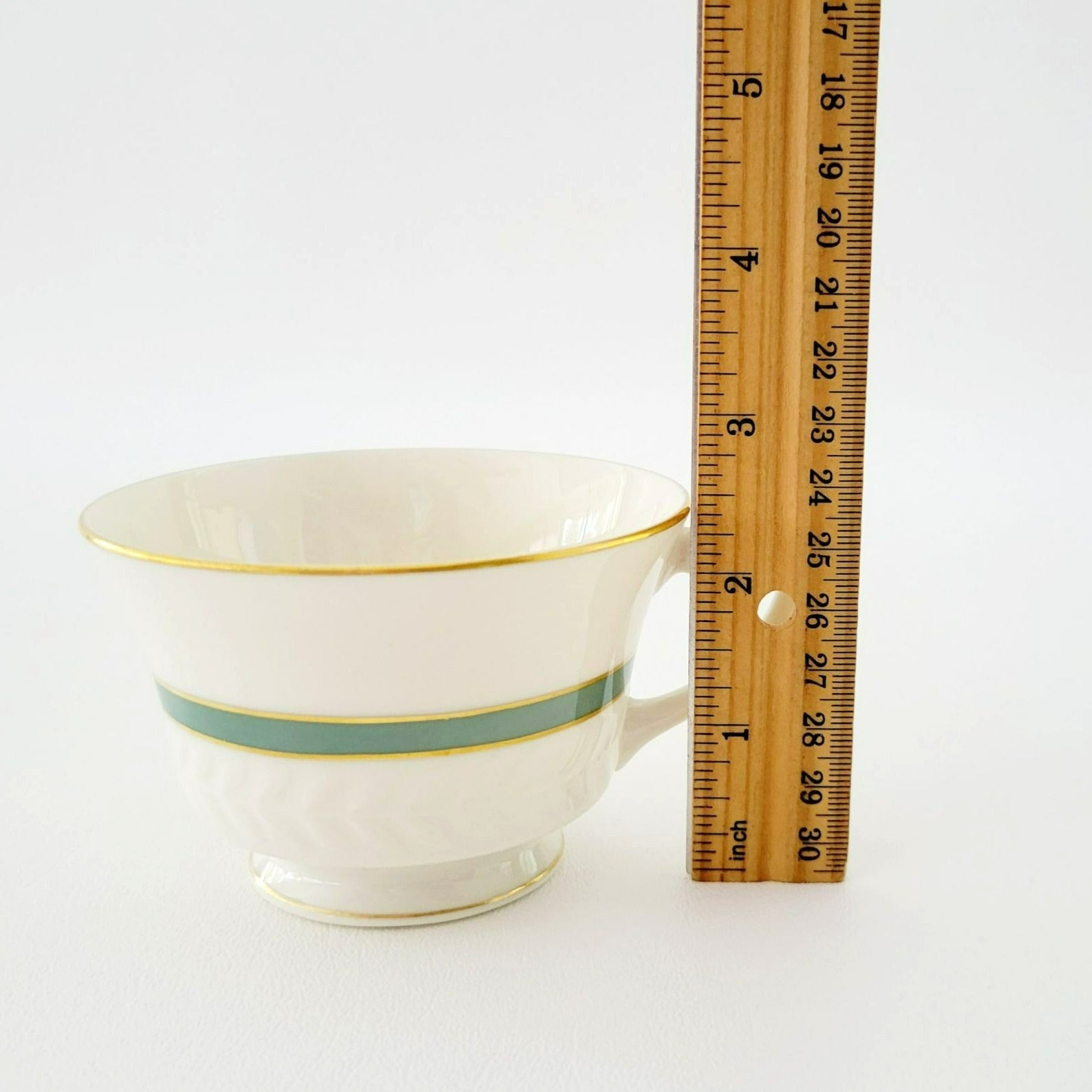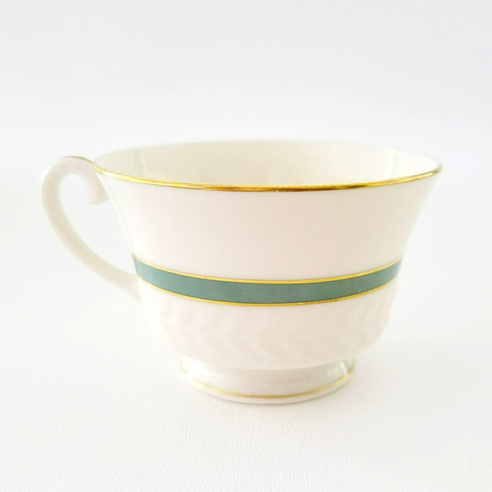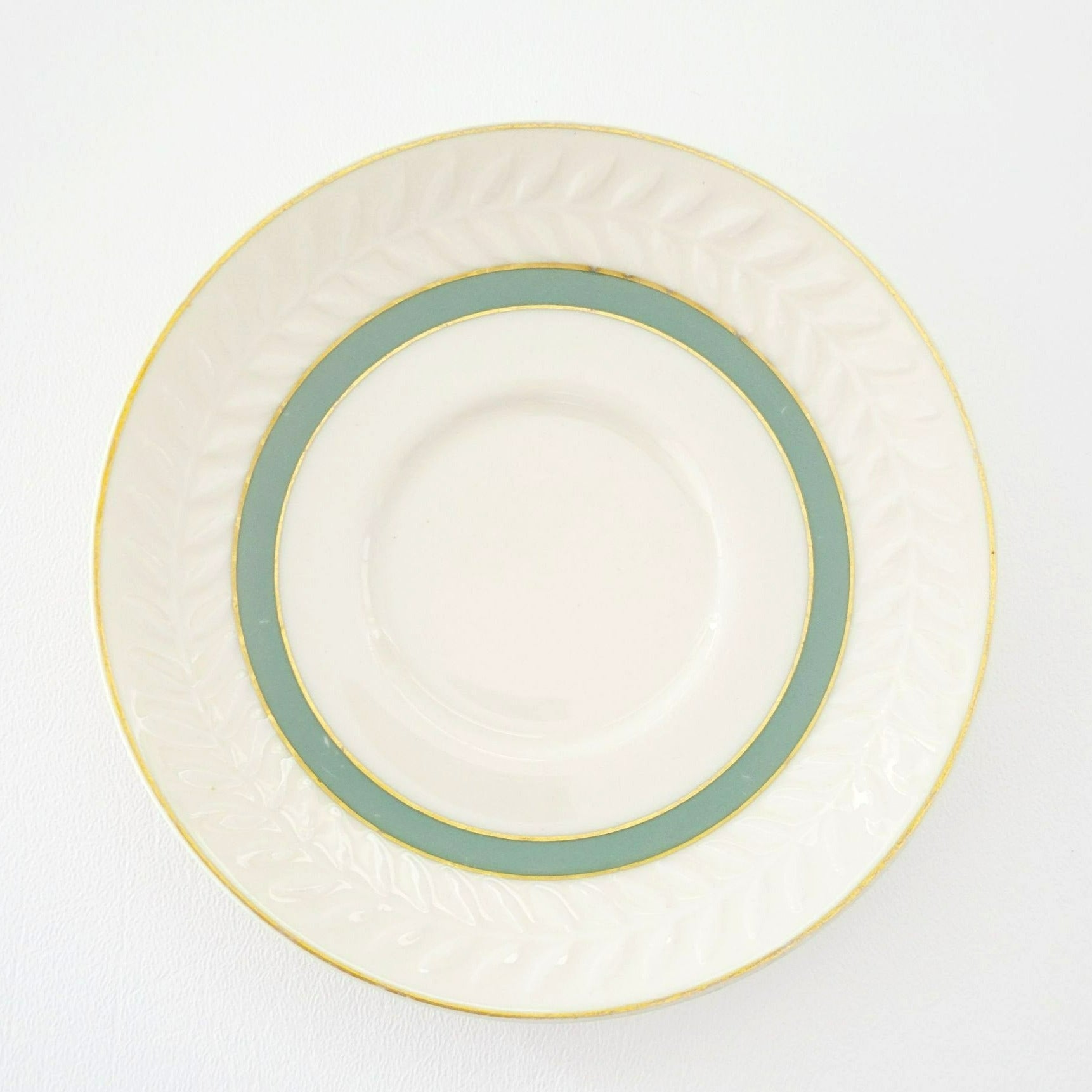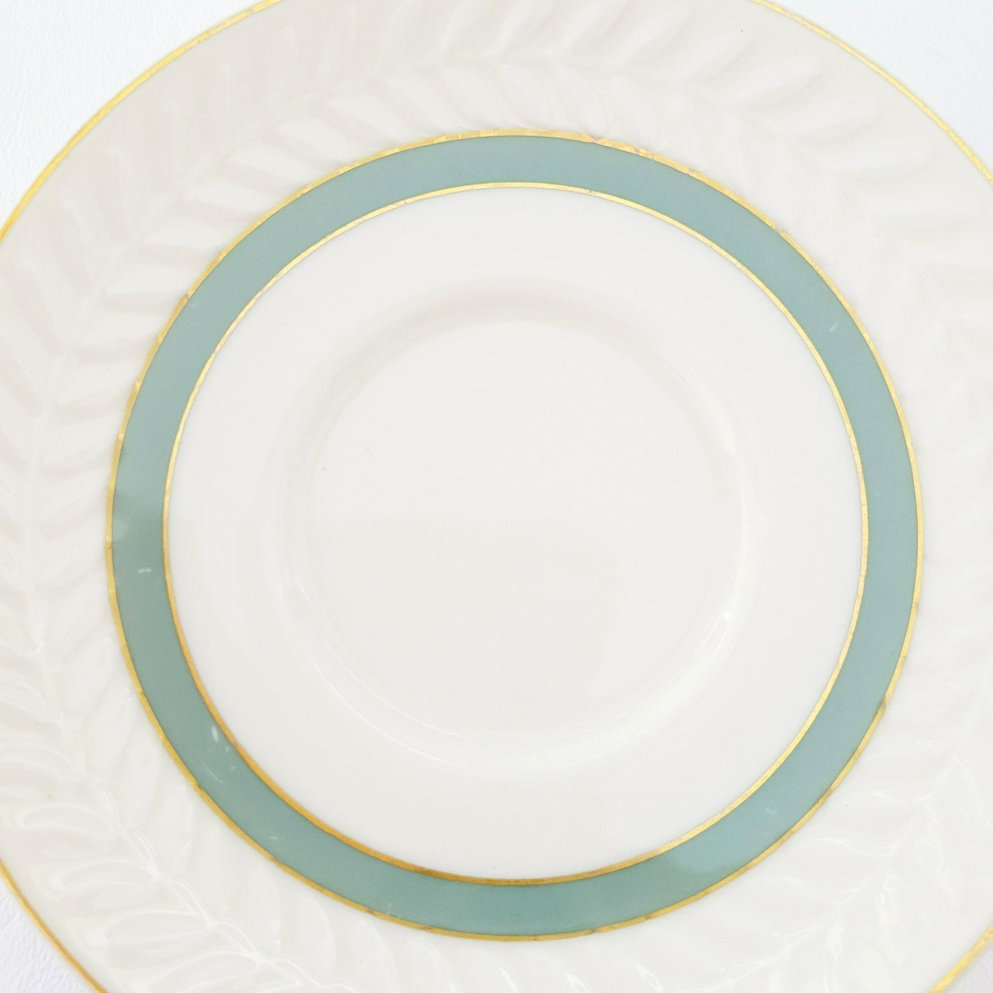 This Theodore Haviland New York teacup and saucer set will add elegance to your tea time. Featuring the Brighton Turquoise pattern with gold trim, green band, and embossed leaf pattern. Made in USA from porcelain, these pieces are off-white, green, and gold.