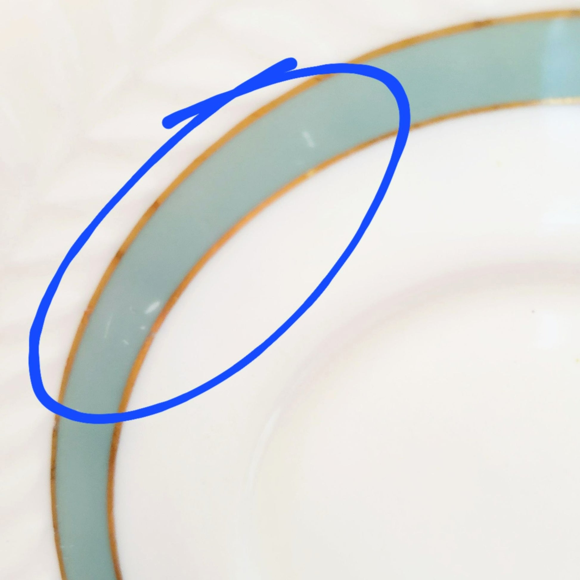 There are no cracks, chips or crazing. There is wear in the green trim on both cups and saucers (see pics).