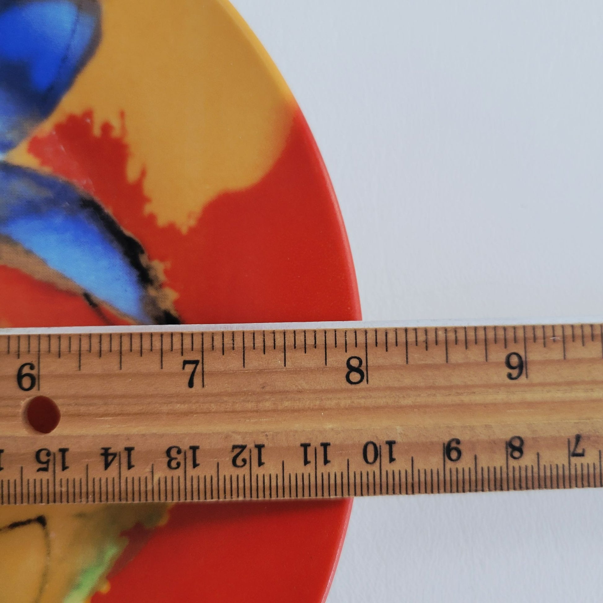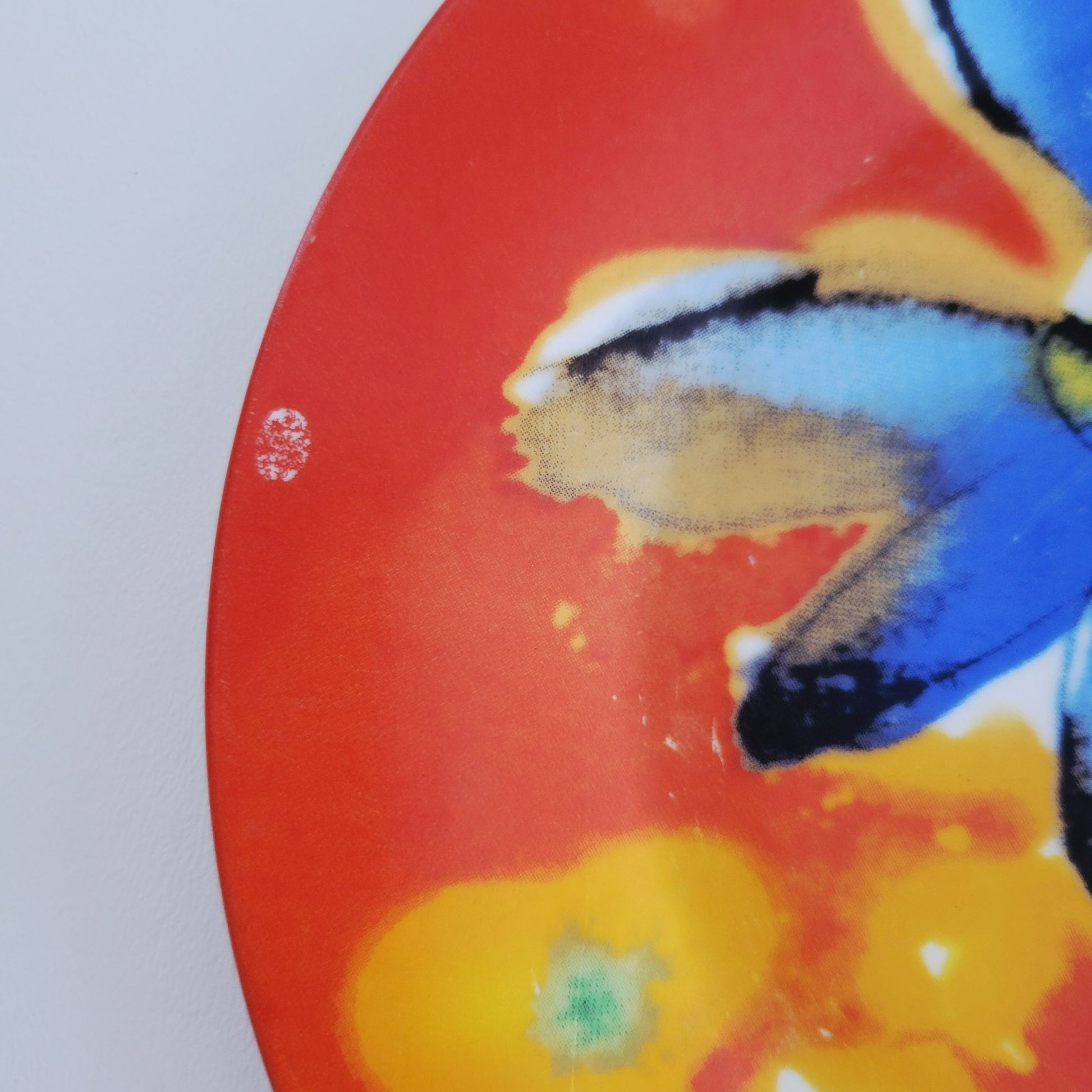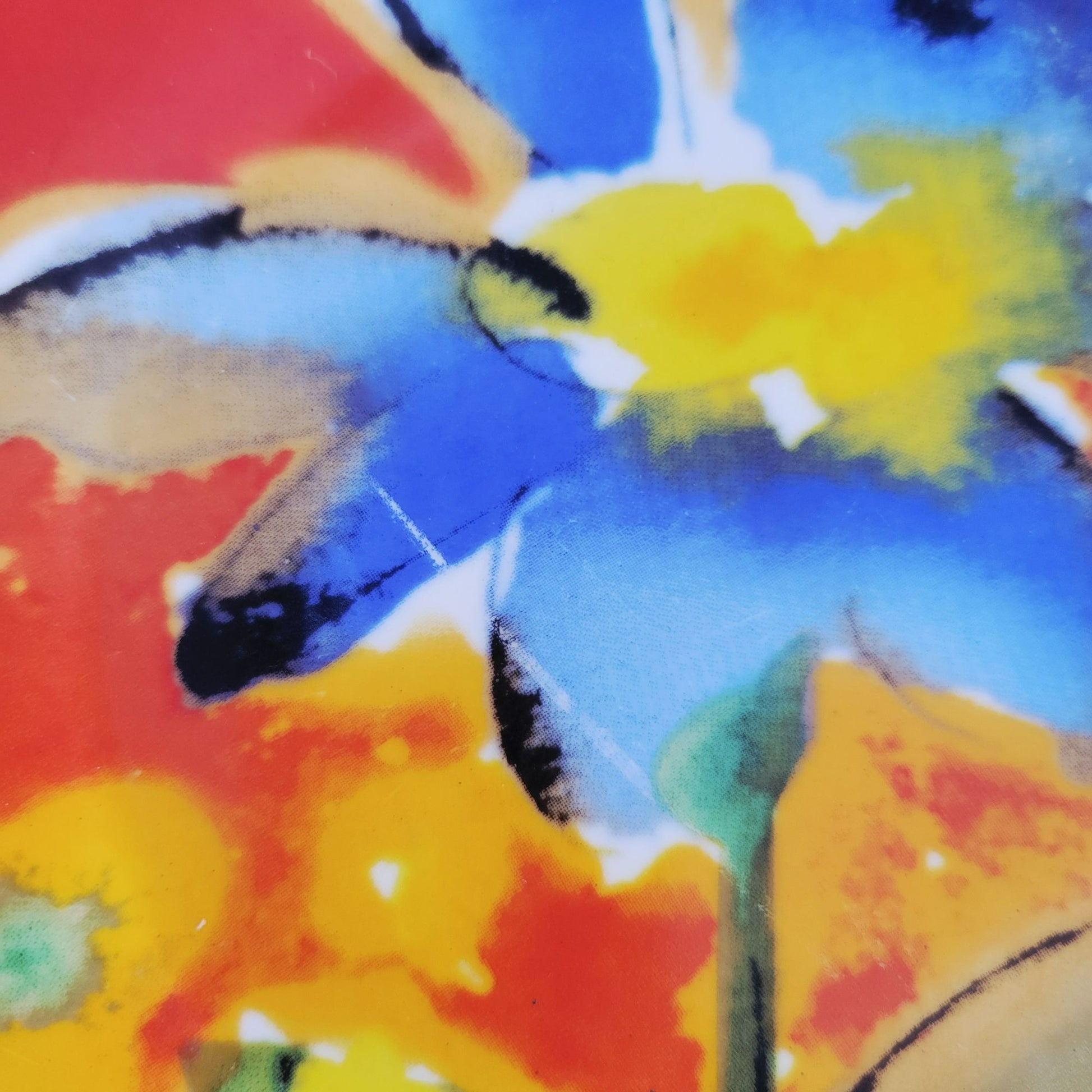 Artful ceramic plates showcase an expressive watercolor-style blue and yellow flower against a vivid red and orange background, offering dynamic wall decor or display piece.