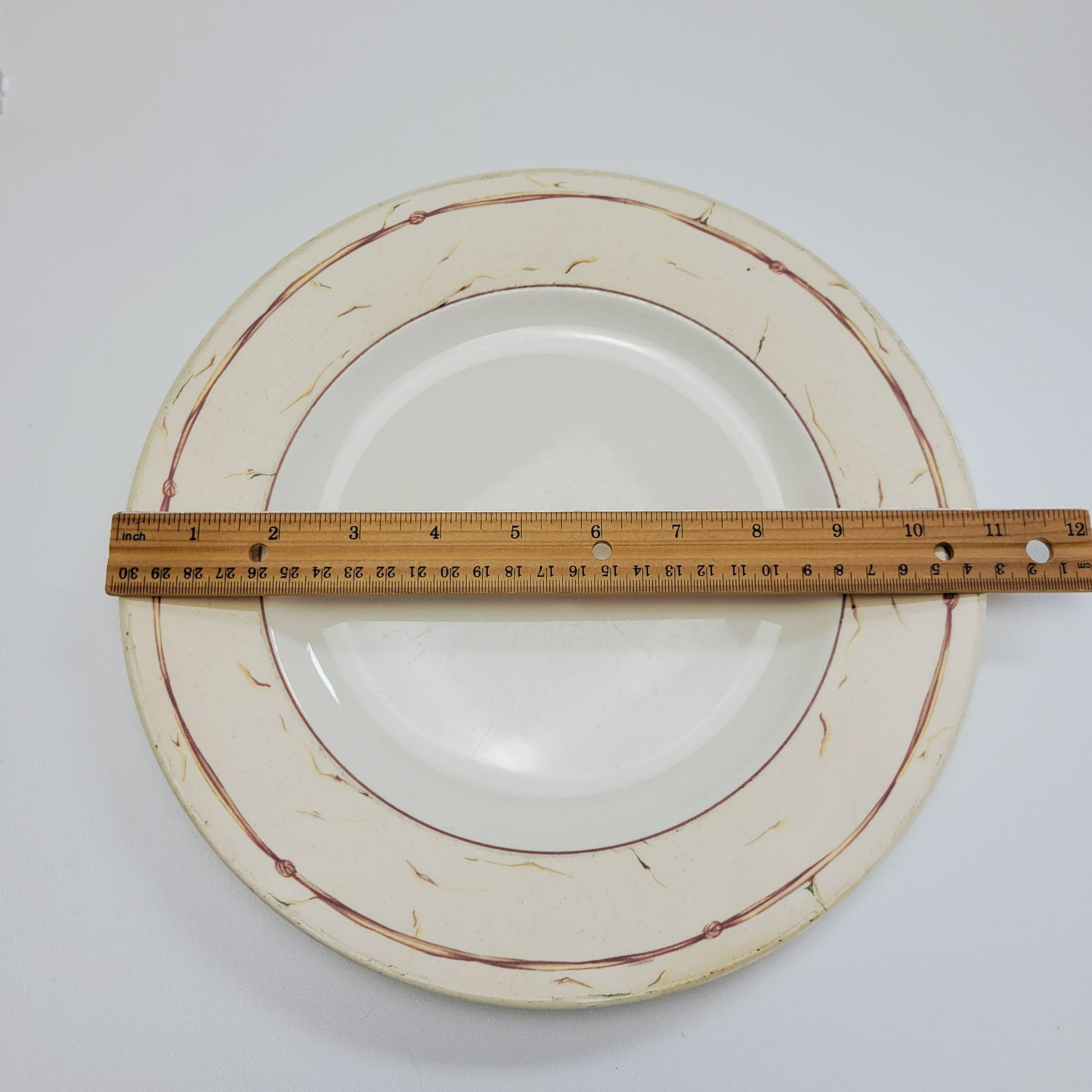 Vintage Wedgwood Amway knotted raffia dinner plates, set of 2, featuring a maroon rope design on a beige rim. Crafted in England, circa 1998, ideal for replacing discontinued china sets or adding a touch of elegance to your dining experience.