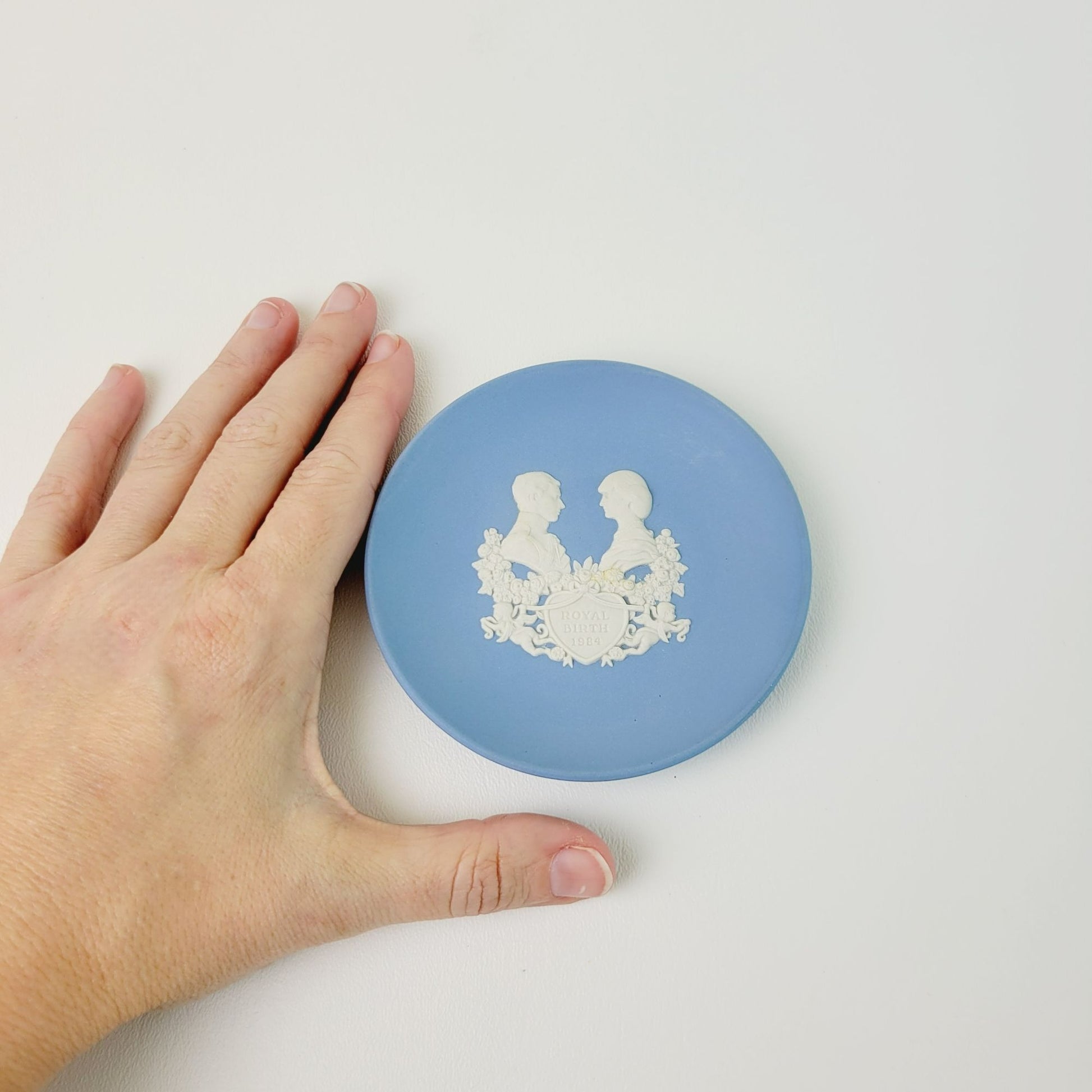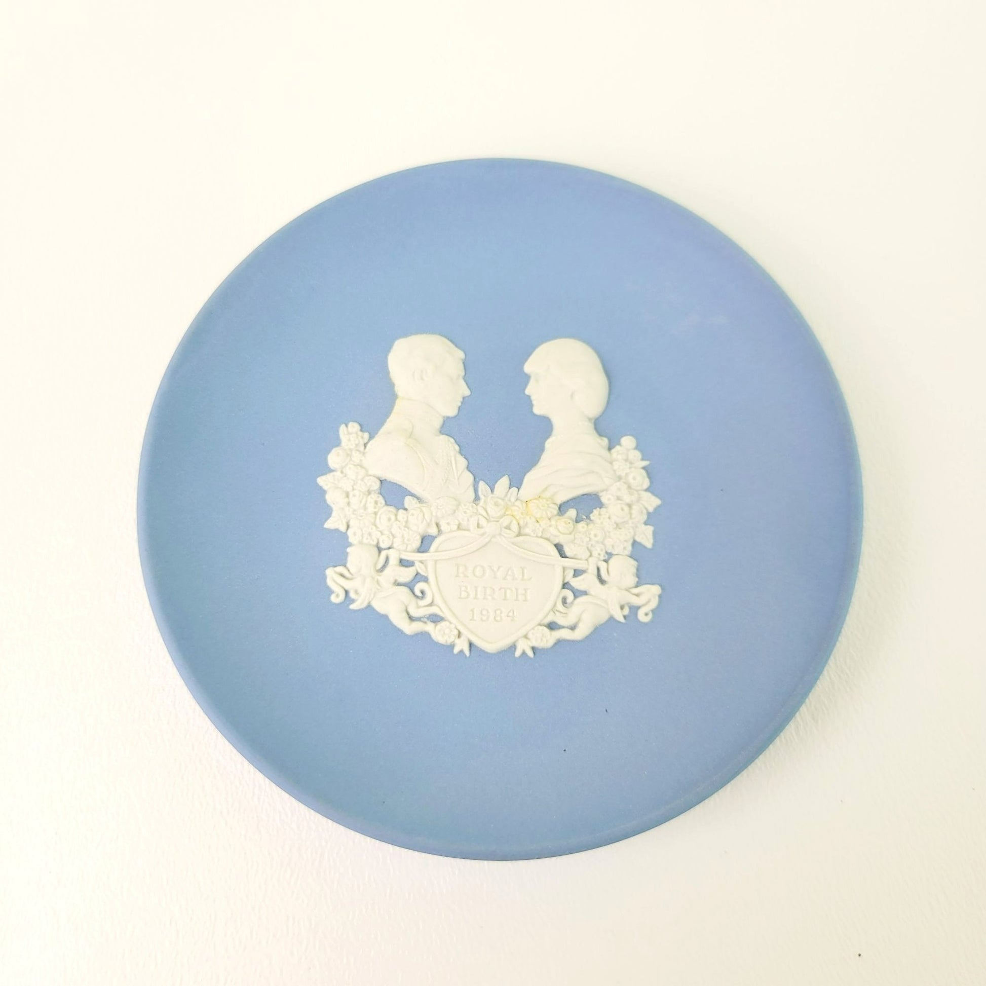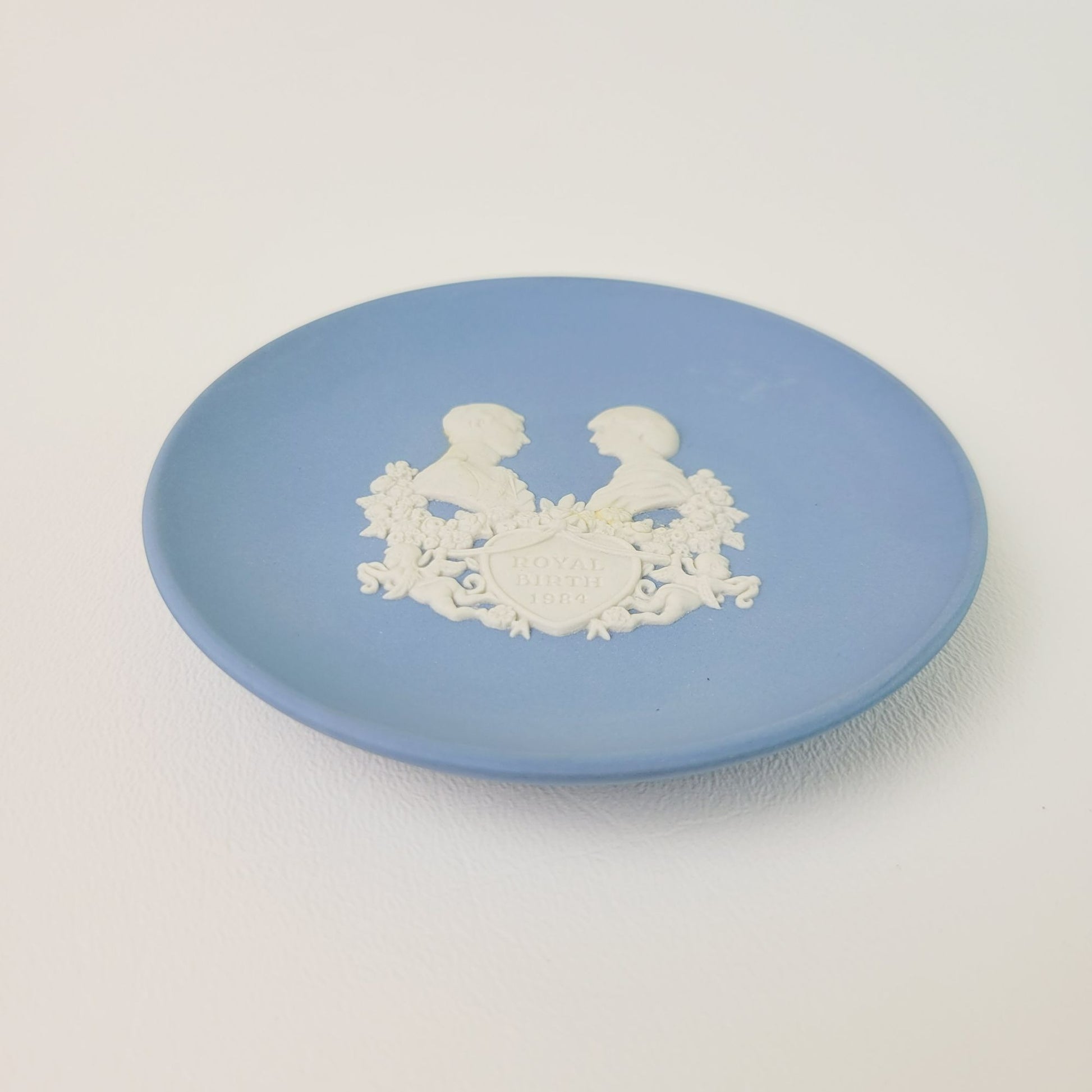 This Wedgwood Blue Jasperware Miniature Royalty Giftware Plate / Tray, Royal Birth 1984 in pale blue & Cream. Its 4 3/8" size is perfect for display. Made in England, it's a beautiful royal commemorative plate.