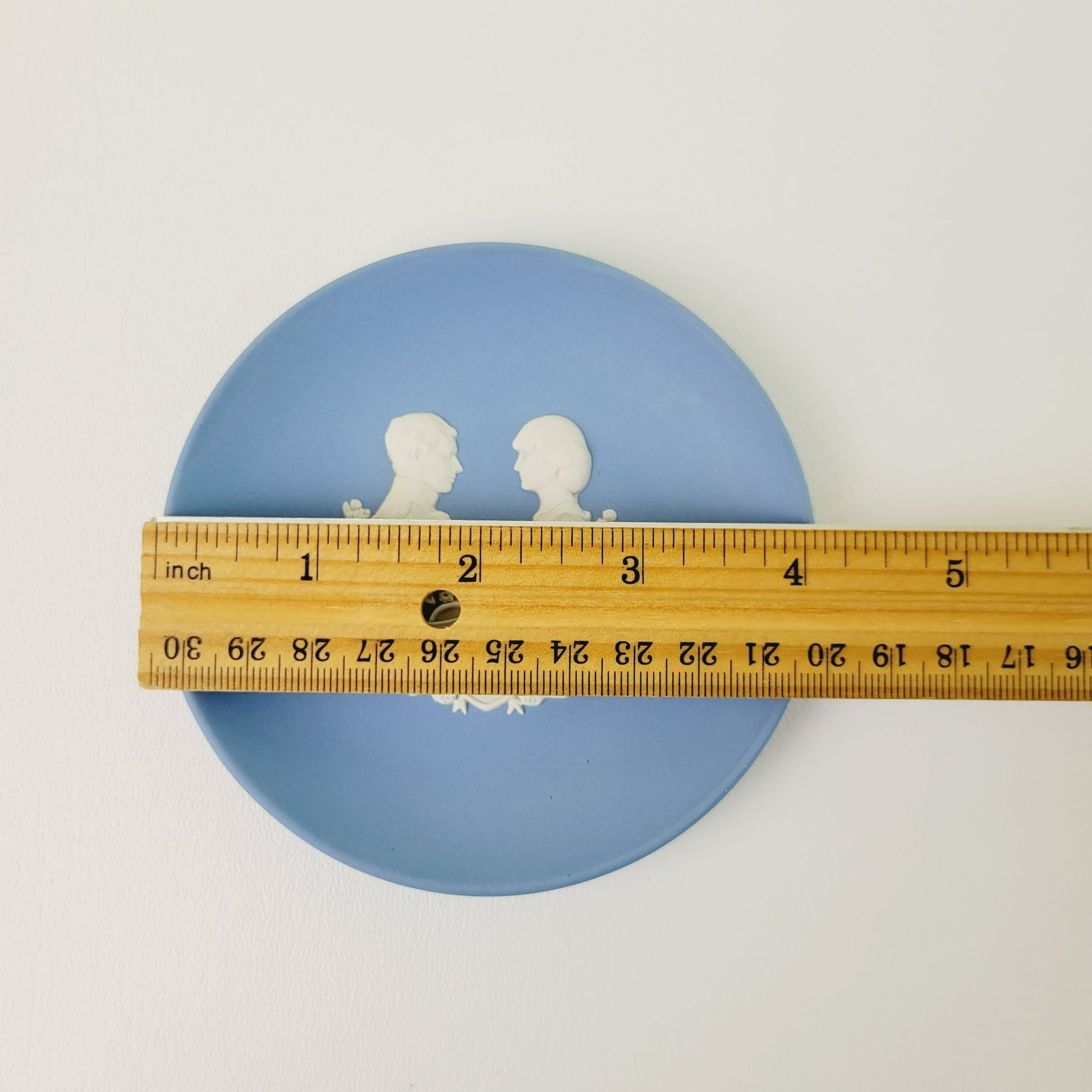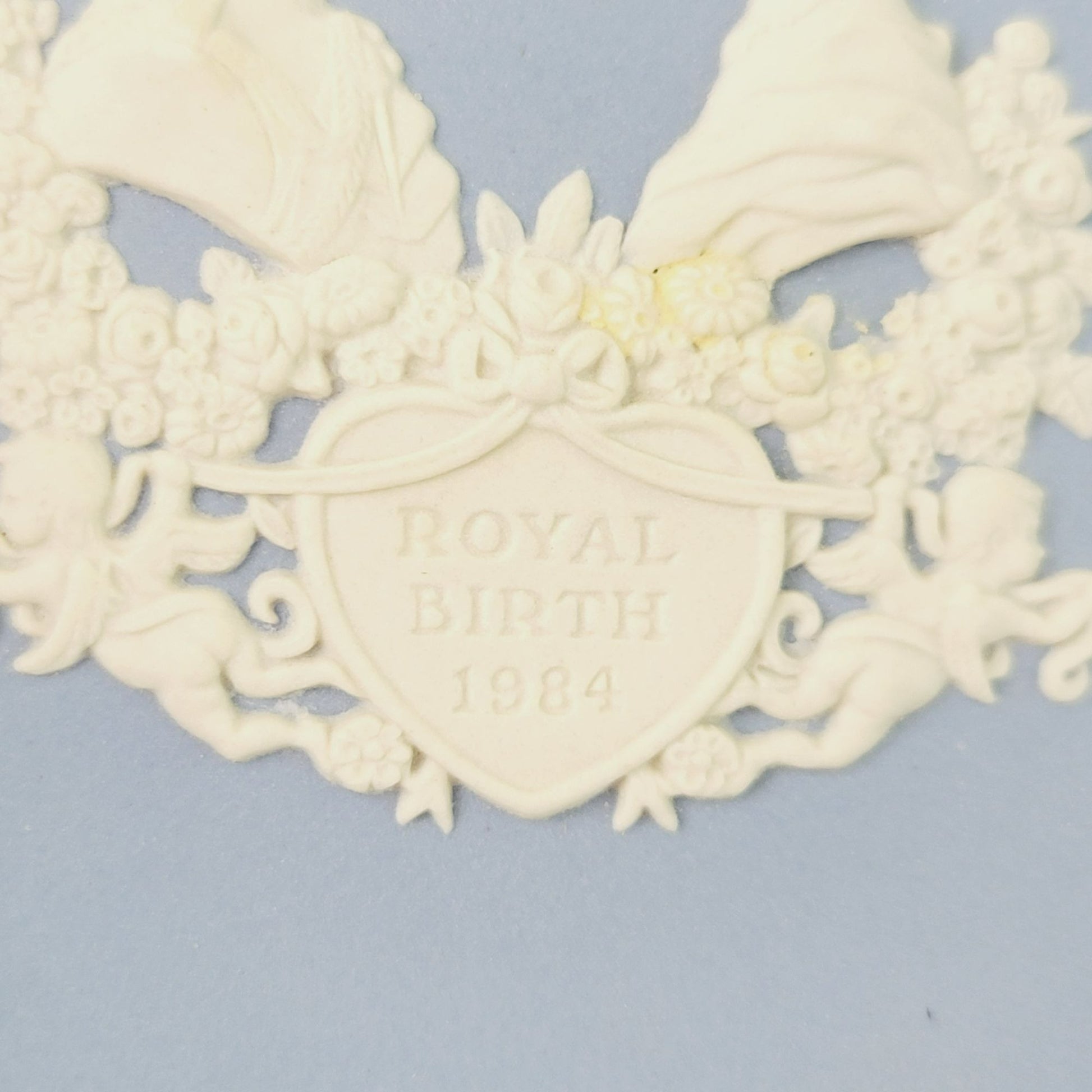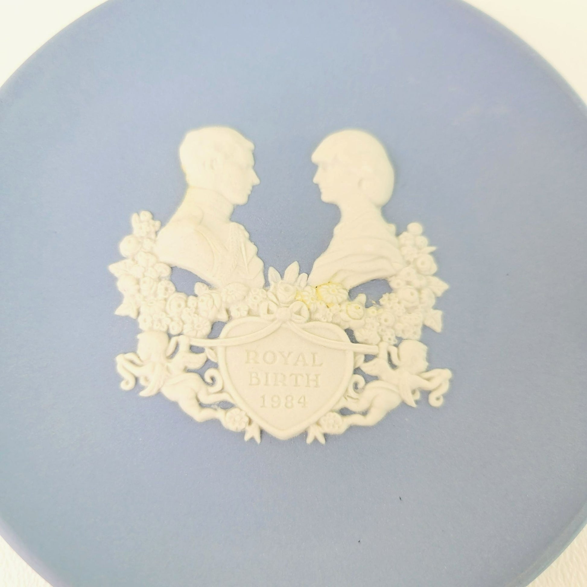 This Wedgwood Blue Jasperware Miniature Royalty Giftware Plate / Tray, Royal Birth 1984 in pale blue & Cream. Its 4 3/8" size is perfect for display. Made in England, it's a beautiful royal commemorative plate.