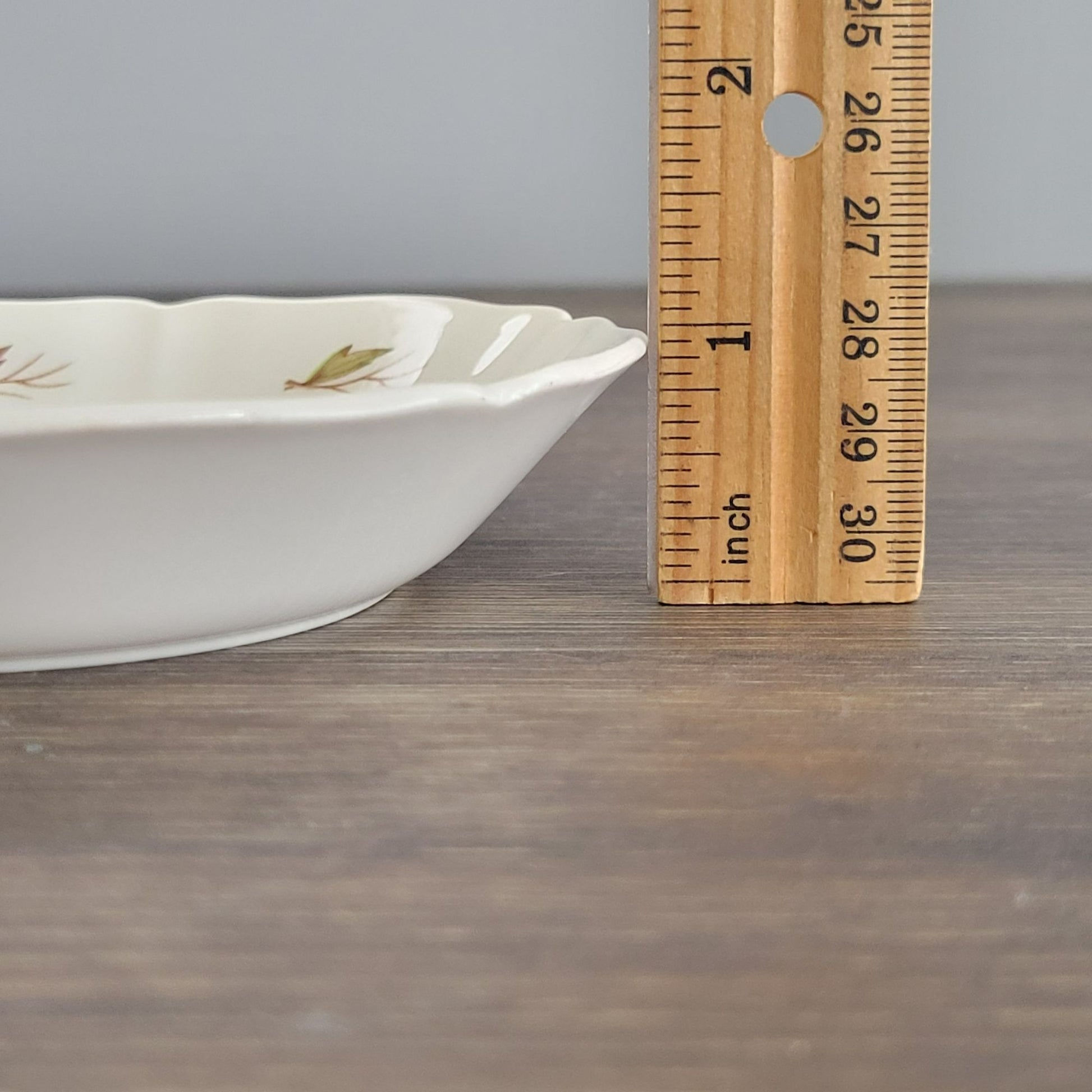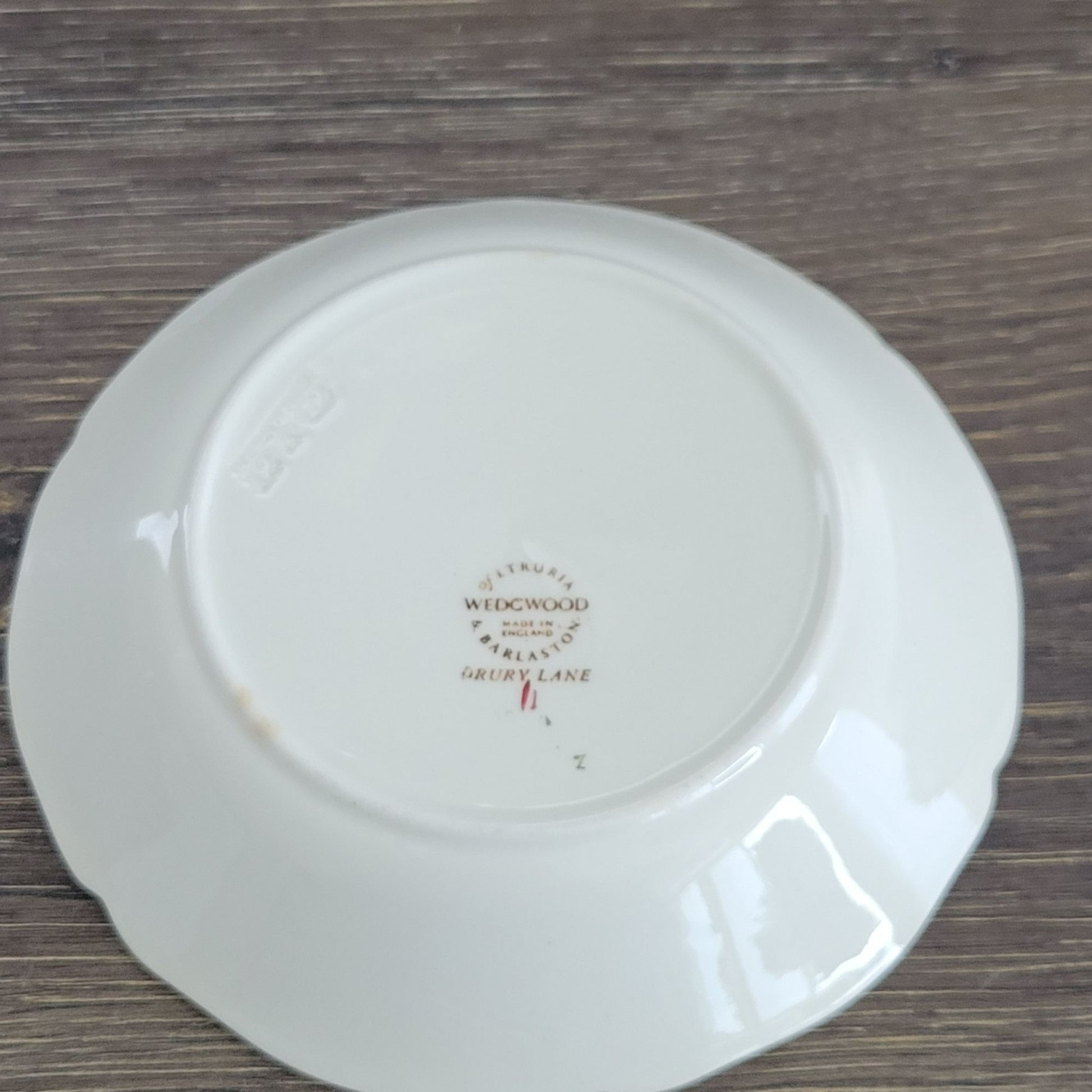 Vintage Wedgwood Drury Lane berry bowl set featuring lemon, pomegranates, and fruit leaf center design. Made in England between 1962-69, this elegant set is perfect for collectors or as a charming addition to your dining decor.