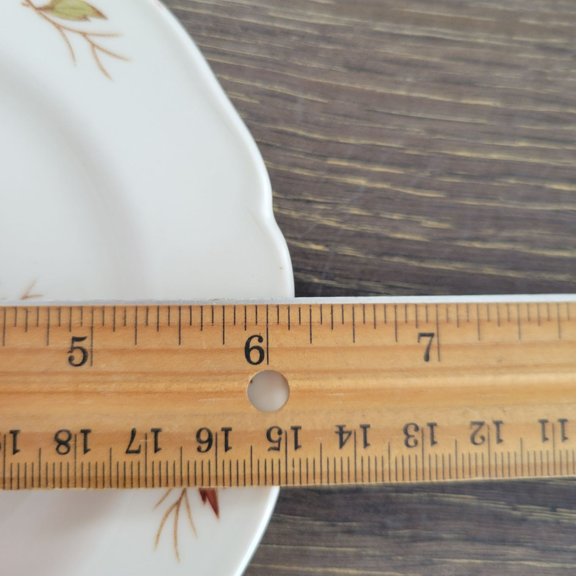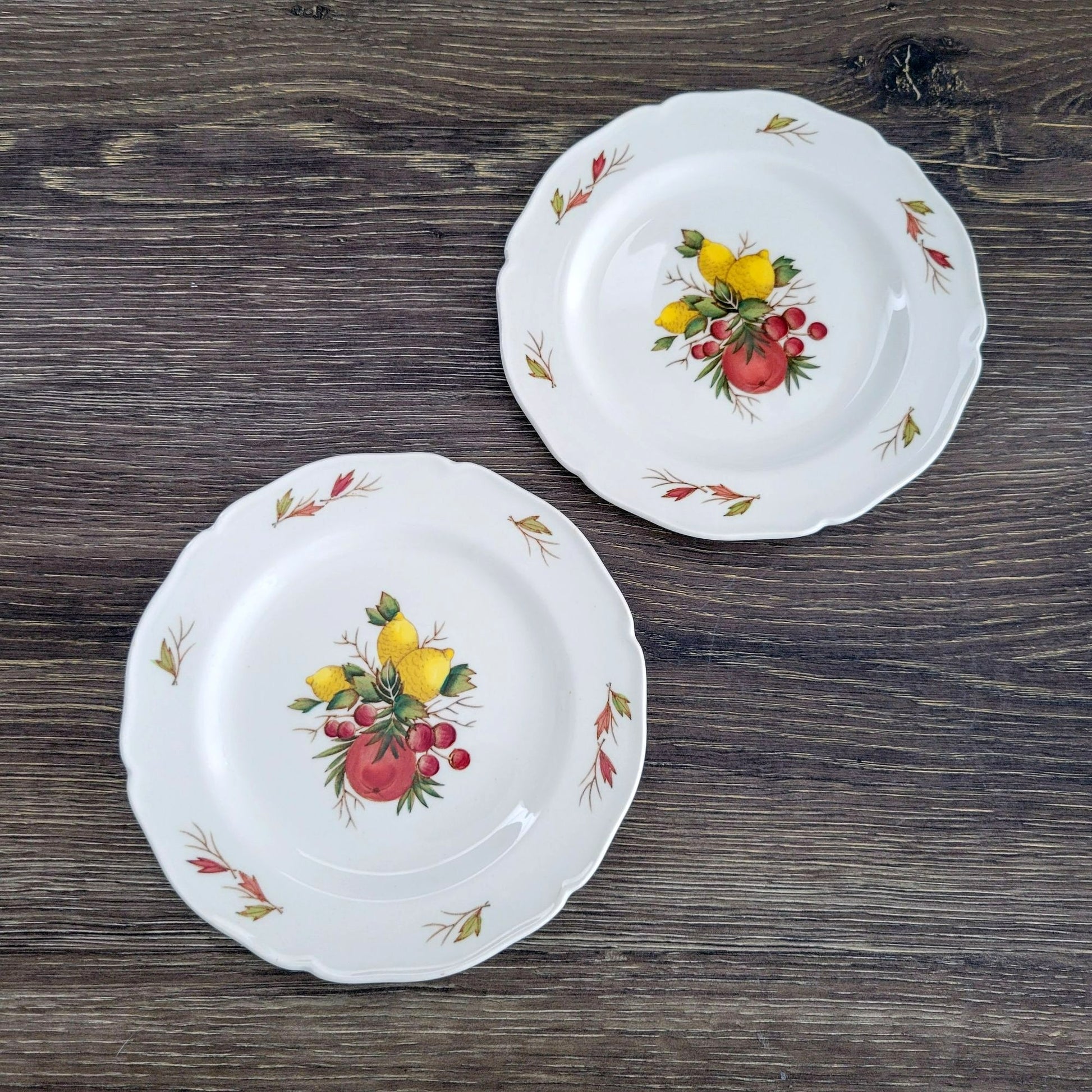 Elegant Wedgwood Drury Lane bread plate set featuring vibrant lemon pomegranates and fruit leaf center design. Crafted in England between 1962-1969, this vintage piece adds charm to any table setting.