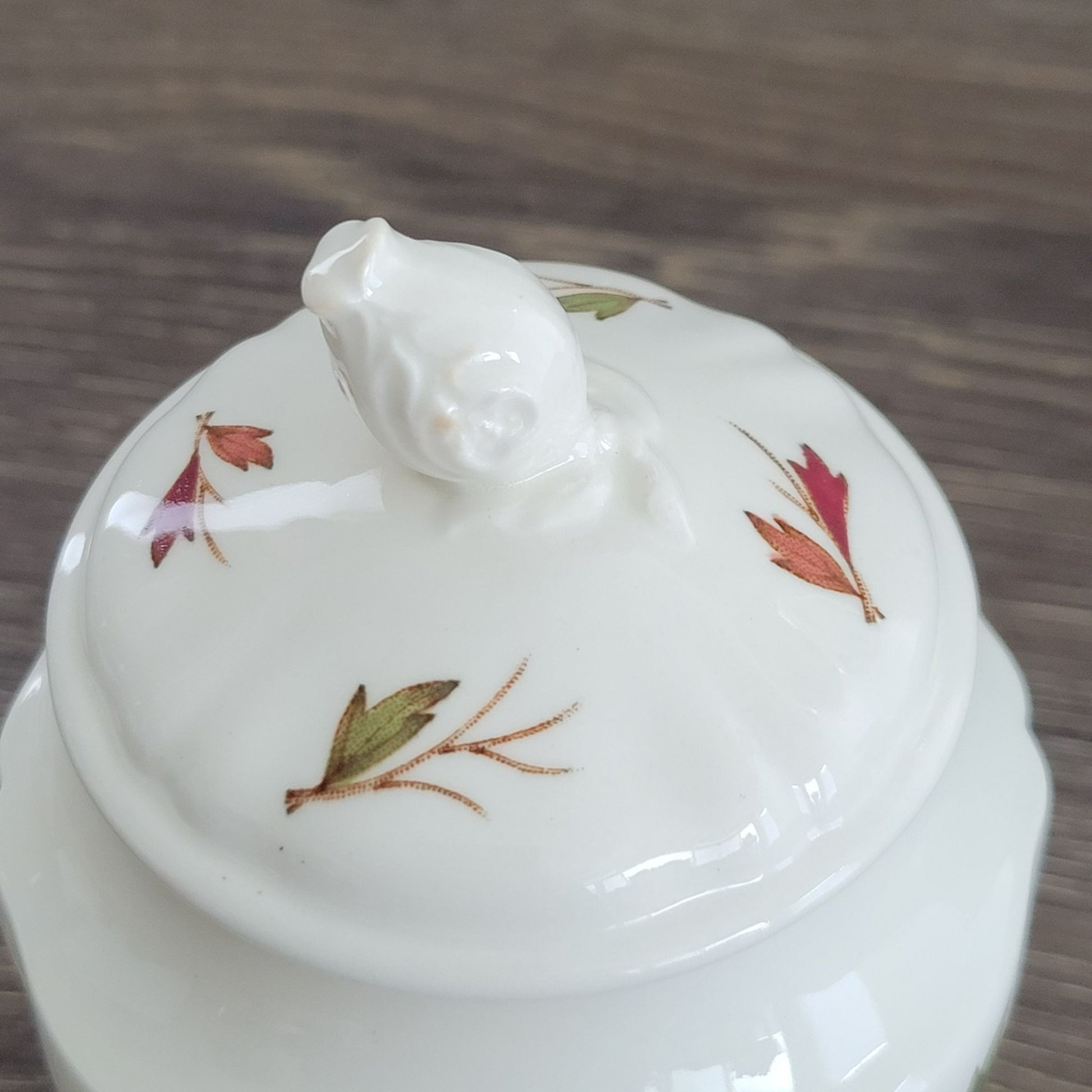 This Wedgwood Drury Lane creamer and sugar bowl set from 1962-69 features a charming lemon and pomegranate fruit leaf design. Perfect for collectors or as a delightful addition to any table setting.