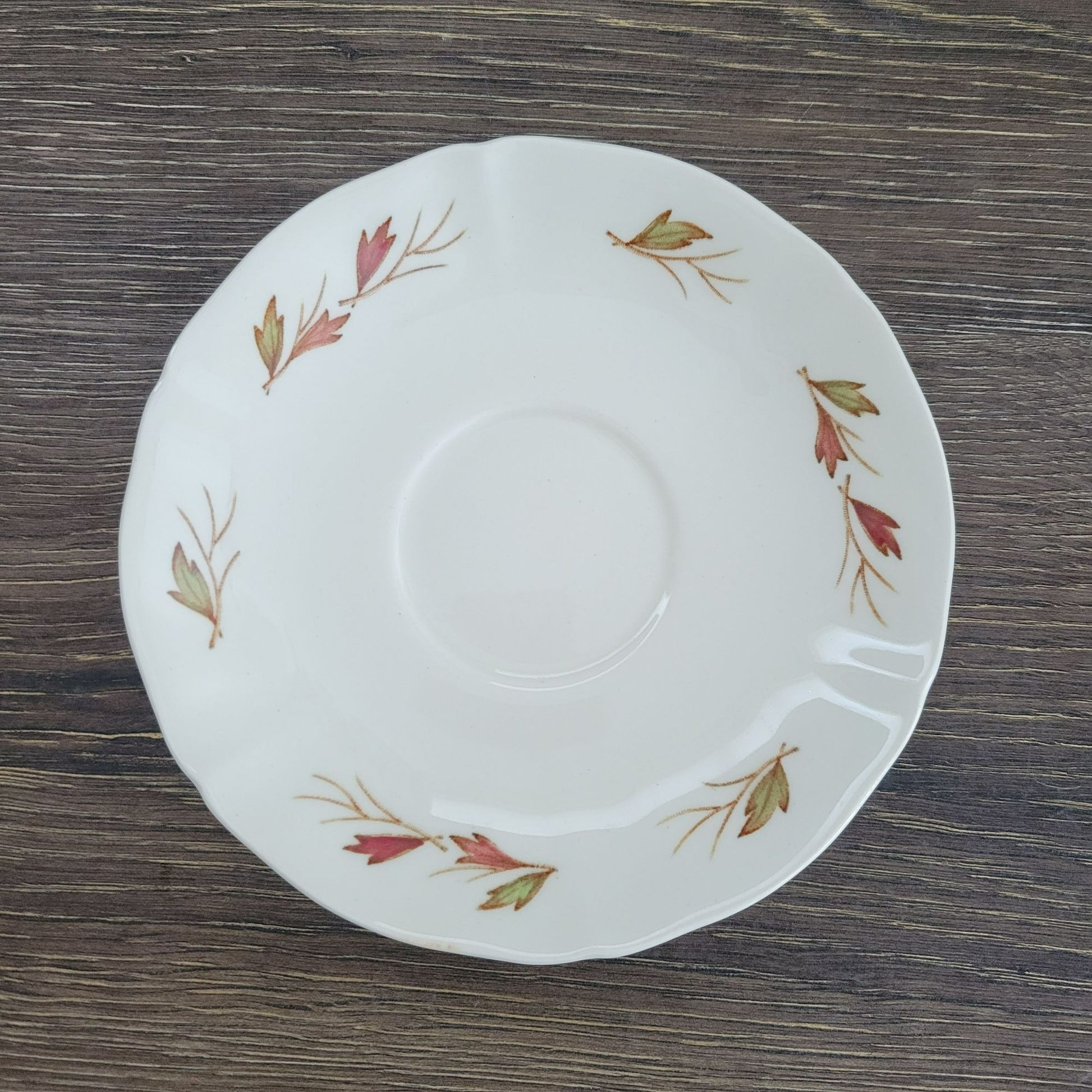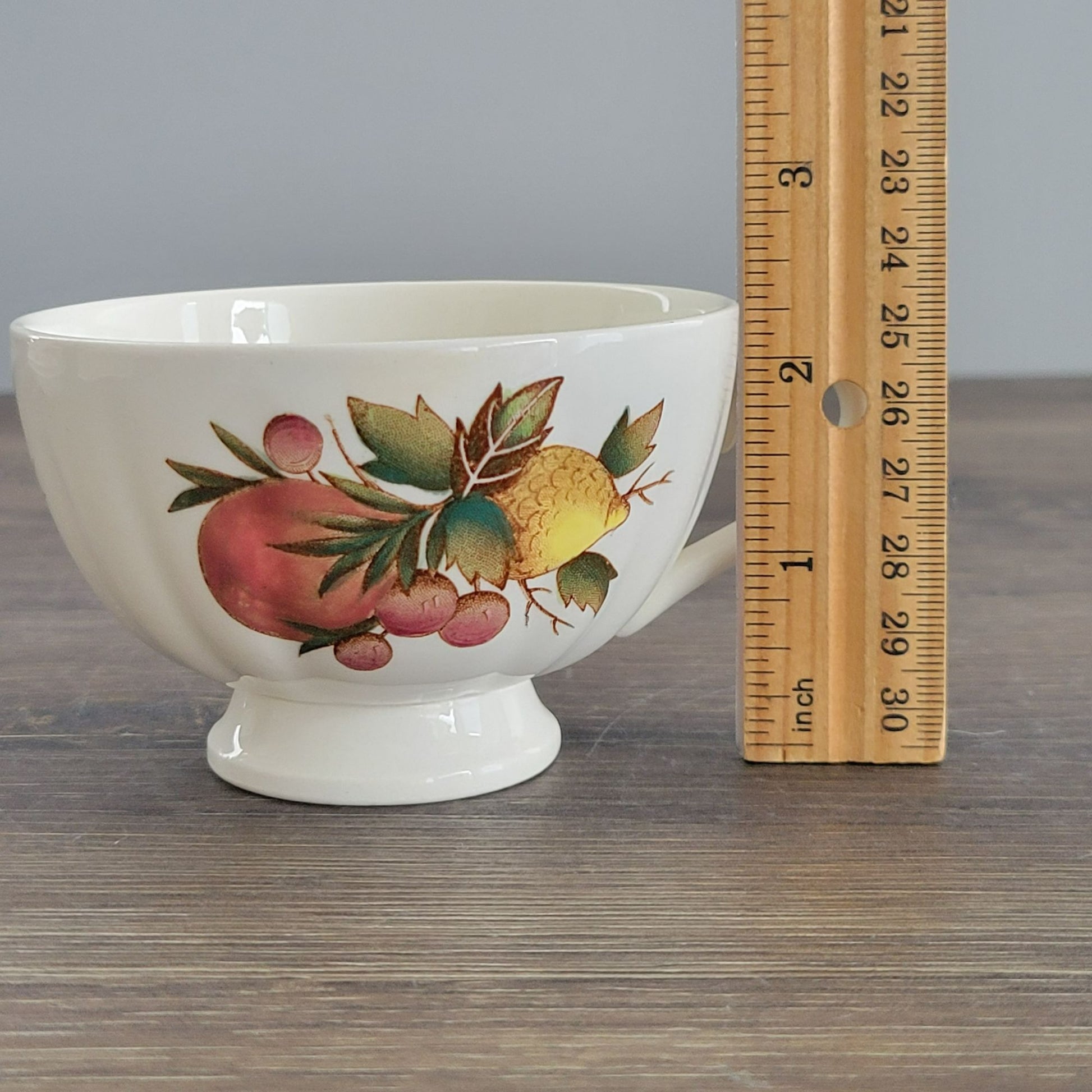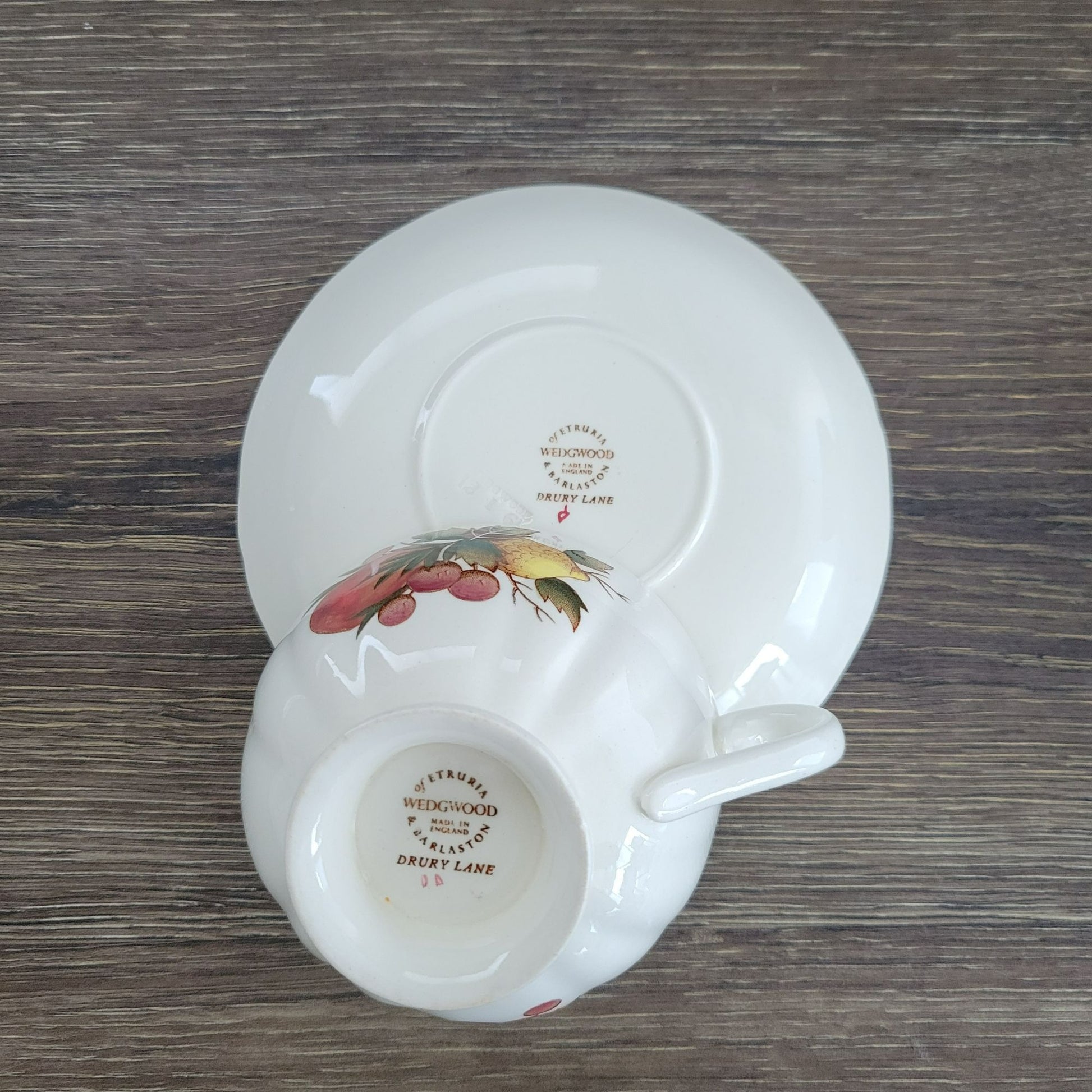 Vintage Wedgwood Drury Lane teacup and saucer set features a vibrant lemon pomegranates fruit leaf center design. Crafted in England between 1962-69, these elegant pieces are perfect for collectors or tea enthusiasts seeking classic charm and sophistication.