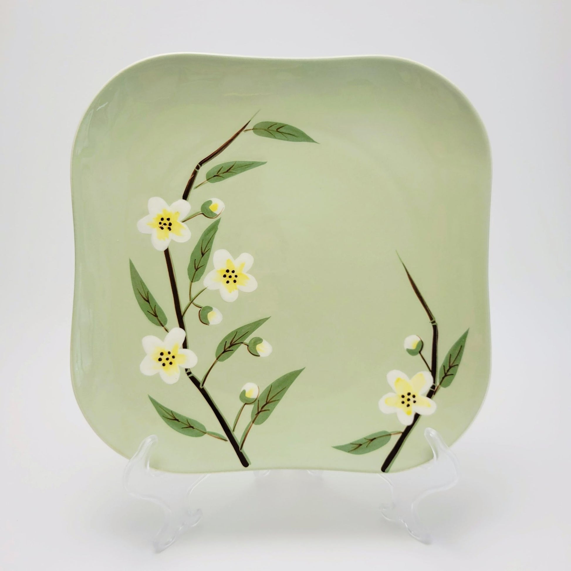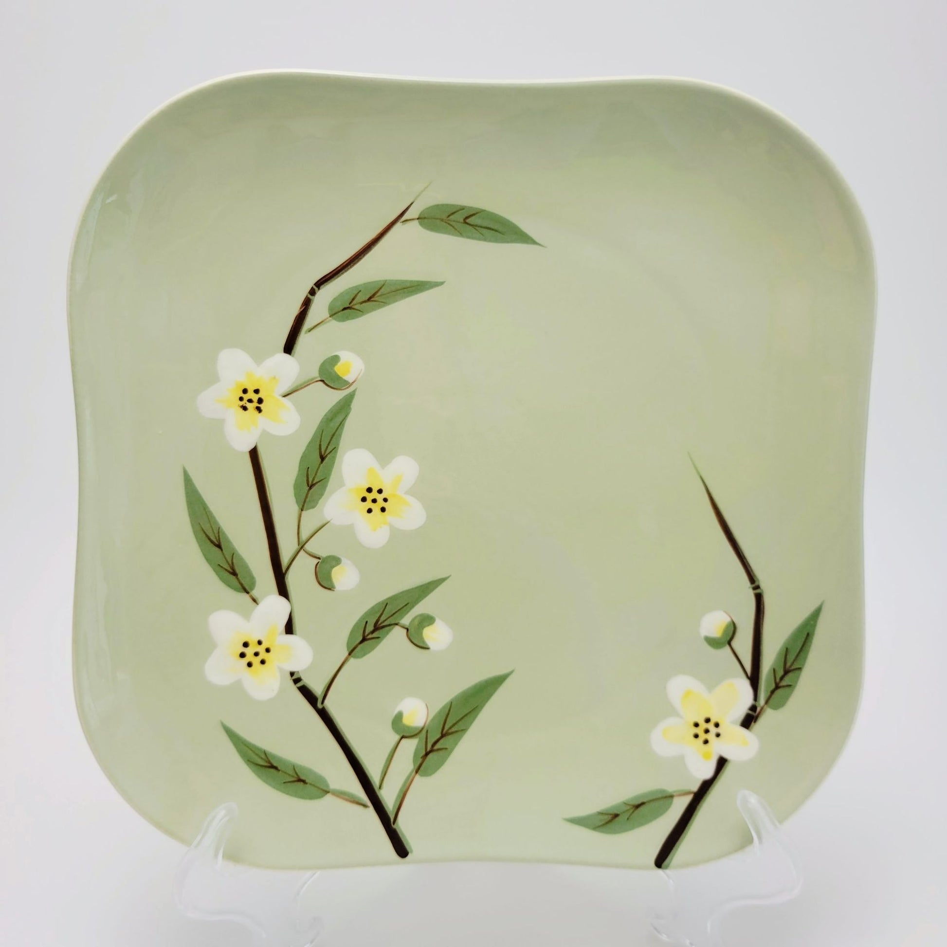 This vintage Weil Ware Blossom Celadon square dinner plate features a light green base with white and yellow flowers. USA made, dating from 1946-55, perfect for mid-century modern collectors.
