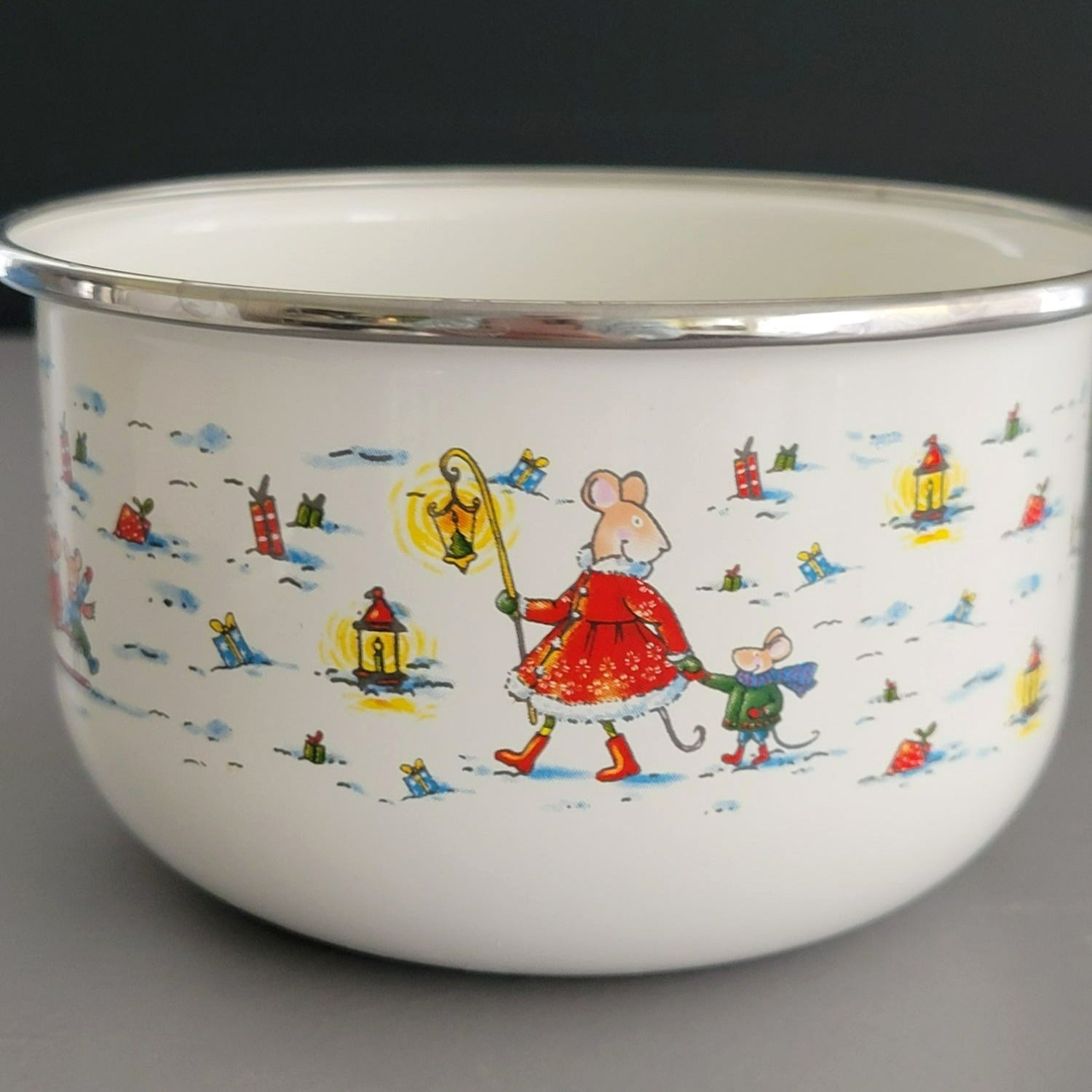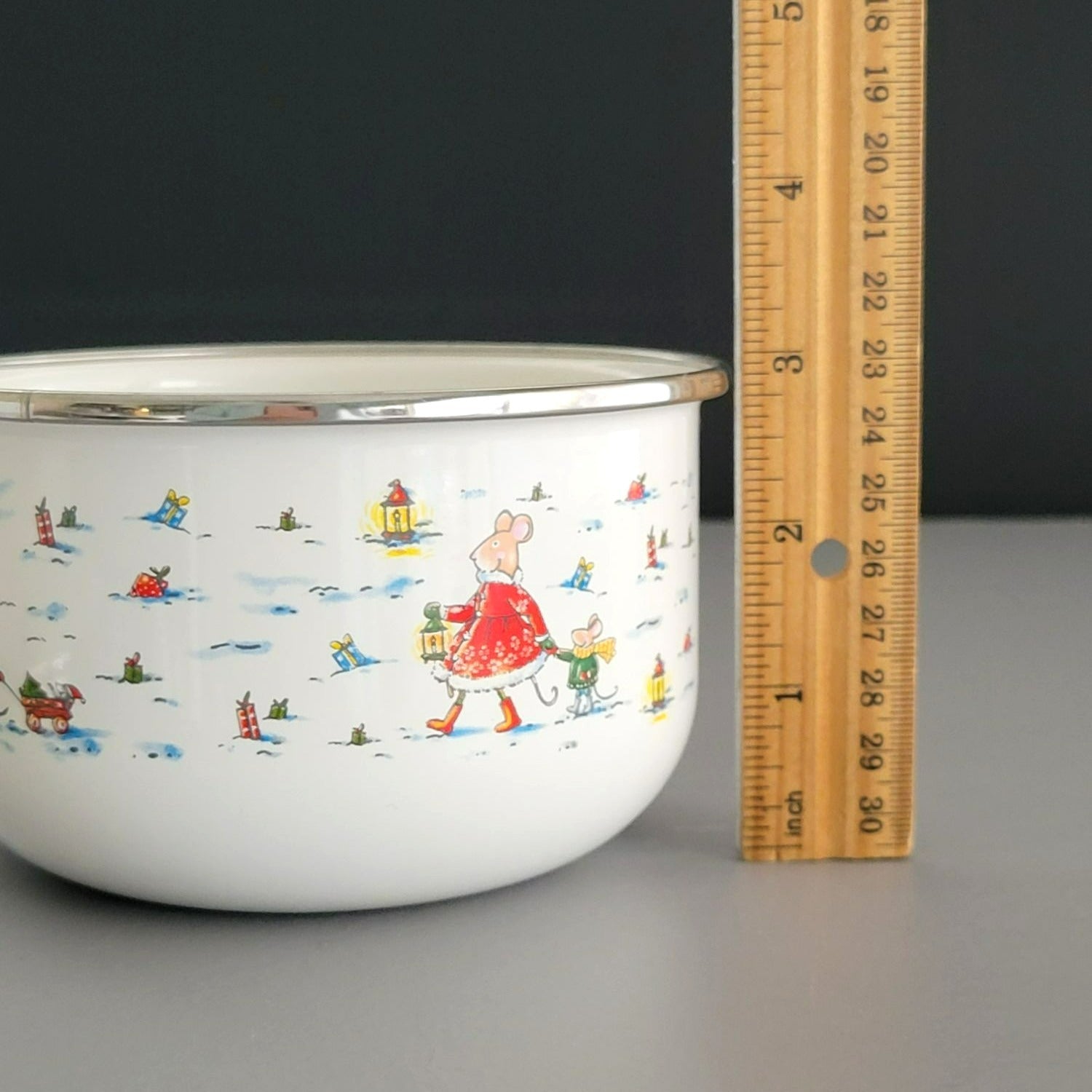 Add festive charm to your holiday table with this adorable World Market Christmas Mouse enamel plate and bowl set. Featuring two salad plates and one all-purpose bowl, this discontinued set showcases a cute mouse family design. Perfect for collectors and holiday enthusiasts.